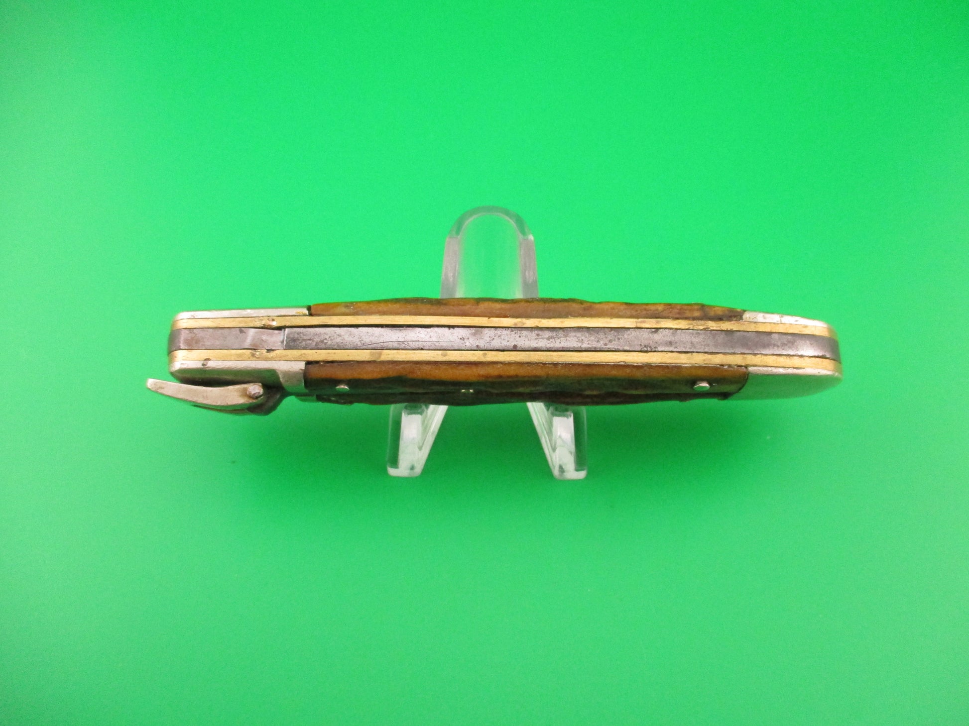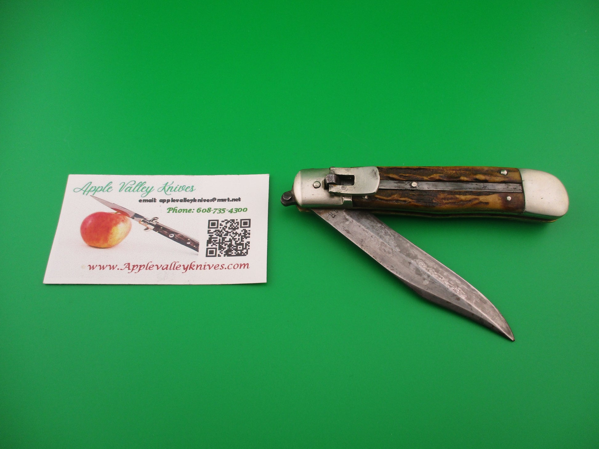 Vintage Ka-bar lever knife with stag handles made by the Union Cutlery Co of Olean, NY most likely mid 1930s and was designated the model 21105. The knife measures 4.5 inches closed and 7 15/16 inches open and has thick brass liners with nickel silver bolsters, lever & pins. The blade is 97% full or better with nice even patina, light scratches and spotting and the tang is stamped KA-BAR on the front and UNION CUT CO OLEAN NY on the rear. The stag scales are in nice condition with no cracks or chips. The knife works great with the blade tip seating deep, strong snap and tight lockup open! This is a transitional knife with smooth rectangular lever made between the older Teardrop lever knives and the newer rectangular lever with lines (grooves) that give better control when opening the knife. The older teardrop levers were wider and accommodated the thumb when opening, but when they changed to a smaller rectangular smooth lever customers had some trouble with thumbs slipping a bit when opening so they added the grooves later for better control. It works fine, but I can see how the grooved levers give better control. Interesting and very nice old Kabar switchblade. 100% money back guarantee including return shipping if not completely satisfied with this knife. VG+ condition.