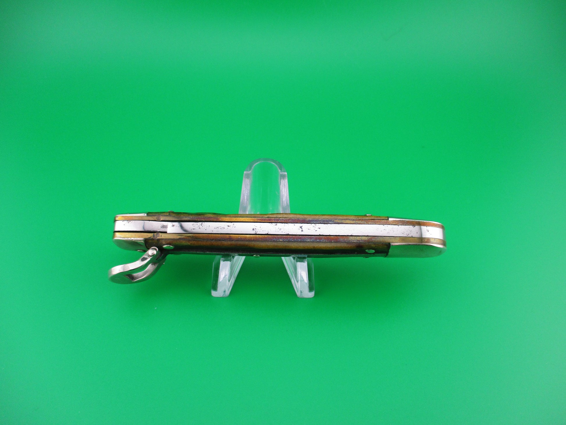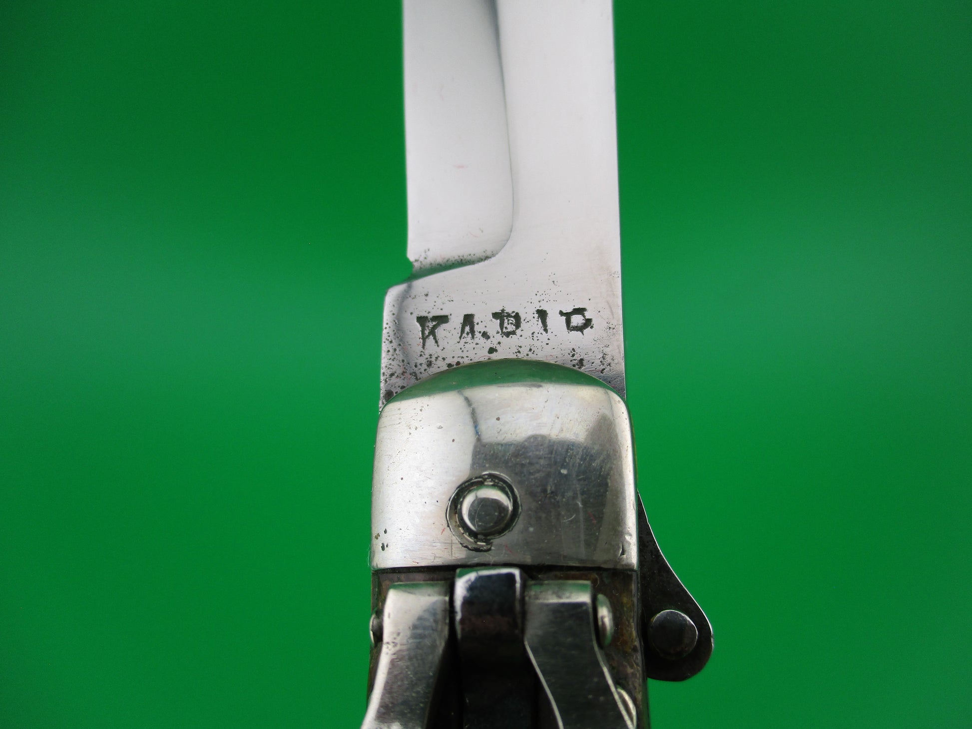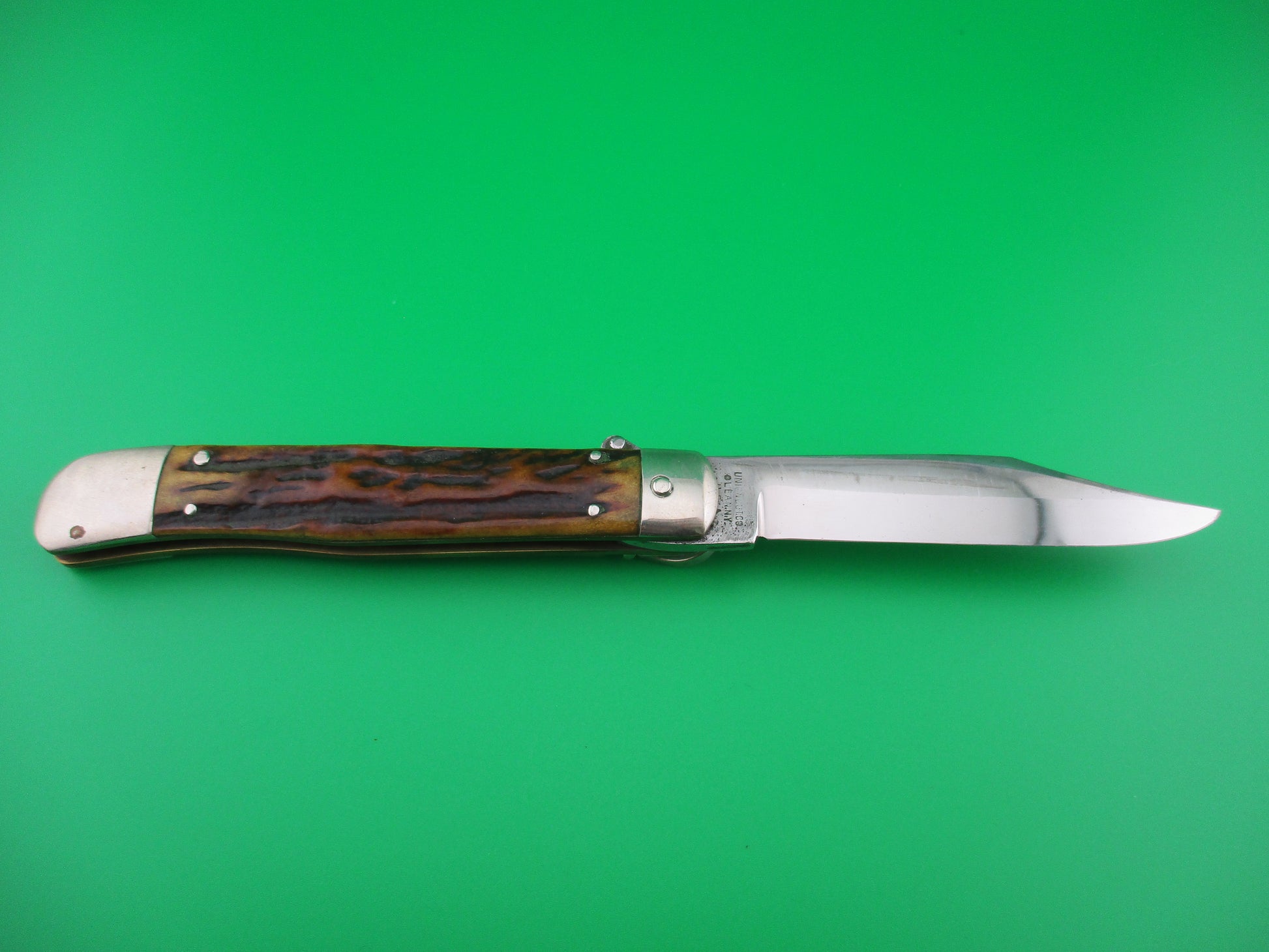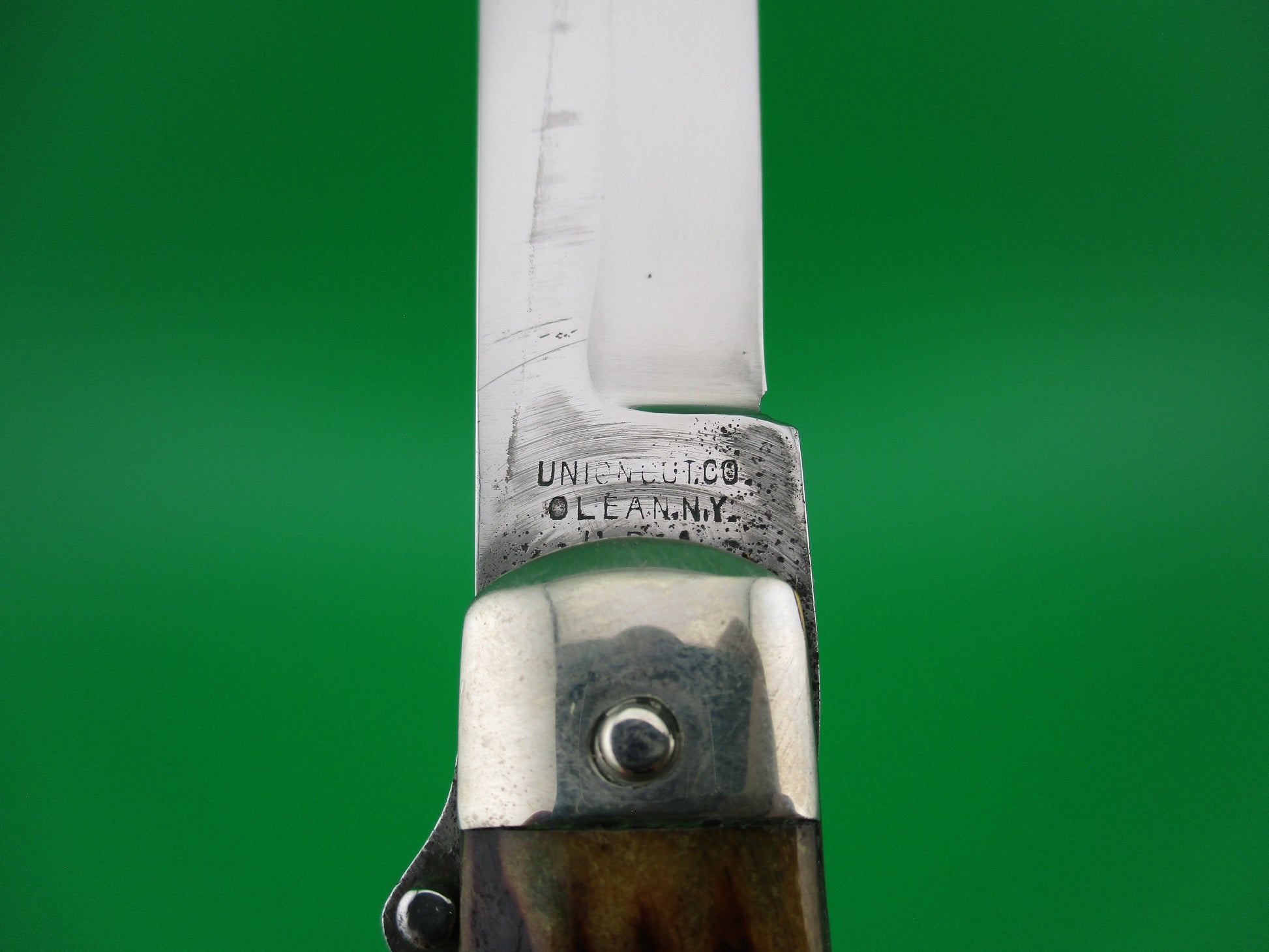 Vintage KABAR 21105 Teardrop Lever Stag automatic knife This knife was made by the Union Cutlery Co of Olean, NY most likely between 1920s and early 40s. It was designated the model 21105 and it measures 4.5 inches closed and just under 8 inches open and has thick brass liners. The bolsters and lever are made of nickel silver. The saber grind blade is mostly full and shiny and appears to have been professionally cleaned. The tang is marked KA-BAR on the front though a little hard to read because the tang has pitting and was cleaned. Clearly stamped UNION CUT CO OLEAN NY USA on the rear of the tang. The stag scales are in nice condition with no cracks or chips. The knife works great with the blade tip seating deep, strong snap and tight lockup open! This is may be a transitional knife made between the older Teardrop lever knives and the newer rectangular lever. The reason I say this is that the lever is slightly different than most of the early Kabar teardrop levers in that the cutout is slightly different shape. It is also possible that the lever has been replaced so I'm pricing it according to that assumption, which will make it a Great deal if it really is a transitional change! ;^) Interesting and very nice old Kabar switchblade. EX- condition.