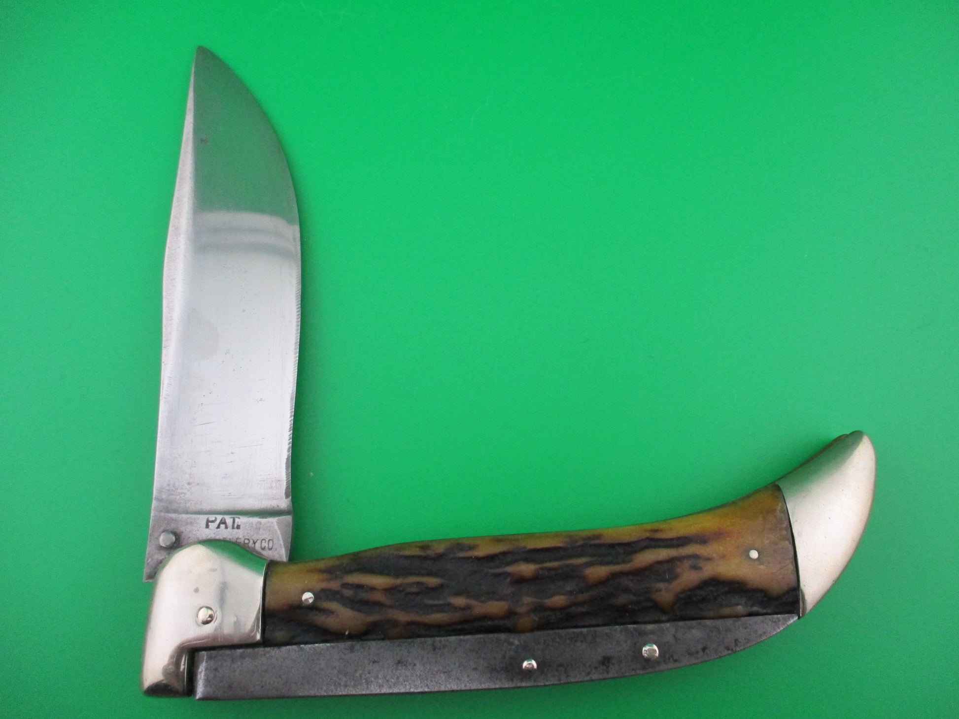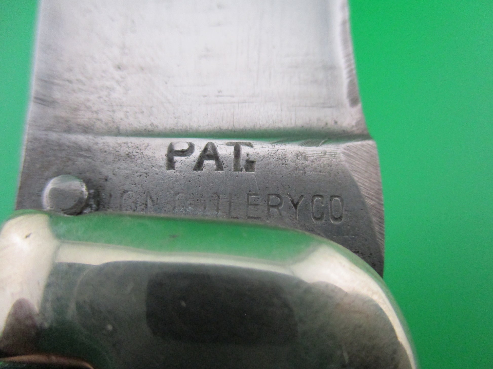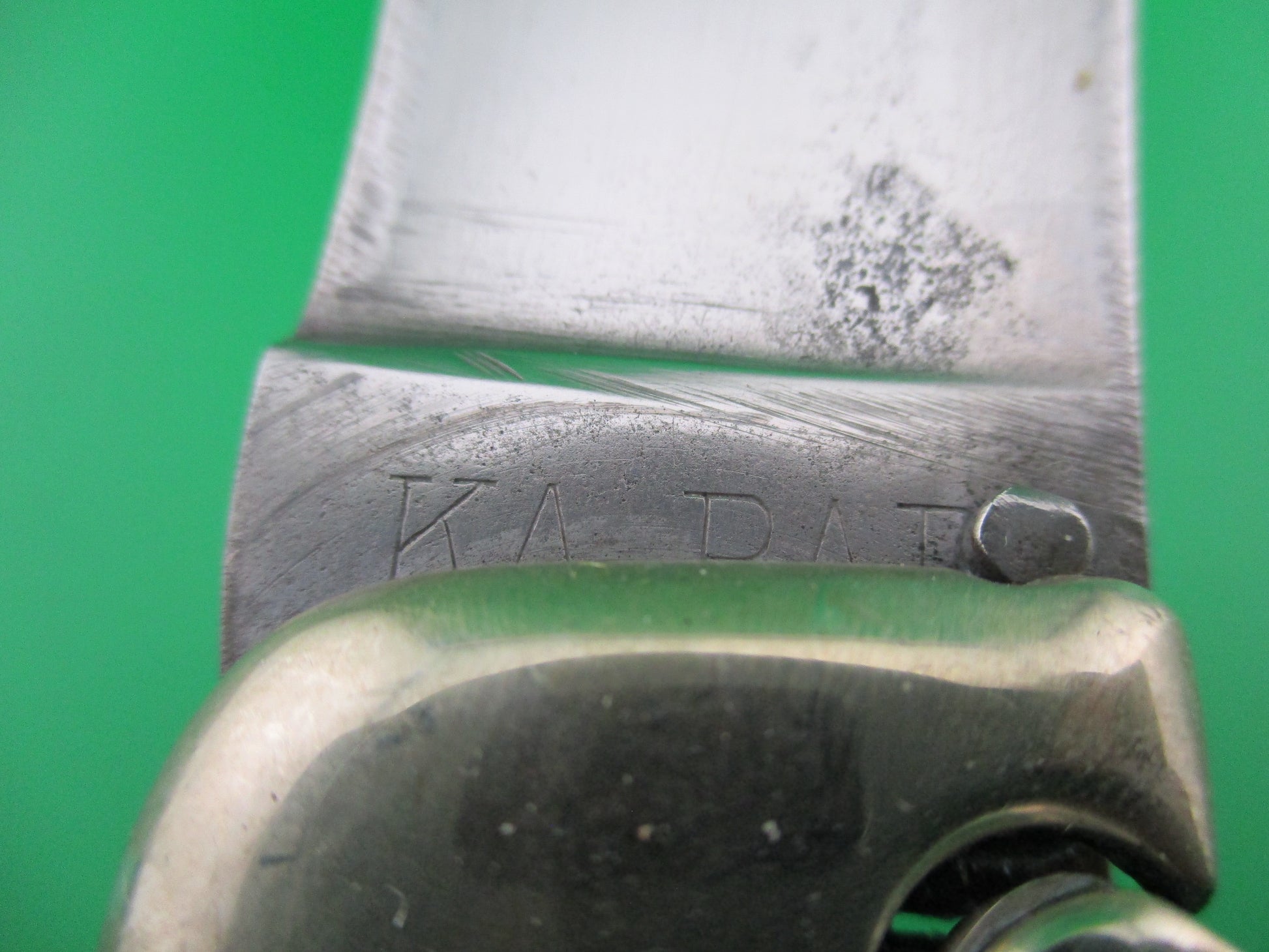 The blade is marked KABAR on the front and PAT. over Union Cutlery Co on the back of the tang. The blade is 96% full, or better and shiny. The knife functions great. Many of these end up with "tired" springs and don't open fully when the button is pressed, but this one still has a strong spring and opens fully when the button is pressed! The blade tip seats well when closed, good snap and better than average lockup when open. The stag scales are very attractive and in great condition with a couple of hairline cracks that won't hurt anything and most of these have. Here's your chance to own a legendary piece of American switchblade history! Overall EX condition.