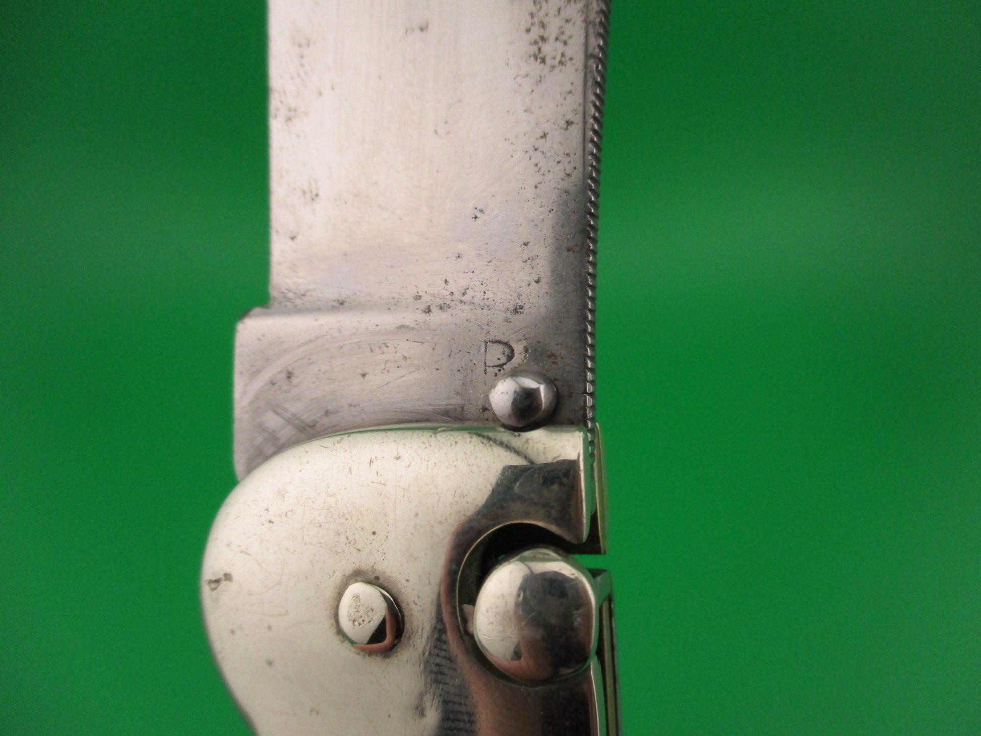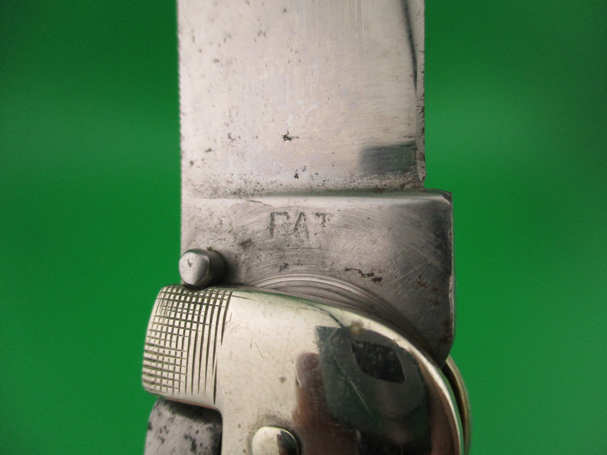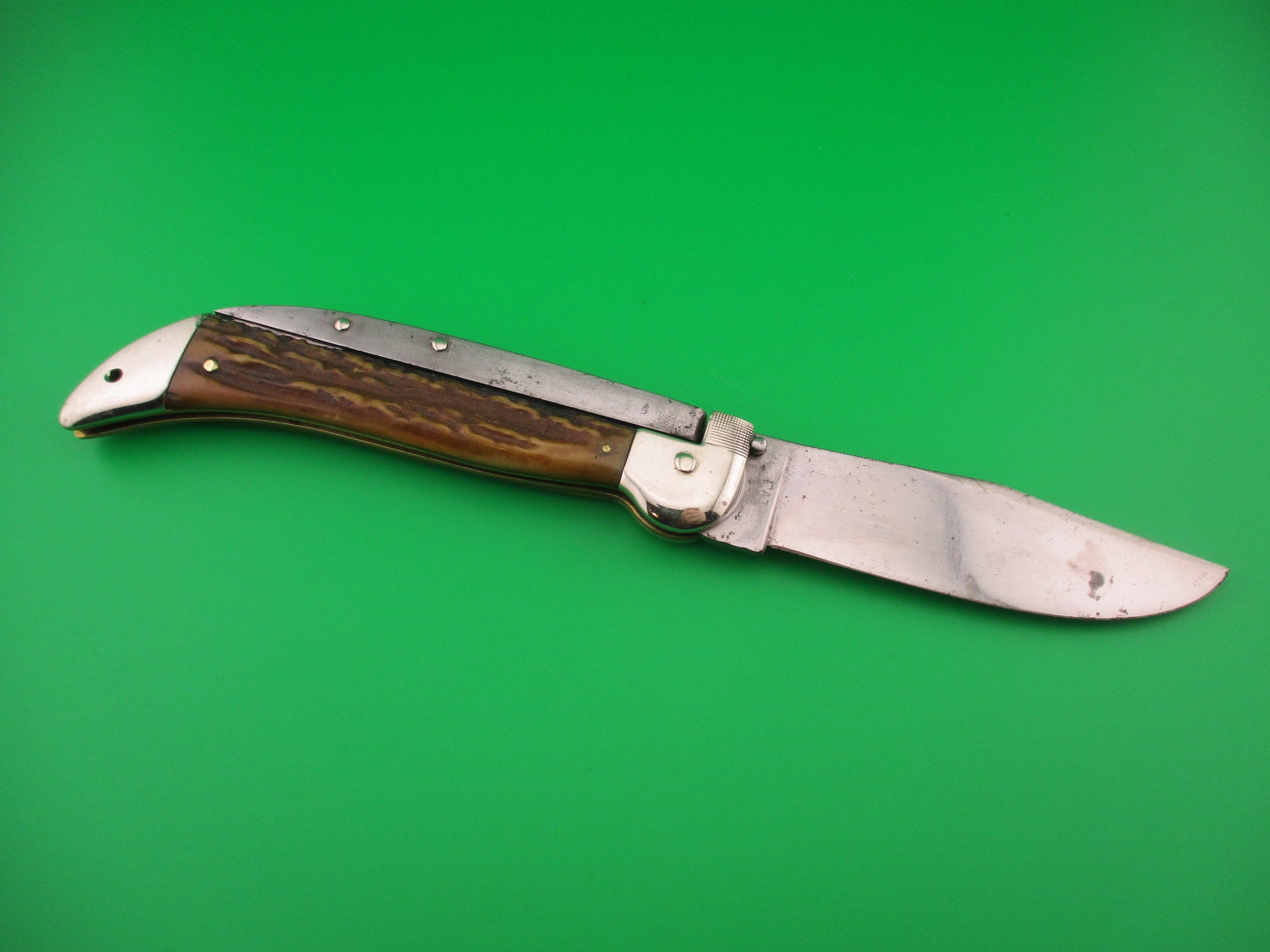 The blade is marked KABAR on the front and PAT. over Union Cutlery Co on the back of the tang thought both are incomplete due to wear. The blade is 94% full, or better and shiny with light scratches and a little spotting and is a bit short. The stag scales (handles) are in perfect condition with lots of character. The knife functions well with blade tip well below liners closed, opens strong with one hand and fair lockup with about 1/16" movement at the tip. Many of these end up with "tired" springs and don't open fully, but this one still has a strong spring and opens fully when the button is pressed! Here's your chance to own a legendary piece of American switchblade history! Rattles if shaken with blade open as most of these do. Overall VG+ condition.