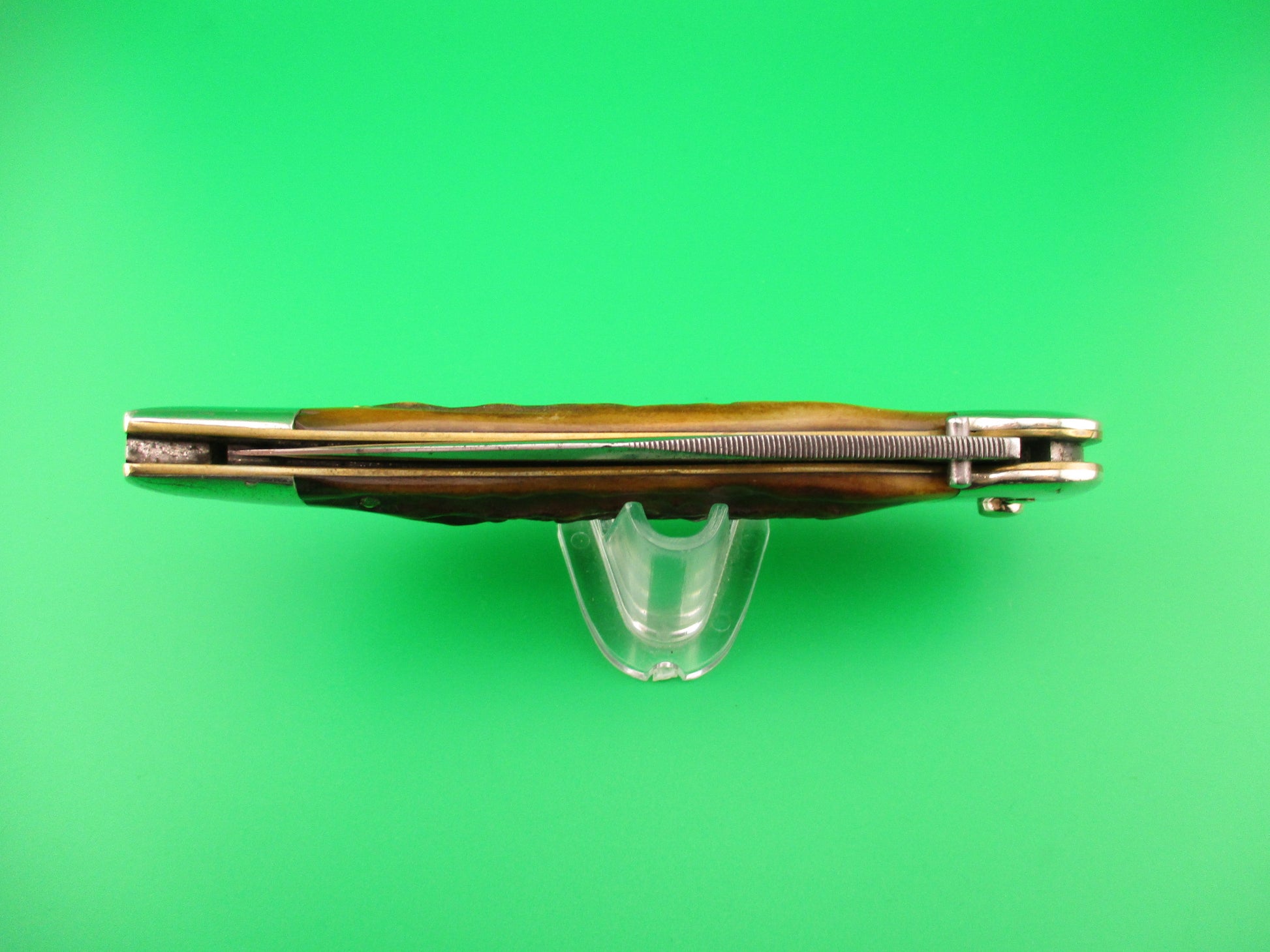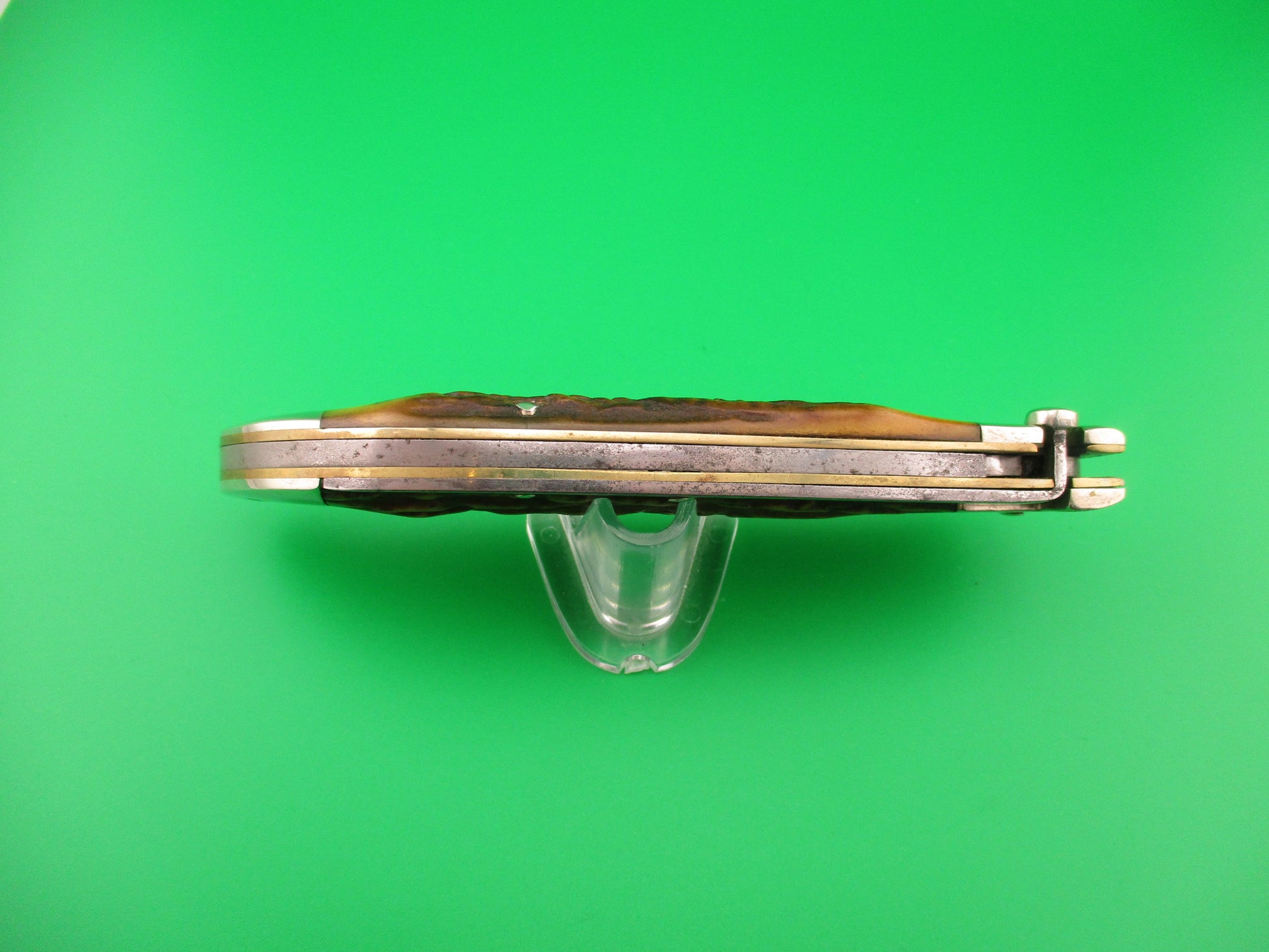 Vintage Kabar Big Grizzly switchblade made by Union Cutlery Co of Olean, NY sometime between 1923 and early 1950s and designated the (pattern) model #2179. The knife measures 5 1/2 inches closed and 9 11/16 inches open with genuine stag scales and brass liners & pins with nickel silver bolsters & button. It weighs in at a bit over half a pound and is a definitely handful. Considered by many to be the King of the American switchblades these knives are highly sought after by collectors and are the focal point of many knife collections.