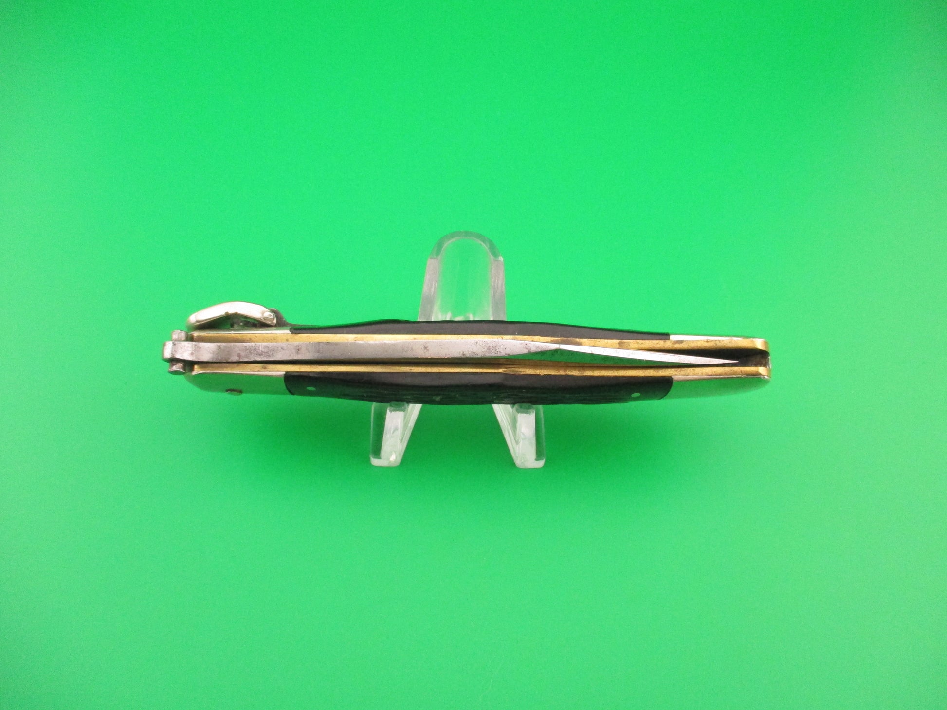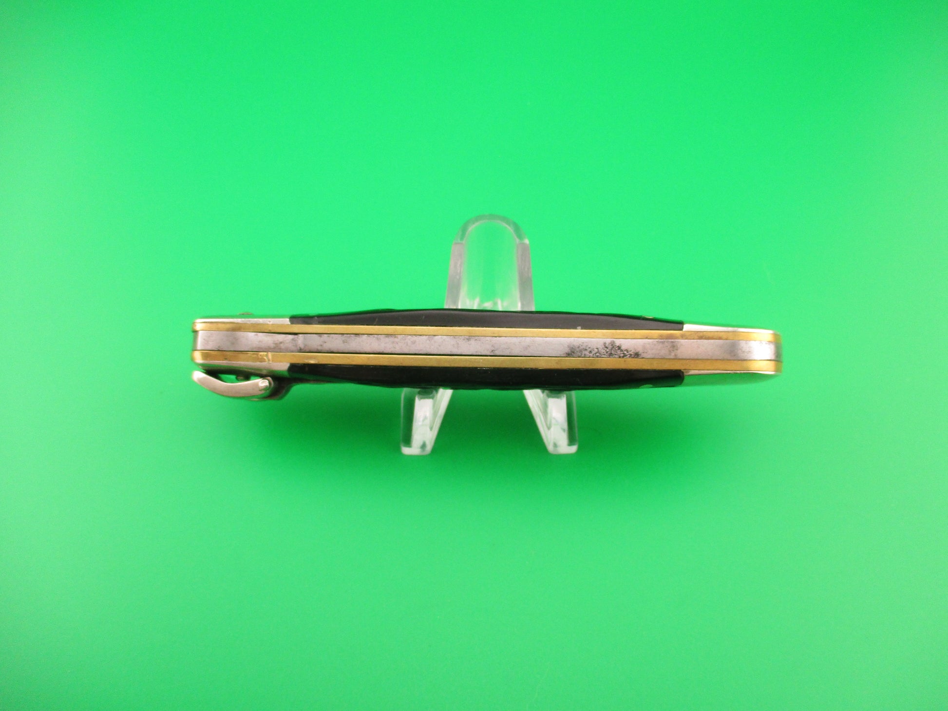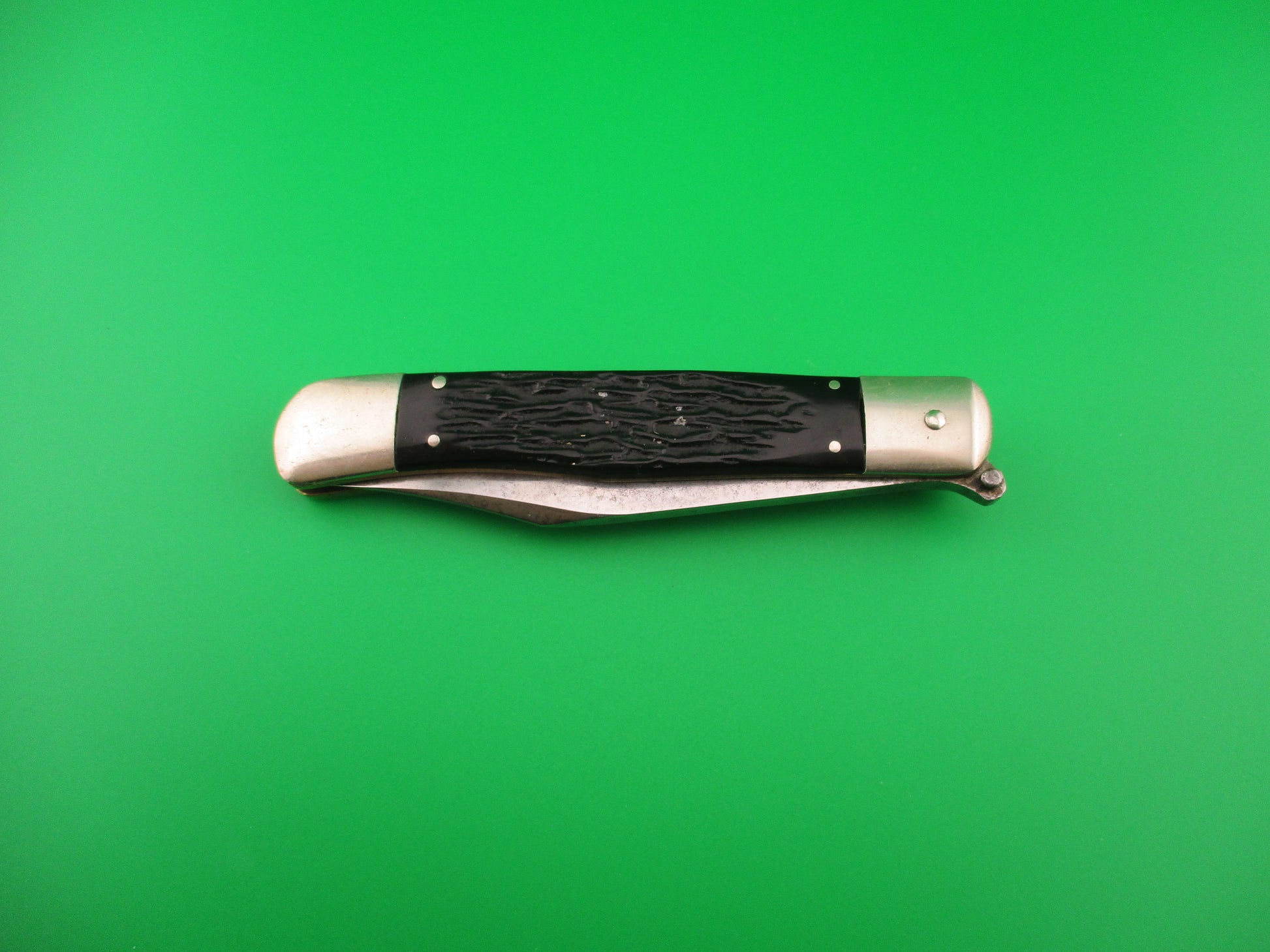 KABAR Lever Black Jigged synthetic Transitional Square lever vintage automatic knife pattern # 51105 made by Union Cutlery Co of Olean, NY sometime between 1920 and 1940. This is a transitional knife between the early teardrop lever and the later grooved square lever. They realized that the new smaller lever needed grooves to make it easier to operate and I think that change was made around 1932. The knife measures 4 9/16 inches closed and 7 7/8 inches open with thick brass liners and nickel silver bolsters and lever. The saber ground blade is 96% full with much of the original finish with patina & scratches from use and the tang Is clearly stamped KA-BAR and the backside reads UNION CUT CO OLEAN, NY USA. The scales are black jigged synthetic material and are in excellent condition. The knife works well with blade tip well below the liners closed, good snap and tight lockup open. EX condition.