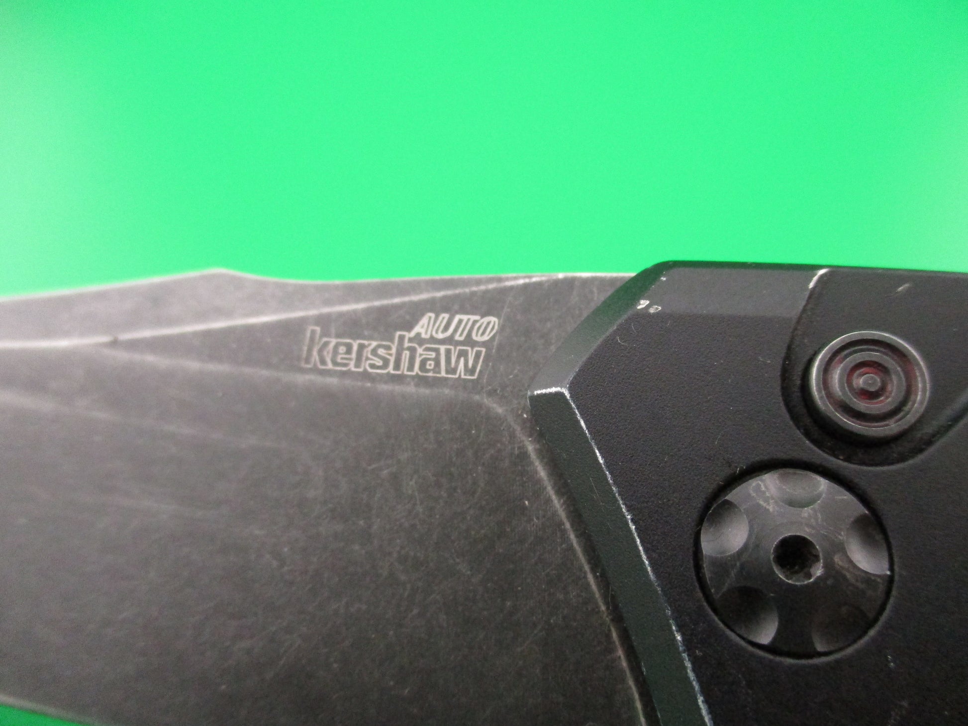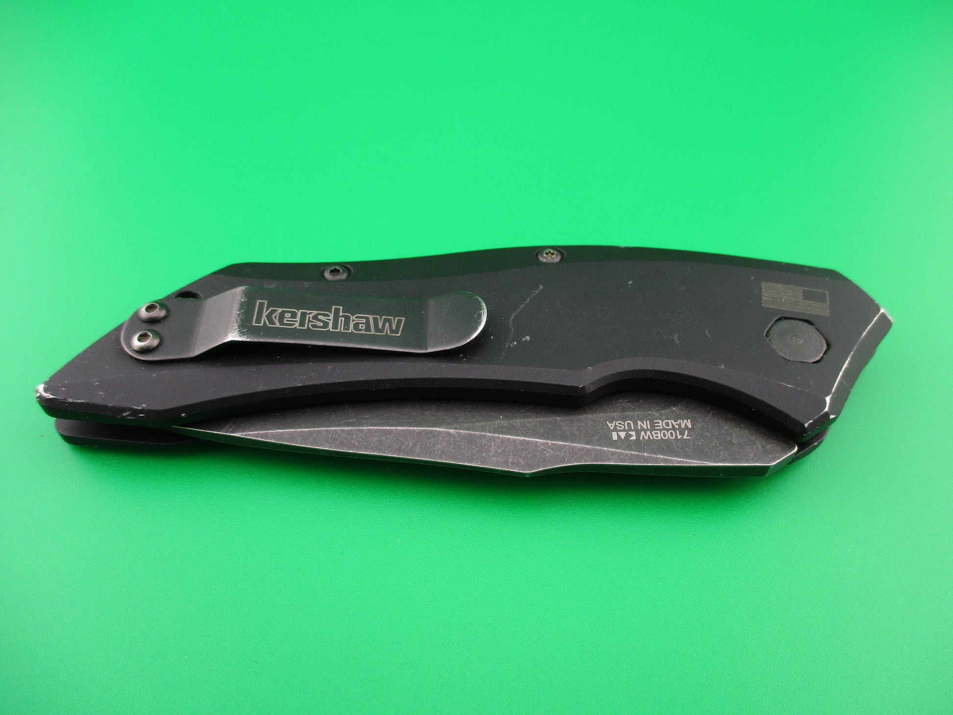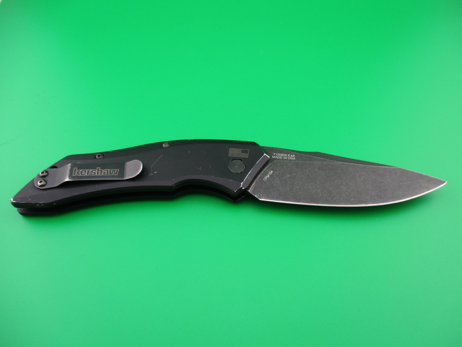 Nice used Kershaw 7100BW automatic knife. Modern switchblade made in the USA. Measures 8 1/8" open. Blackwashed CPM 154 steel blade with black aluminum handles with boot clip. Nice collectible modern American switchblade. The blade appears to be full and lightly sharpened. The knife works Great with the blade tip seating deep, STRONG snap and Super Tight lockup open! Scuffs and light scratches from use, but overall very nice used condition.