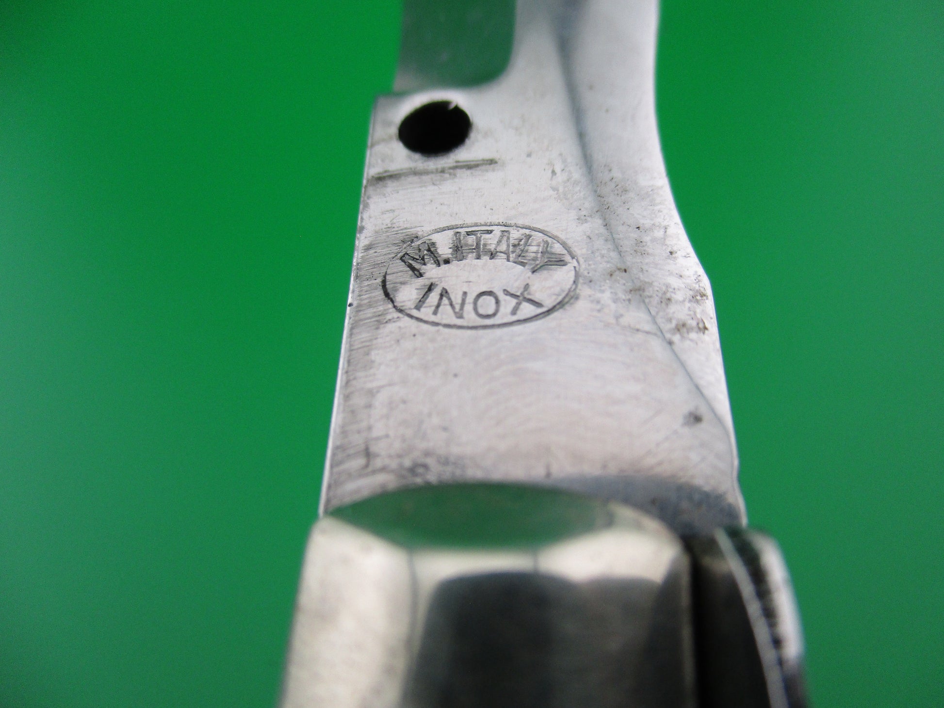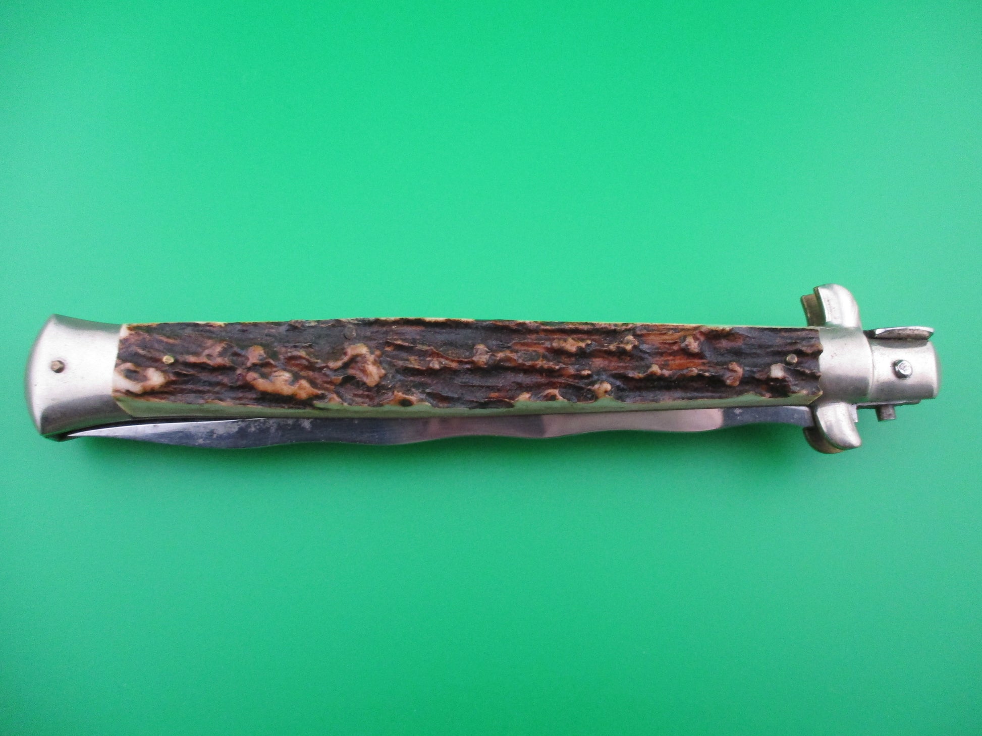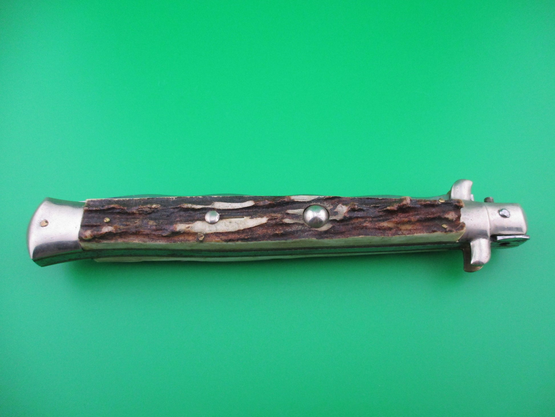 This is a 1950s Italian picklock with stag scales and Kris blade that is marked M. ITALY over INOX inside an oval. This is a Gorgeous old picklock! The blade is full with factory edge. The knife measures 7 1/8 inches closed and 13 1/8 inches open (33cm) with brass liners and THICK stag scales (handles). Thick 5mm backspring! The knife functions perfectly with blade tip below liners when closed, strong snap and great lockup. I've noticed over the years that some of these knives were made with the blade "leaning" a bit to one side of center. This is one of those knives. If you use a straight edge to find the center of the knife (running through top and bottom pins), the tip is approx 1/4 inch left of center. I don't know if it was intentional, or not, but I'm confident this is how it was made. No signs of tampering with this Amazing knife. It's a real beauty.