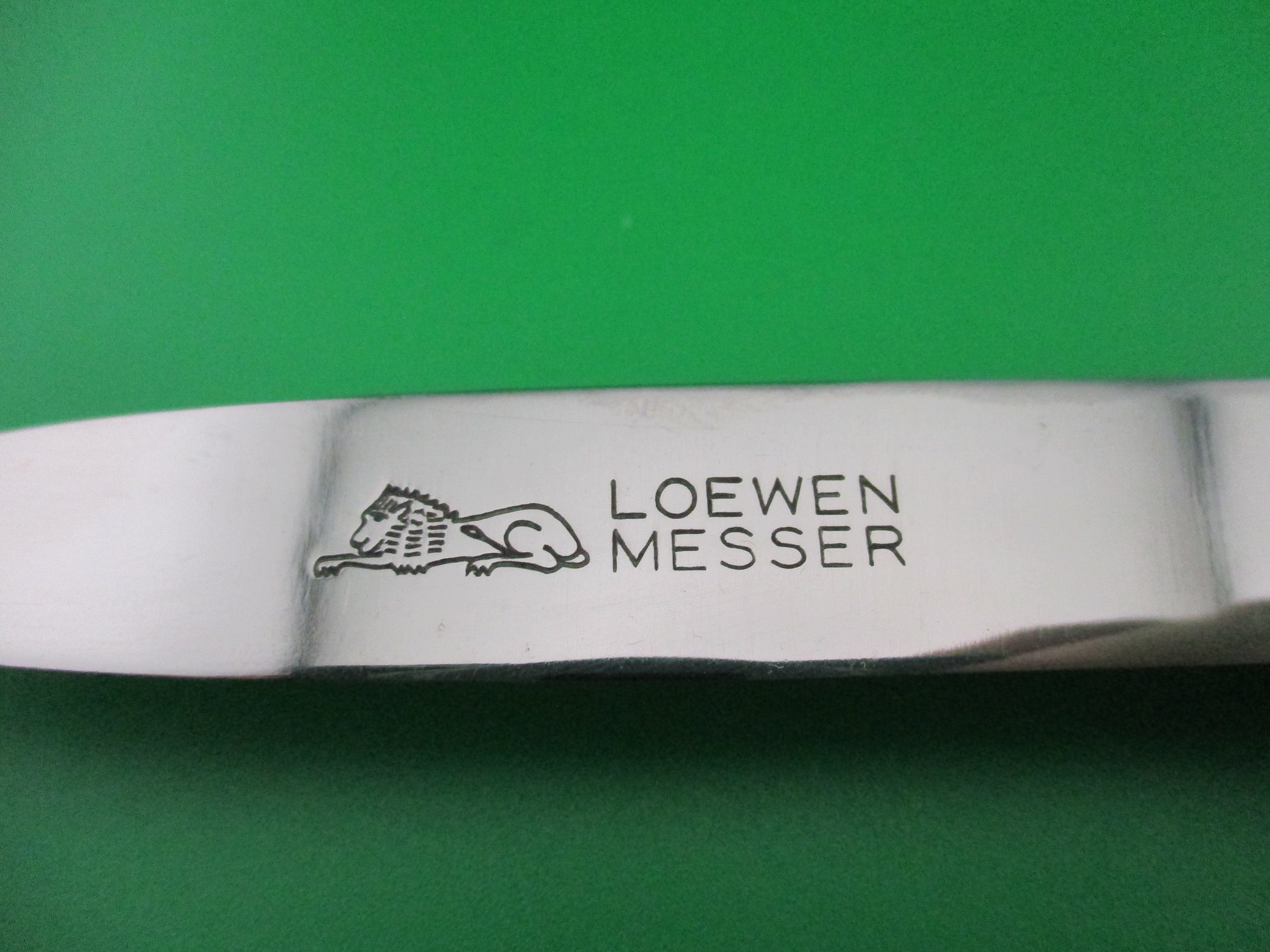 Nice German Lever knife, most likely from the 1940s, or 50s. It is marked C. LUTTERS CIE over SOLINGEN. Backside marked ROSTFREI over SOLINGEN. The blade is engraved with a picture of a Lion and the words LOWEN MESSER. The knife is in excellent condition. The scales are dyed jigged bone. The bolsters and lever are made of German Silver. Measures 4.5 inches closed and just under 8 inches open. Looks like the blade may have a little loss from sharpening, but mostly full and nice. Sits deep, strong snap and good lockup open.