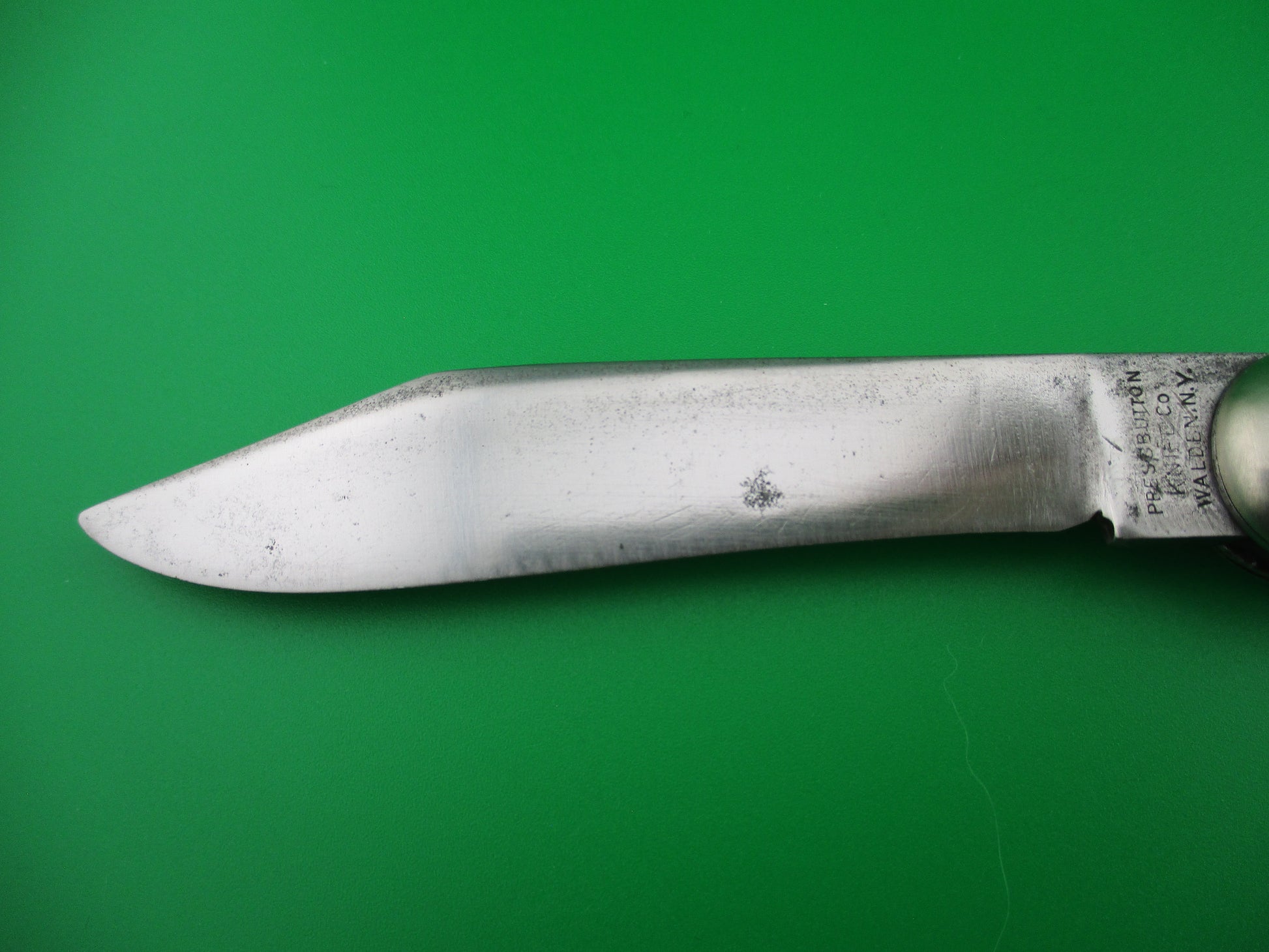 This is a Press Button Knife Co INVINCIBLE model switchblade made in Walden, NY sometime between 1900 and 1923. The knife measures 4 7/8 inches closed and 8 1/2 inches open with jigged bone scales and steel liners. The blade is marked PRESS BUTTON KNIFE CO WALDEN, NY on the tang and the backside is blank. The blade has been used and sharpened over the years and is approx 90% full and has been lightly cleaned. There is wear, light scratches and light pitting on the blade. The knife functions well with the blade tip seating deep in the well when closed, opens strong when button pressed and surprisingly tight lockup when open which means it was likely repaired at some time. The jigged bone scales are in very good condition with one tiny hairline crack on the front scale that's barely noticeable. This is a nice working example of a 100+ year old American made switchblade.