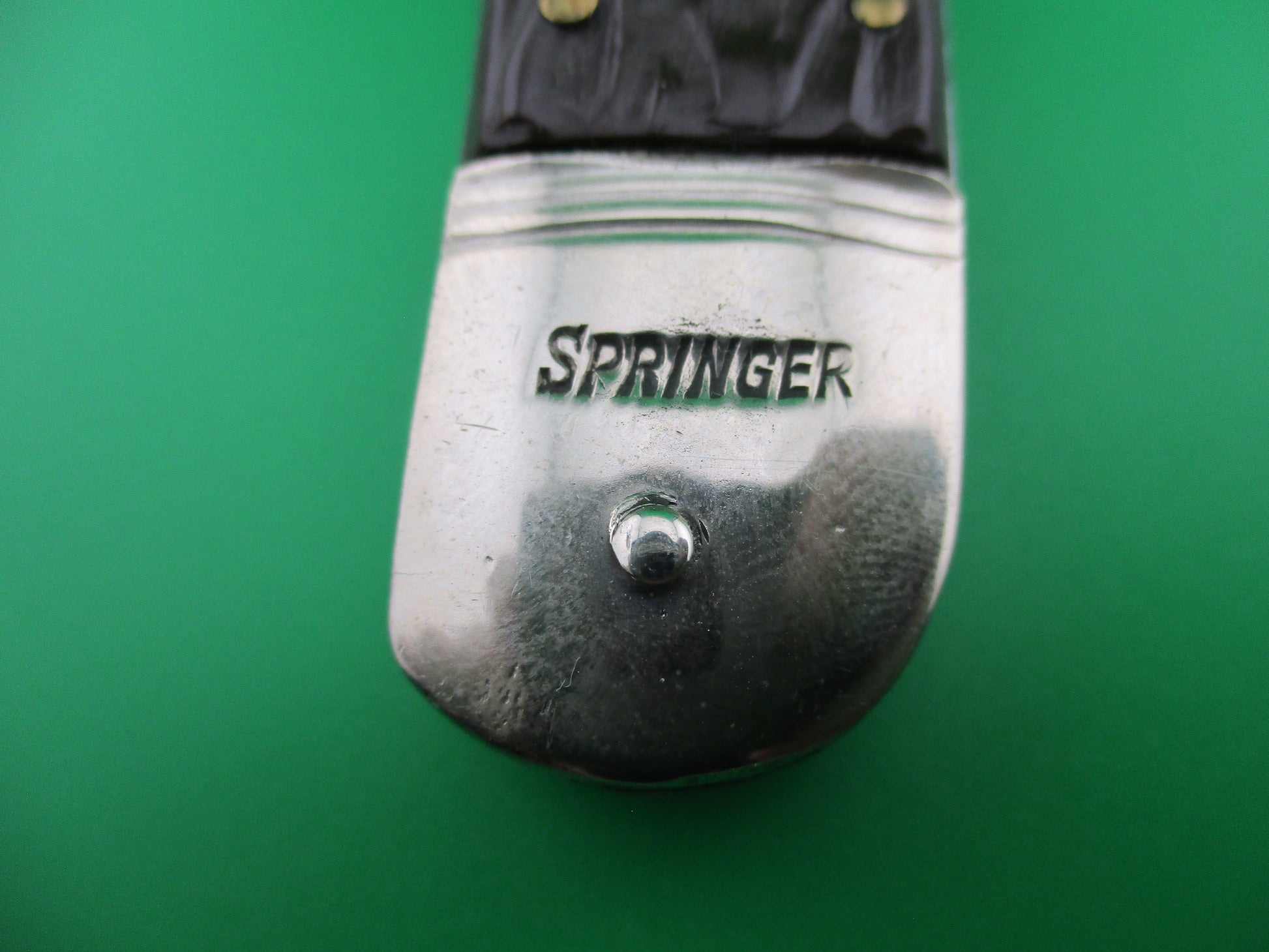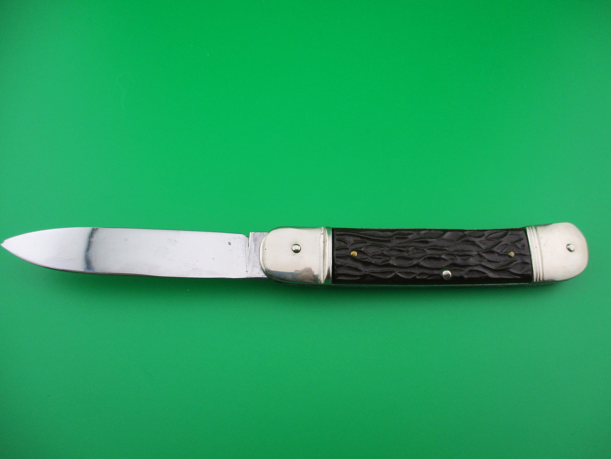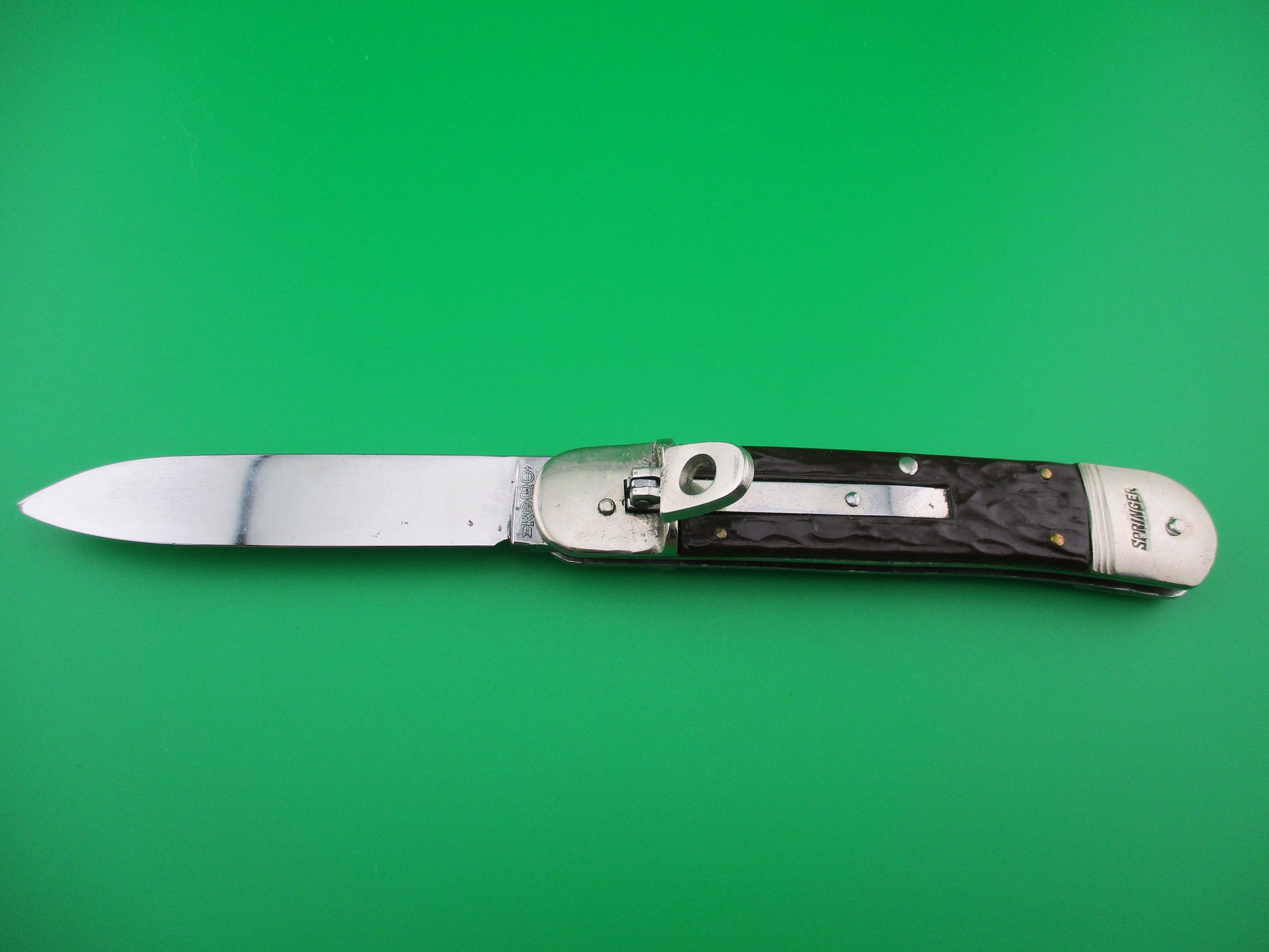 This is a German made switchblade marked ROMO with an Arrow through it. Not sure which company made it, but most likely made for an importer. This marking is also found on Italian picklocks from the 1950s. This is a beautiful and Solid knife. It measures just under 12cm closed (4.5 inches) and just under 20cm open (7 3/4 inches) with steel liners. The knife functions perfectly with the blade tip seating below the liners when closed, strong snap and great lockup when open. The lever flips into the "safe" position when the blade locks closed, as it should. The scales look like jigged bone, but are actually synthetic and in great condition. I've seen a lot of German lever knives, but no many marked ROMO. This knife is EX++ condition.