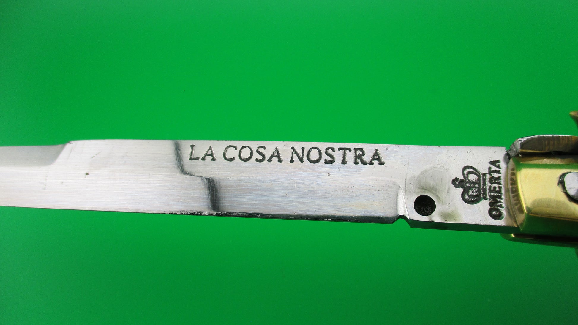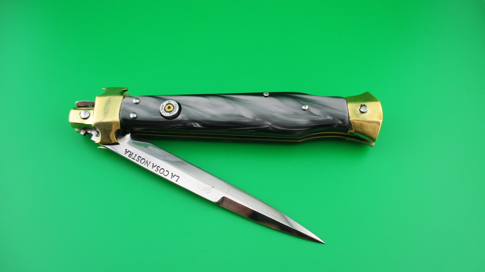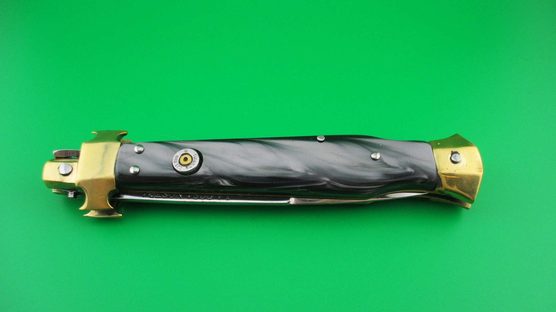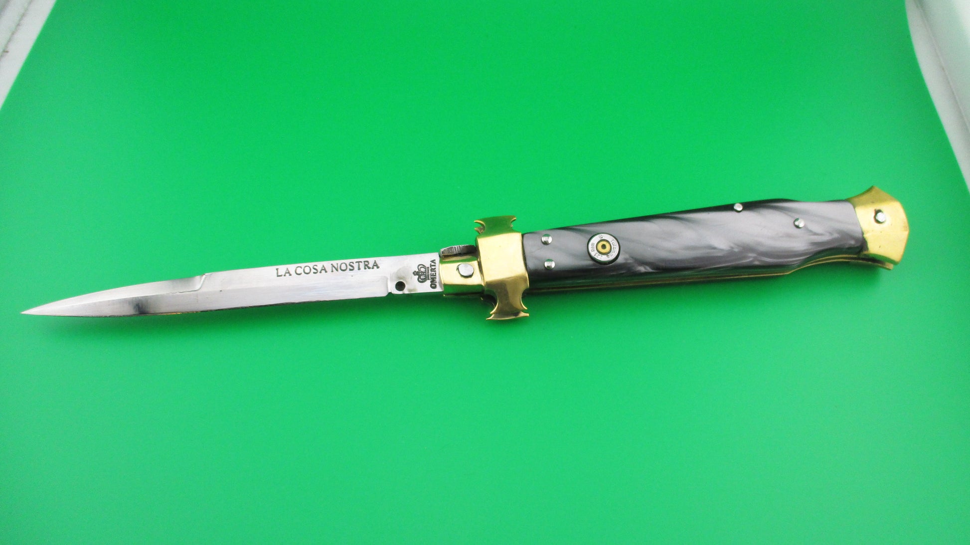 LA COSA NOSTRA OMERTA 28cm .223 Tulammo Italian Custom Wasp picklock switchblade knife with Gray Pearlex scales measures 11 1/8" open with brass liners and bolsters. The bayonet style blade appears to be full with original finish and is stamped "OMERTA under the picture of a Crown on the ricasso and "LA COSA NOSTRA" stamped on the face of the blade below the spine. The button looks like the butt of a .223 Remington casing and is marked as such along with "Tulammo". The Gray Pearlex scales are very attractive and there is filework on the brass liners along the backspring. The knife works well with blade tip deep and centered when closed, nice snap and good lockup with a little movement each way at the tip when locked open. Not sure who made this knife, but it has an Italian feel/look to it and is very solid. No safety. EX condition.