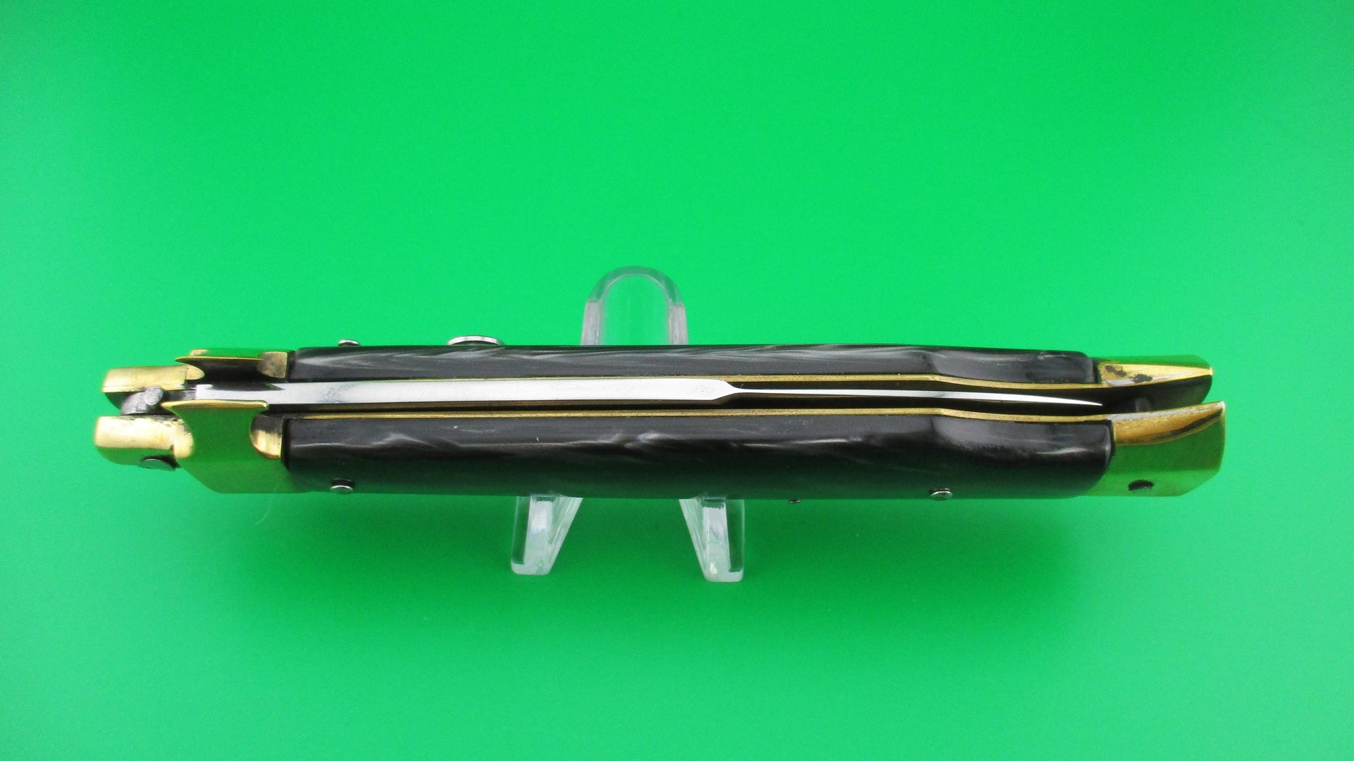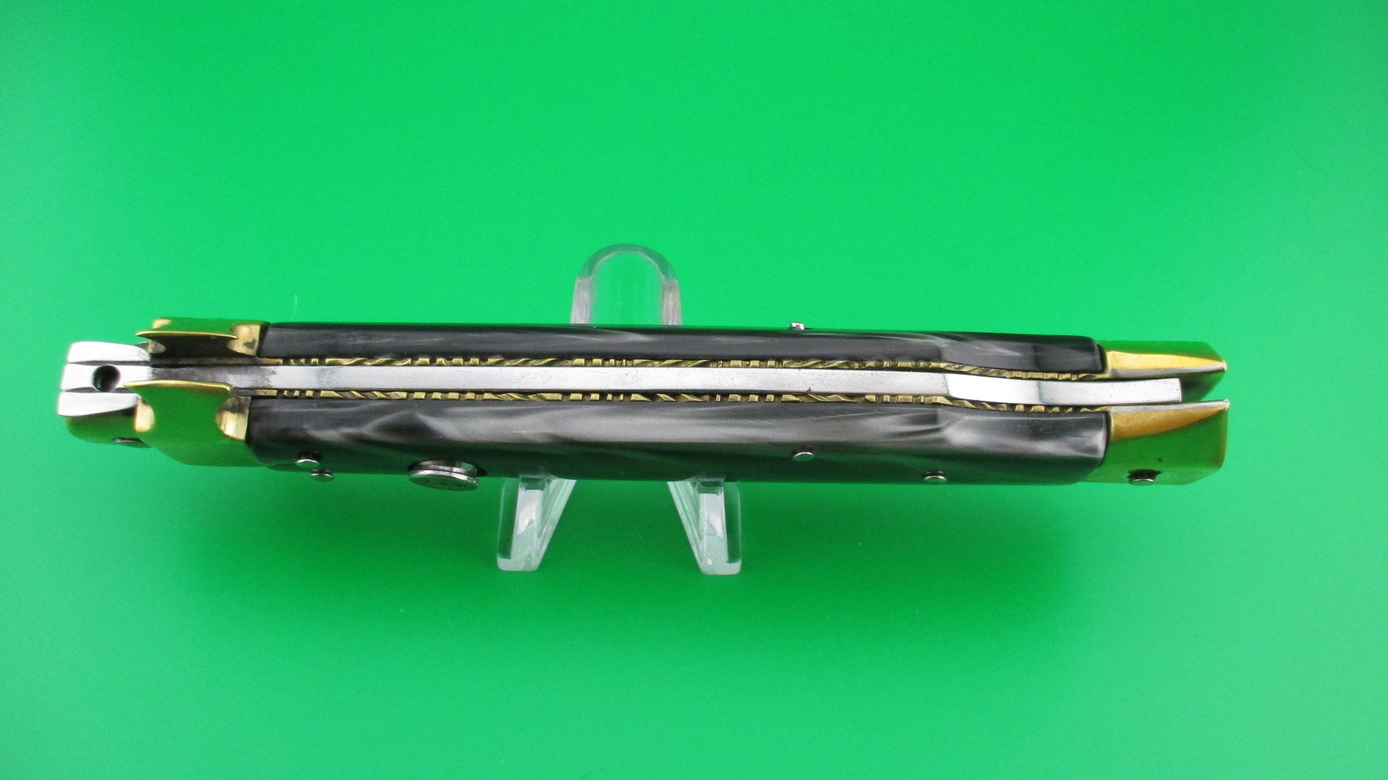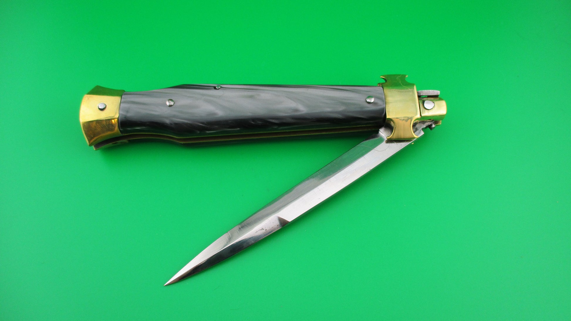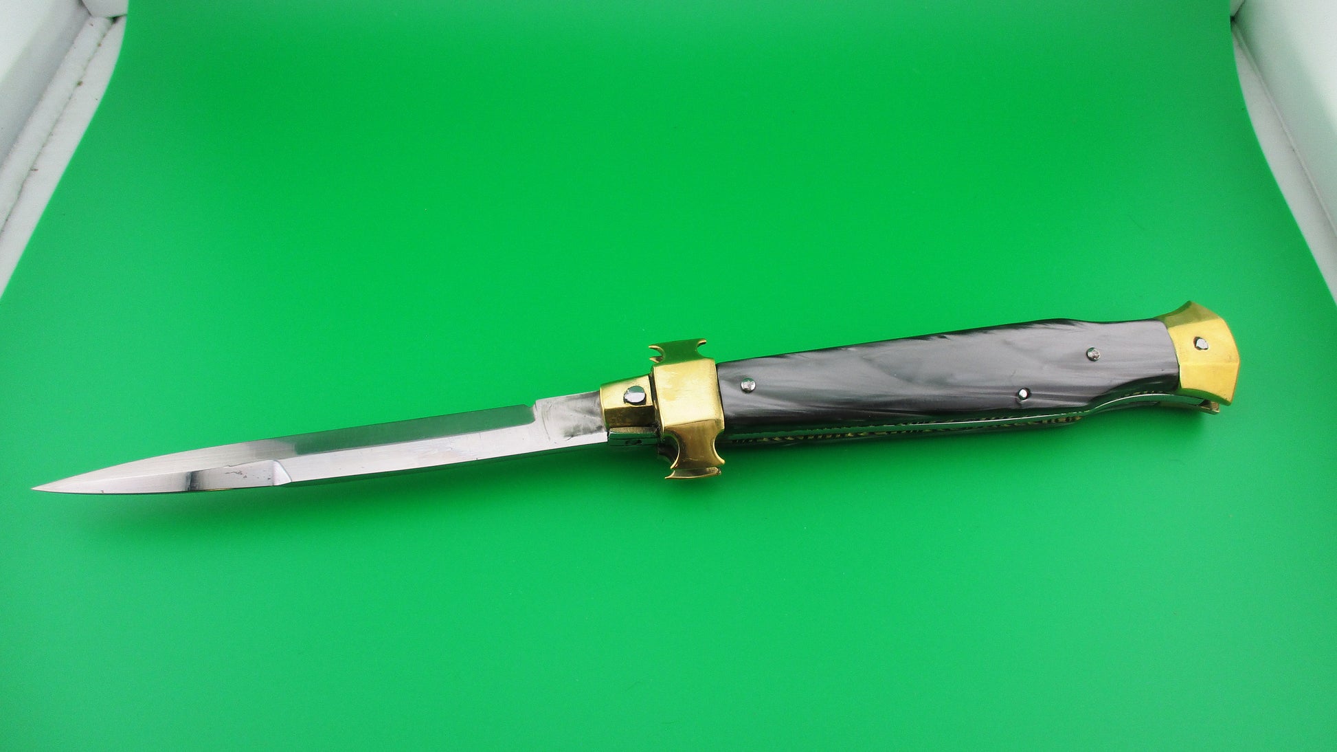 LA COSA NOSTRA OMERTA 28cm .223 Tulammo Italian Custom Wasp picklock switchblade knife with Gray Pearlex scales measures 11 1/8" open with brass liners and bolsters. The bayonet style blade appears to be full with original finish and is stamped "OMERTA under the picture of a Crown on the ricasso and "LA COSA NOSTRA" stamped on the face of the blade below the spine. The button looks like the butt of a .223 Remington casing and is marked as such along with "Tulammo". The Gray Pearlex scales are very attractive and there is filework on the brass liners along the backspring. The knife works well with blade tip deep and centered when closed, nice snap and good lockup with a little movement each way at the tip when locked open. Not sure who made this knife, but it has an Italian feel/look to it and is very solid. No safety. EX condition.