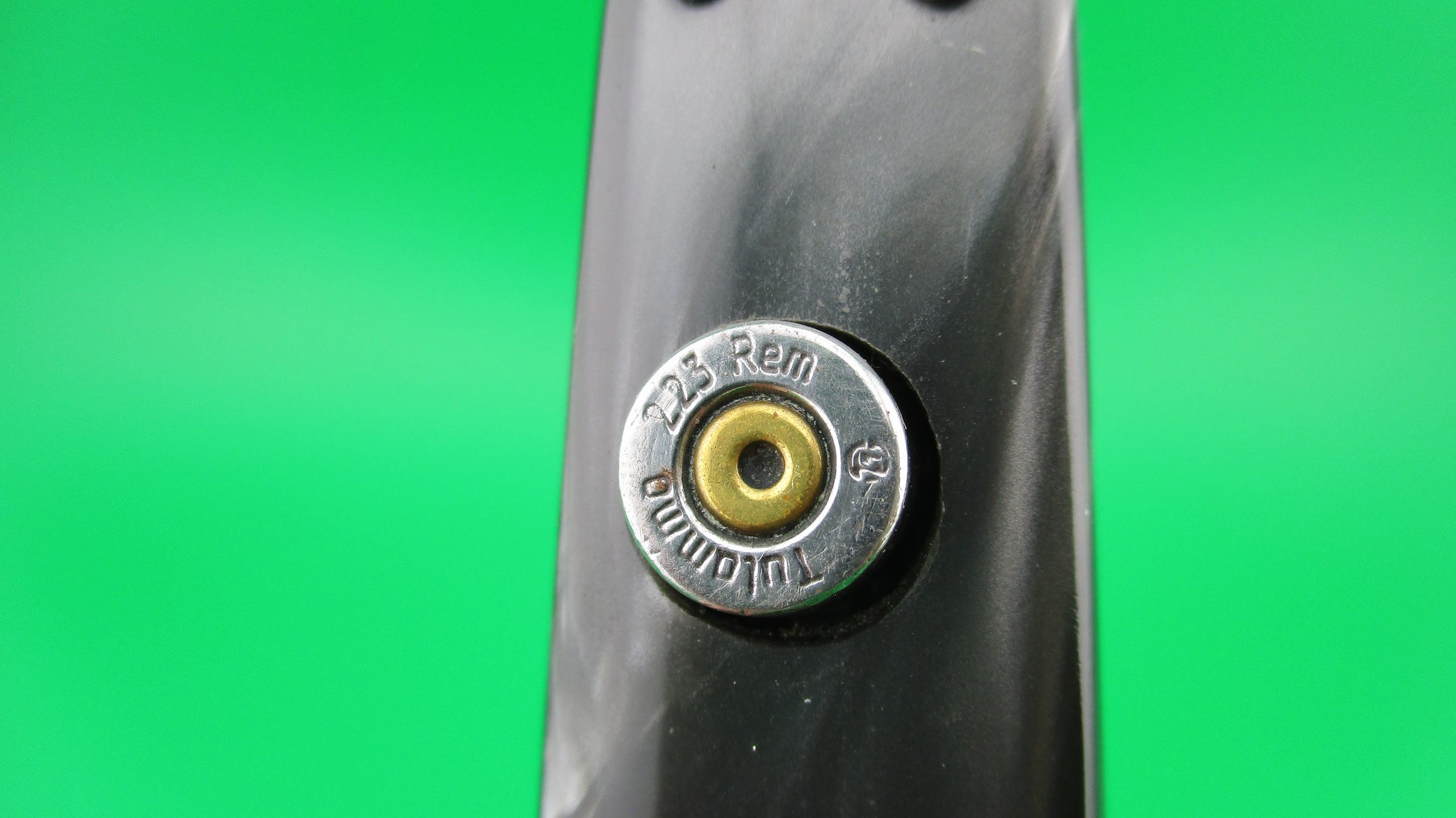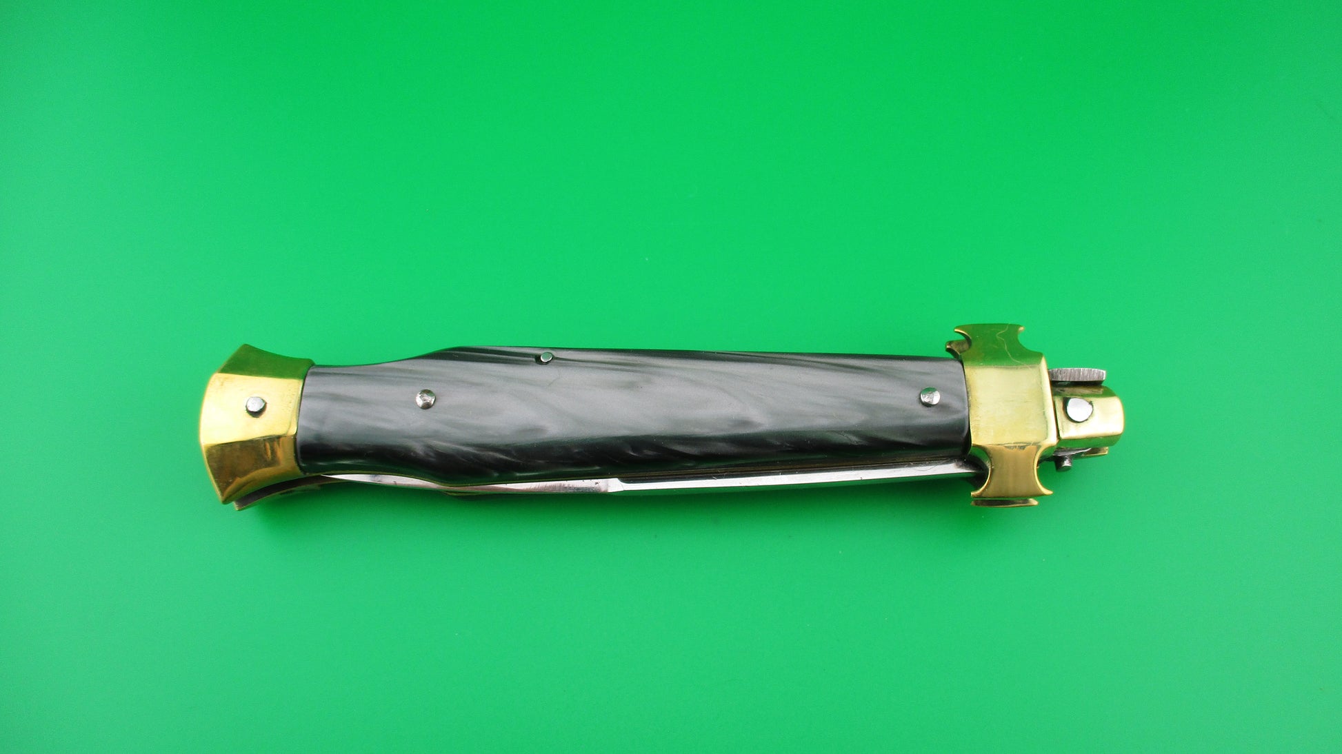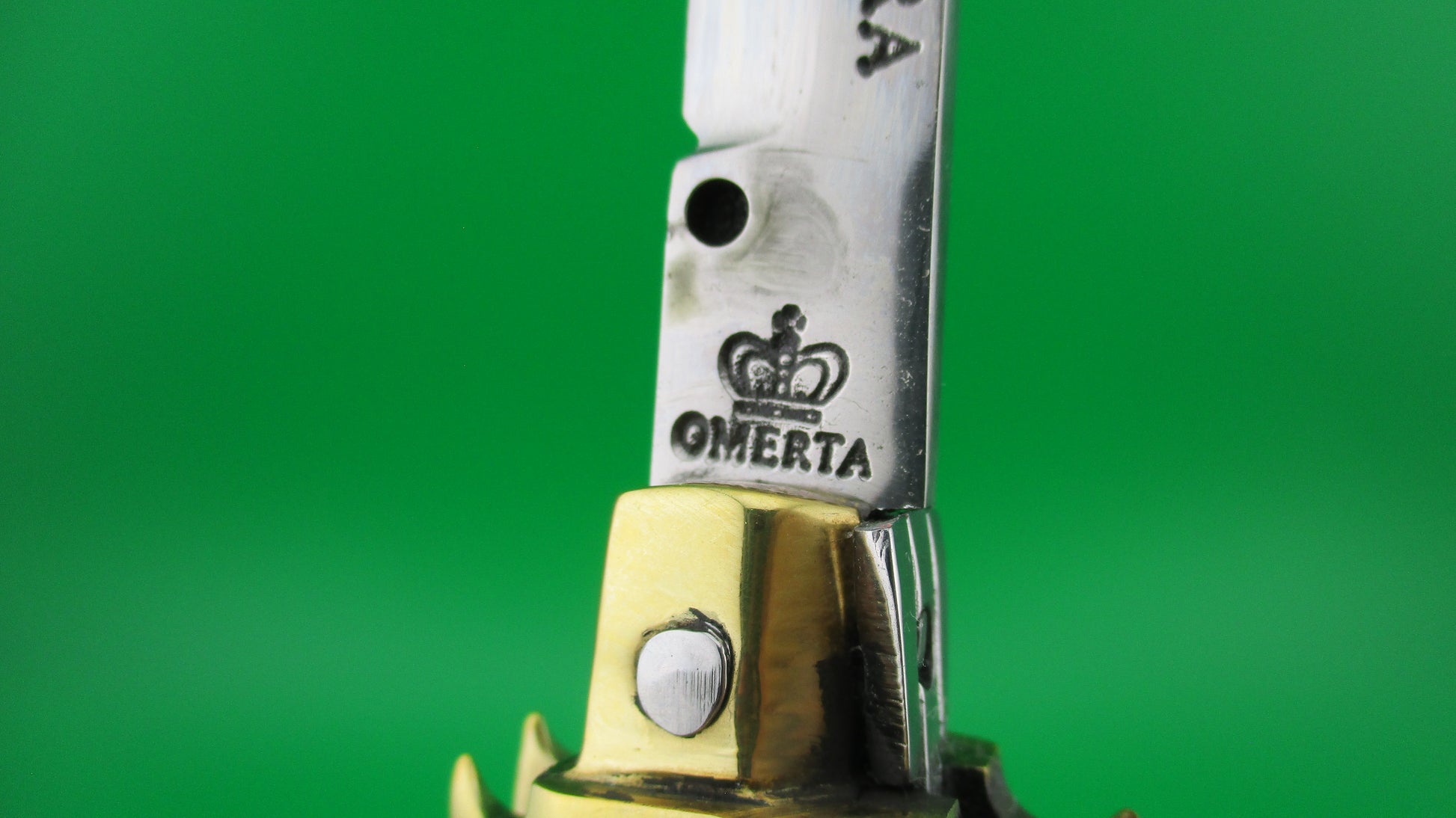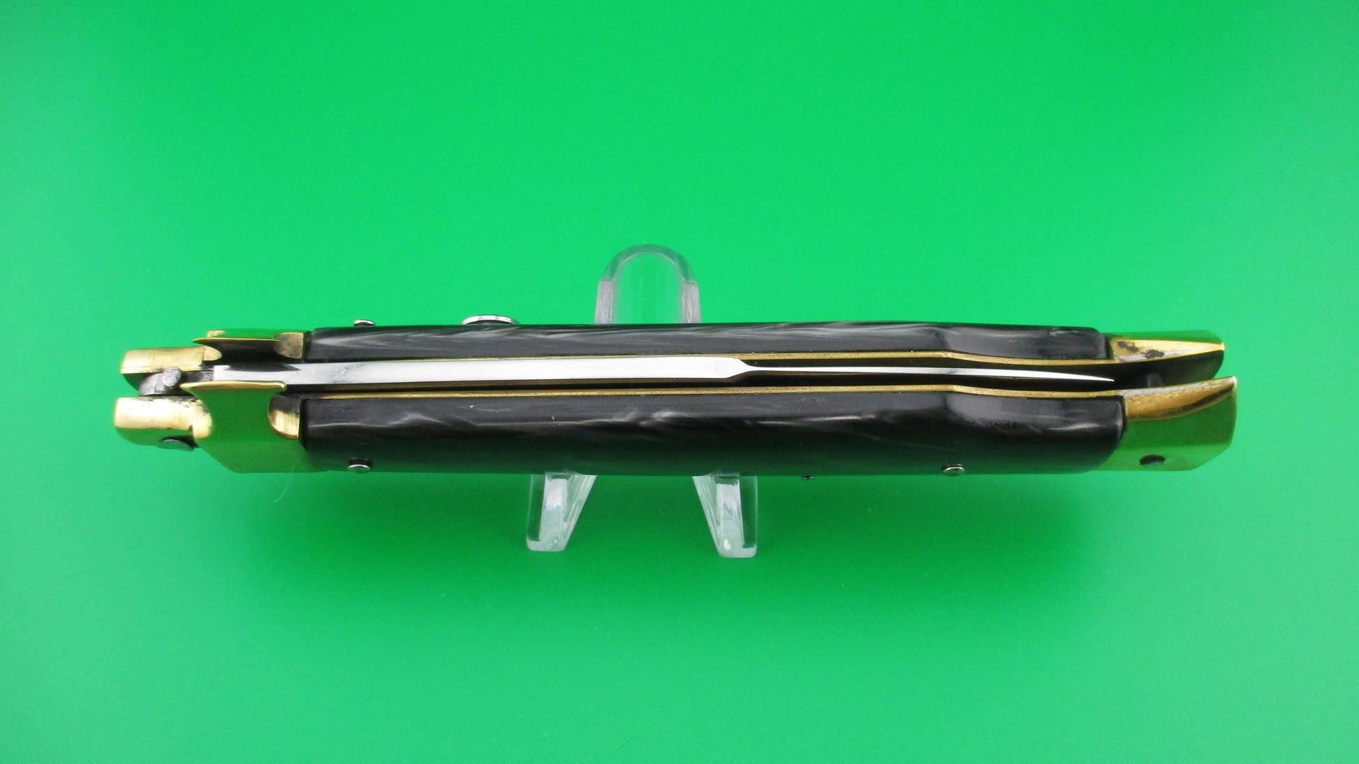 LA COSA NOSTRA OMERTA 28cm .223 Tulammo Italian Custom Wasp picklock switchblade knife with Gray Pearlex scales measures 11 1/8" open with brass liners and bolsters. The bayonet style blade appears to be full with original finish and is stamped "OMERTA under the picture of a Crown on the ricasso and "LA COSA NOSTRA" stamped on the face of the blade below the spine. The button looks like the butt of a .223 Remington casing and is marked as such along with "Tulammo". The Gray Pearlex scales are very attractive and there is filework on the brass liners along the backspring. The knife works well with blade tip deep and centered when closed, nice snap and good lockup with a little movement each way at the tip when locked open. Not sure who made this knife, but it has an Italian feel/look to it and is very solid. No safety. EX condition.