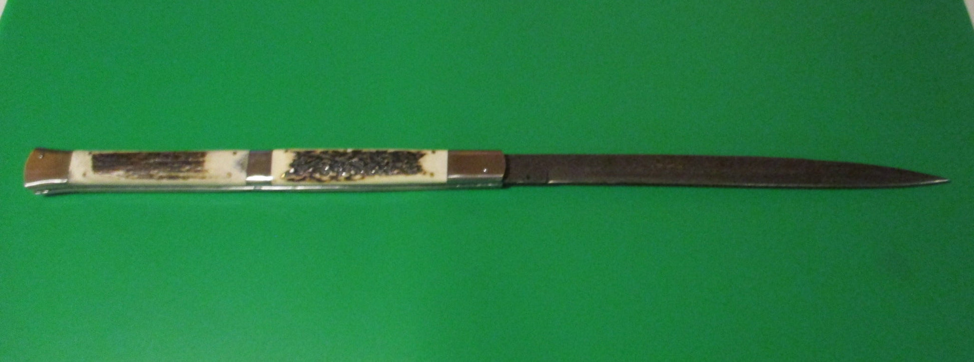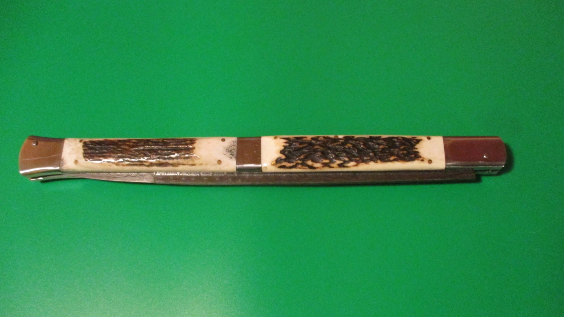 Large Custom 61cm Italian Prioletta Inspired HUGE Damascus & Horn Automatic knife by Samir Ahmad. This knife measures a whopping 61.2cm (24 1/8 inches) open and weighs in at 580 grams (1.2 pounds)! It has steel liners, bolsters, center band & rectangular button and a brass fixed (non moving) faux safety. The 12 inch Damascus bayonet style blade is 100% full and has original SHARP edge. Really gorgeous hand made Damascus. The genuine stag scales are very attractive and in great condition. The knife functions perfectly with the blade tip deep and centered, opens fully with a lout "THWACK" and locks up tight! This knife is an EXPERIENCE to open and fun to Play with!! It really is a MONSTER and would make a GREAT Display piece! Made by second generation master cutler Samir Ahmad. New condition.