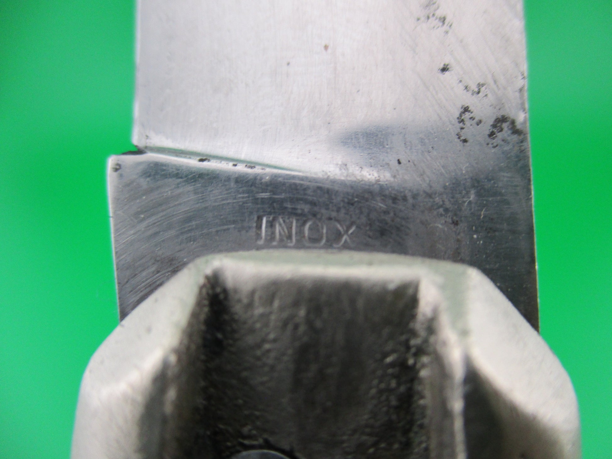 This is the larger model of the French Coffin lever knife. The knife has jigged bone scales and measures 26.5cm open (10.5 inches) with steel liners and nickel silver bolsters and lever. The blade is marked INOX and appears to be full with some light scratches. The bone scales are in very good condition with no cracks or chips. The knife works well with the blade tip barely above the liners when closed, Strong snap and good lockup open with approx 1/8" up and down at the tip. These are referred to as Coffin knives because of the shape and are popular with collectors. This is a nice working example of the largest coffin knife.