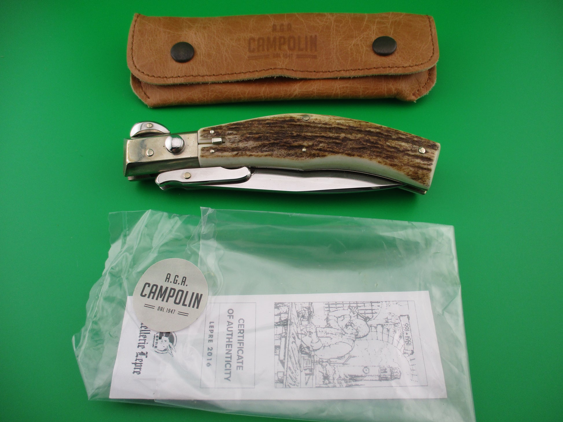 Gorgeous Italian Lepre 10 inch Stag Swing Guard picklock switchblade. This knife is As New condition with a beautiful saber grind blade marked Lepre Maniago. The stag scales (handles) are in perfect condition and thick. The knife works great with the blade tip seating DEEP, strong snap and Super Tight lockup! Safety works great. In leather AGA Campolin sheath and 3K knives box that it came in. Really Gorgeous handful of automatic Italian steel and stag!