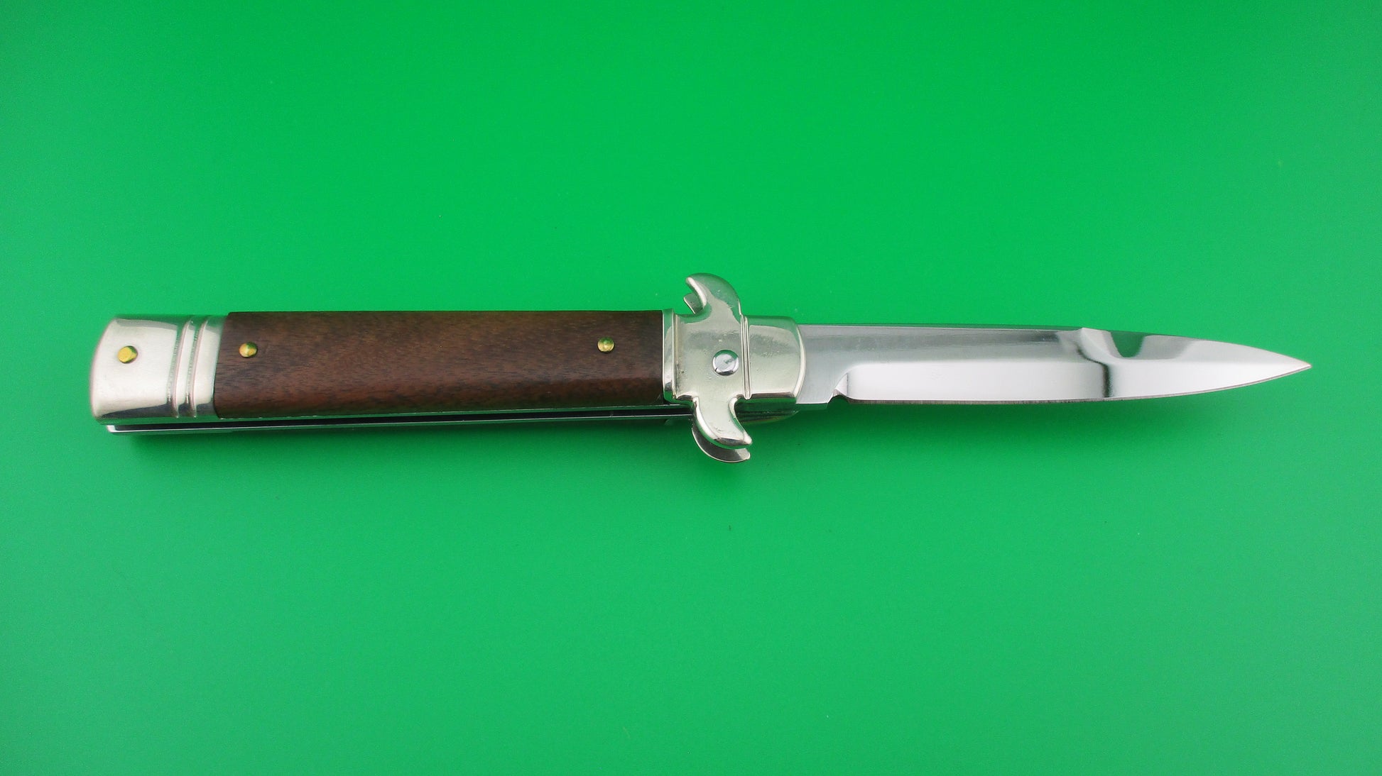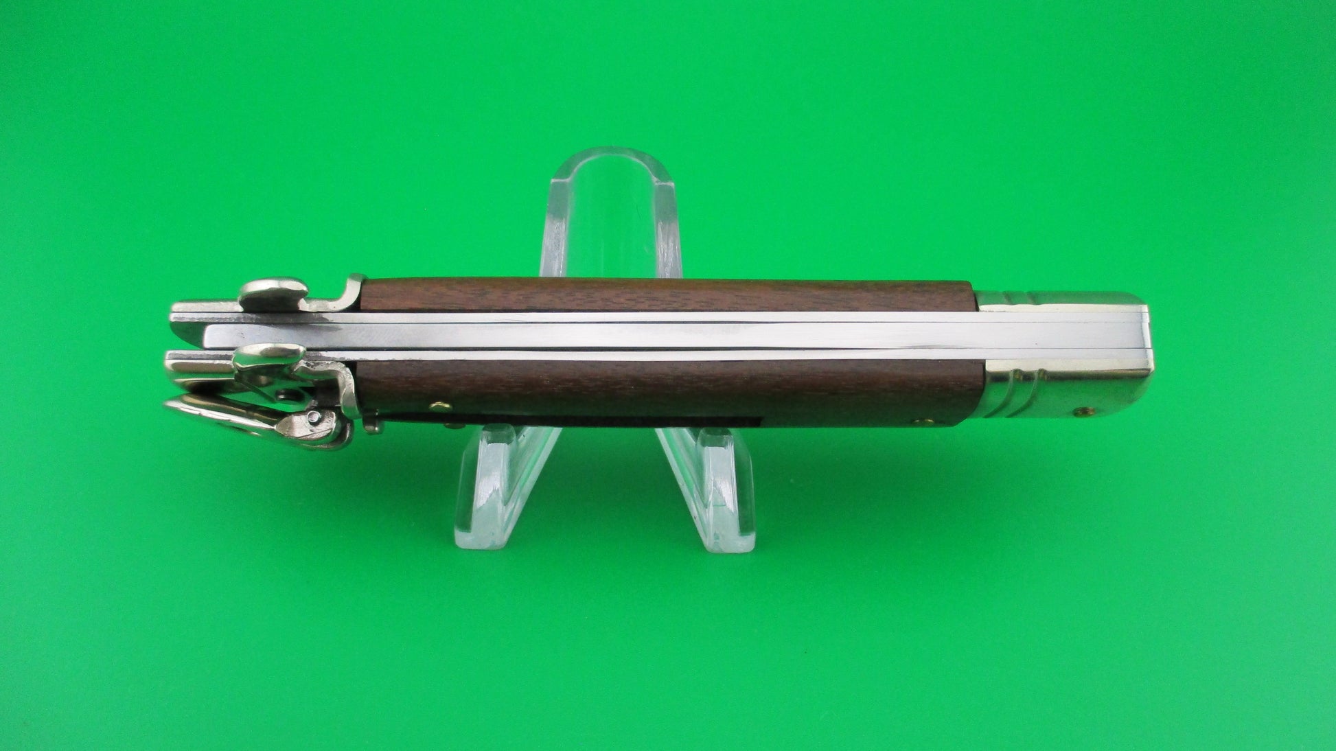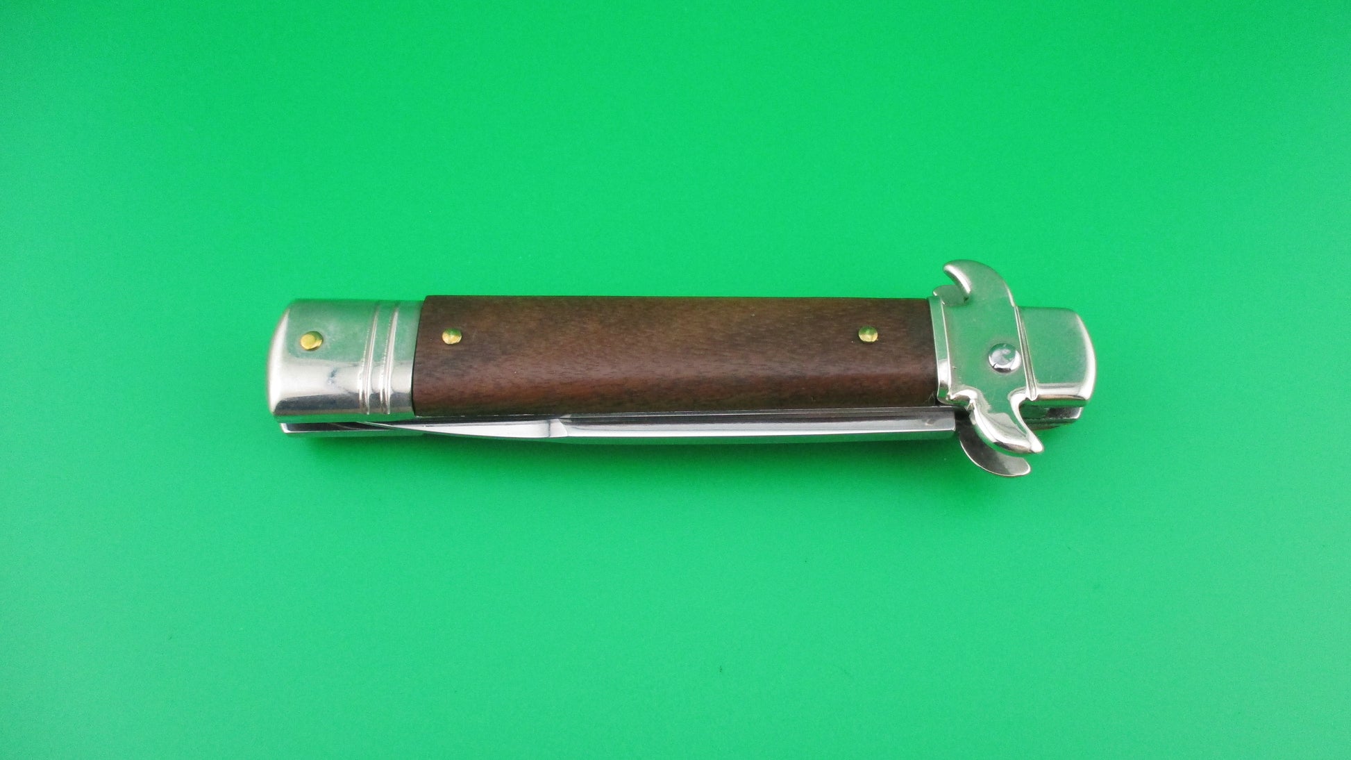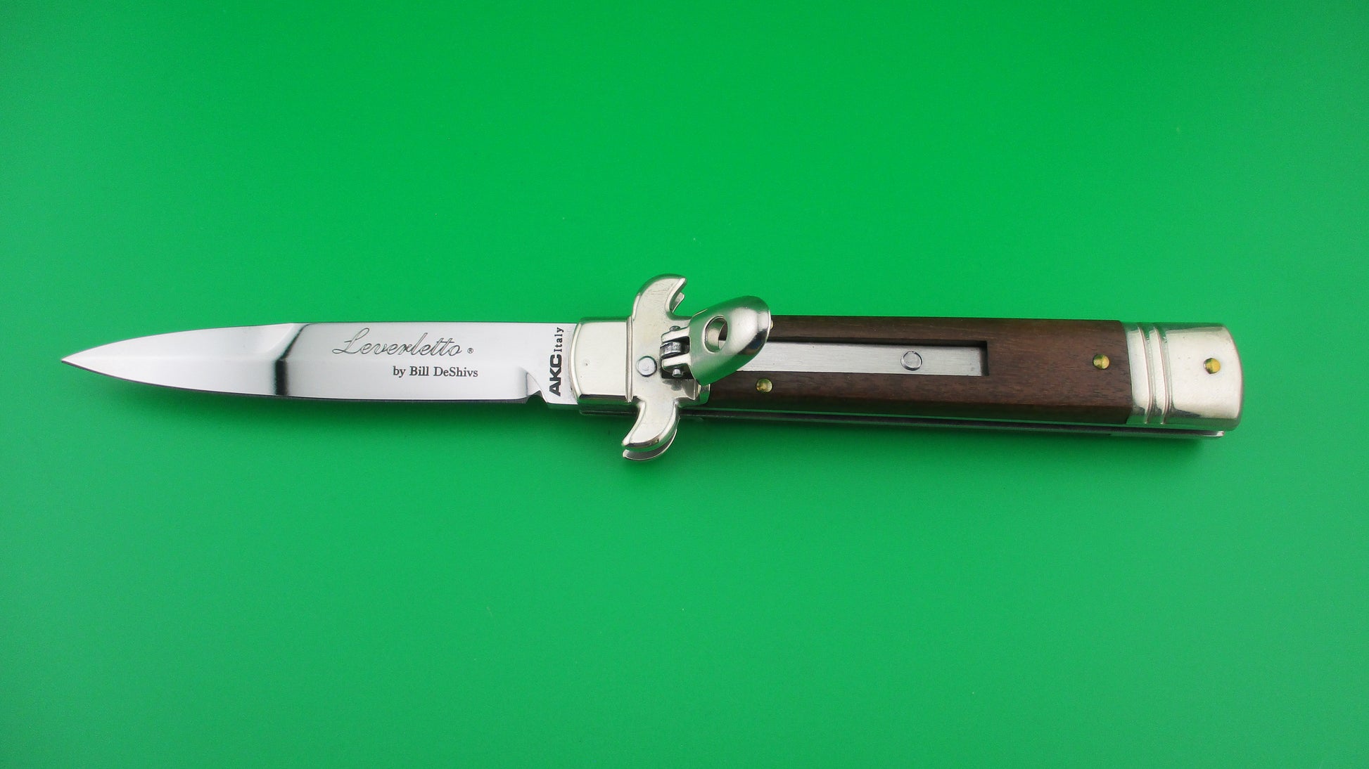 Italian AKC made Leverletto by Bill DeShivs lever activated switchblade knife. Measures 4 3/8" closed and 7 3/4 inches open with steel liners and nickel silver bolsters & lever. Bayonet style blade is full with original factory finish and is etched AKC ITALY on the ricasso and Leverletto by Bill DeShivs on the side of the blade. Wood scales in very nice condition. The knife is basically like new condition with some scuffs and handling marks. Works great, tight lockup! Nearly new condition.