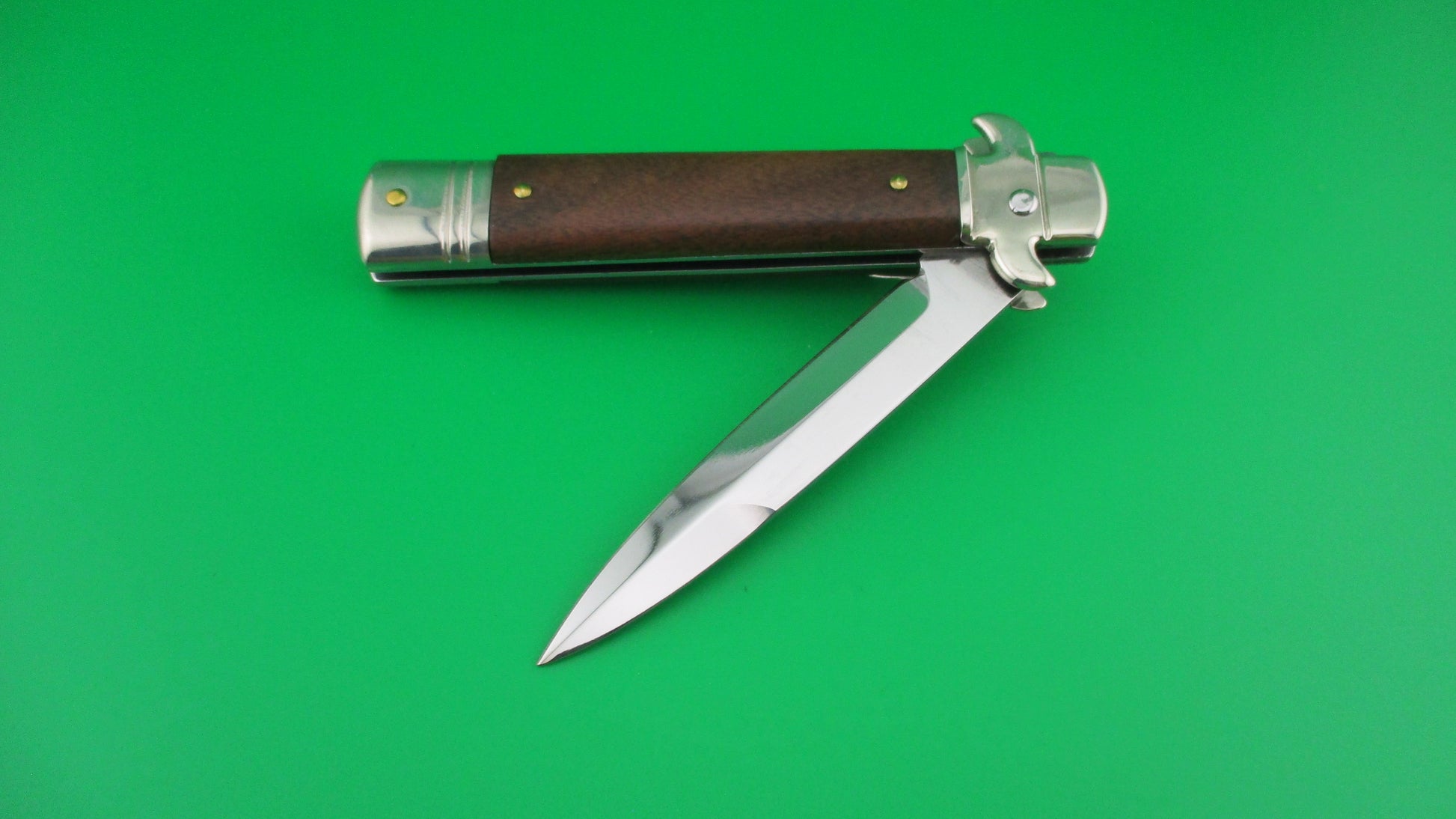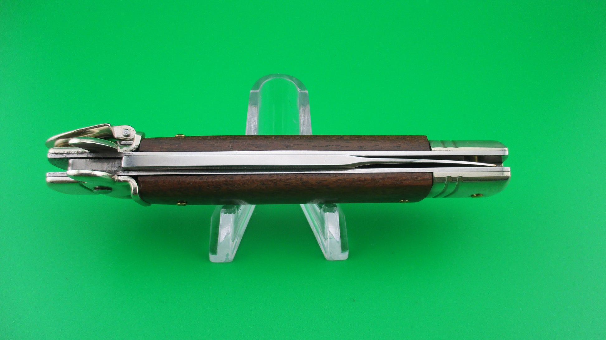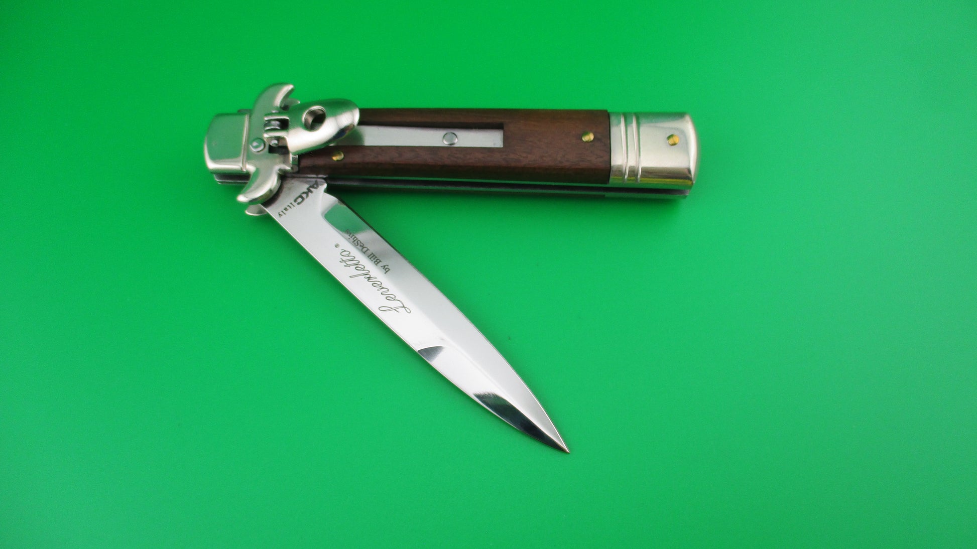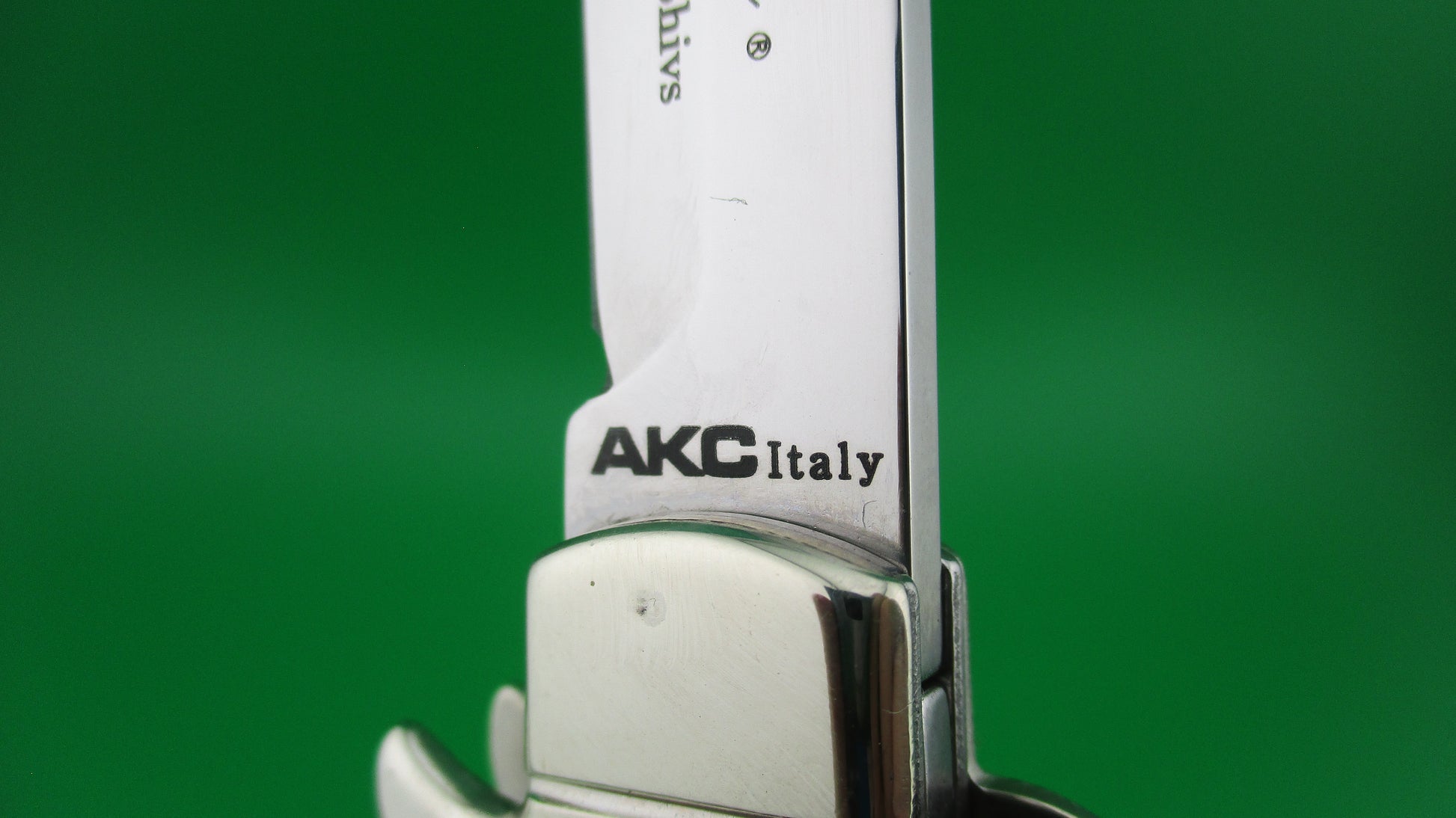 Italian AKC made Leverletto by Bill DeShivs lever activated switchblade knife. Measures 4 3/8" closed and 7 3/4 inches open with steel liners and nickel silver bolsters & lever. Bayonet style blade is full with original factory finish and is etched AKC ITALY on the ricasso and Leverletto by Bill DeShivs on the side of the blade. Wood scales in very nice condition. The knife is basically like new condition with some scuffs and handling marks. Works great, tight lockup! Nearly new condition.