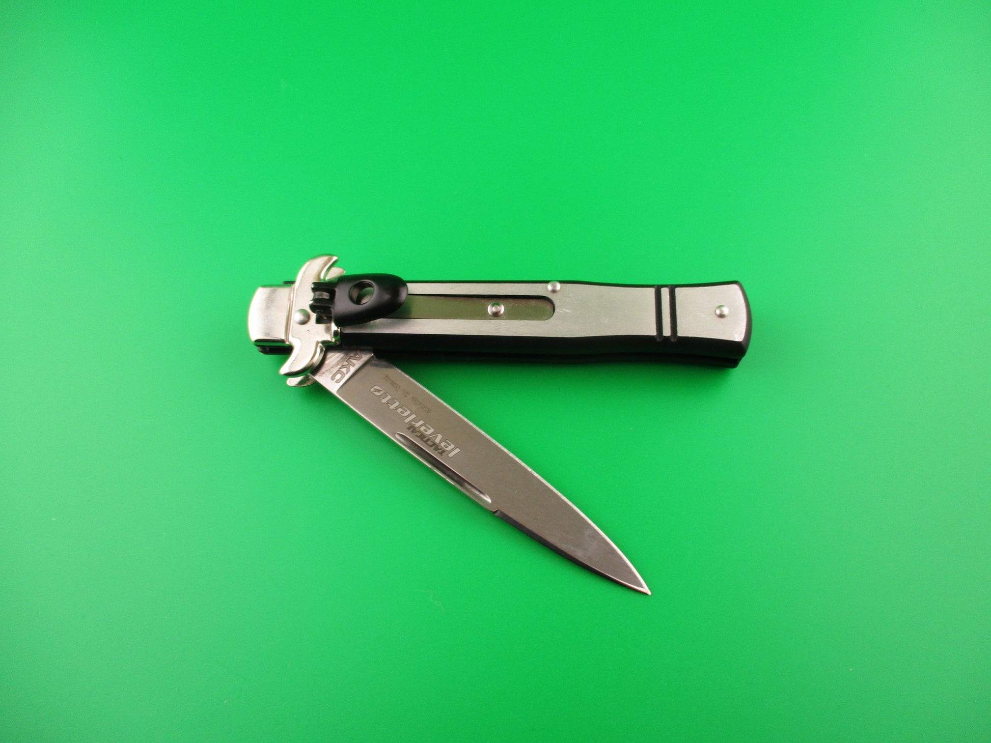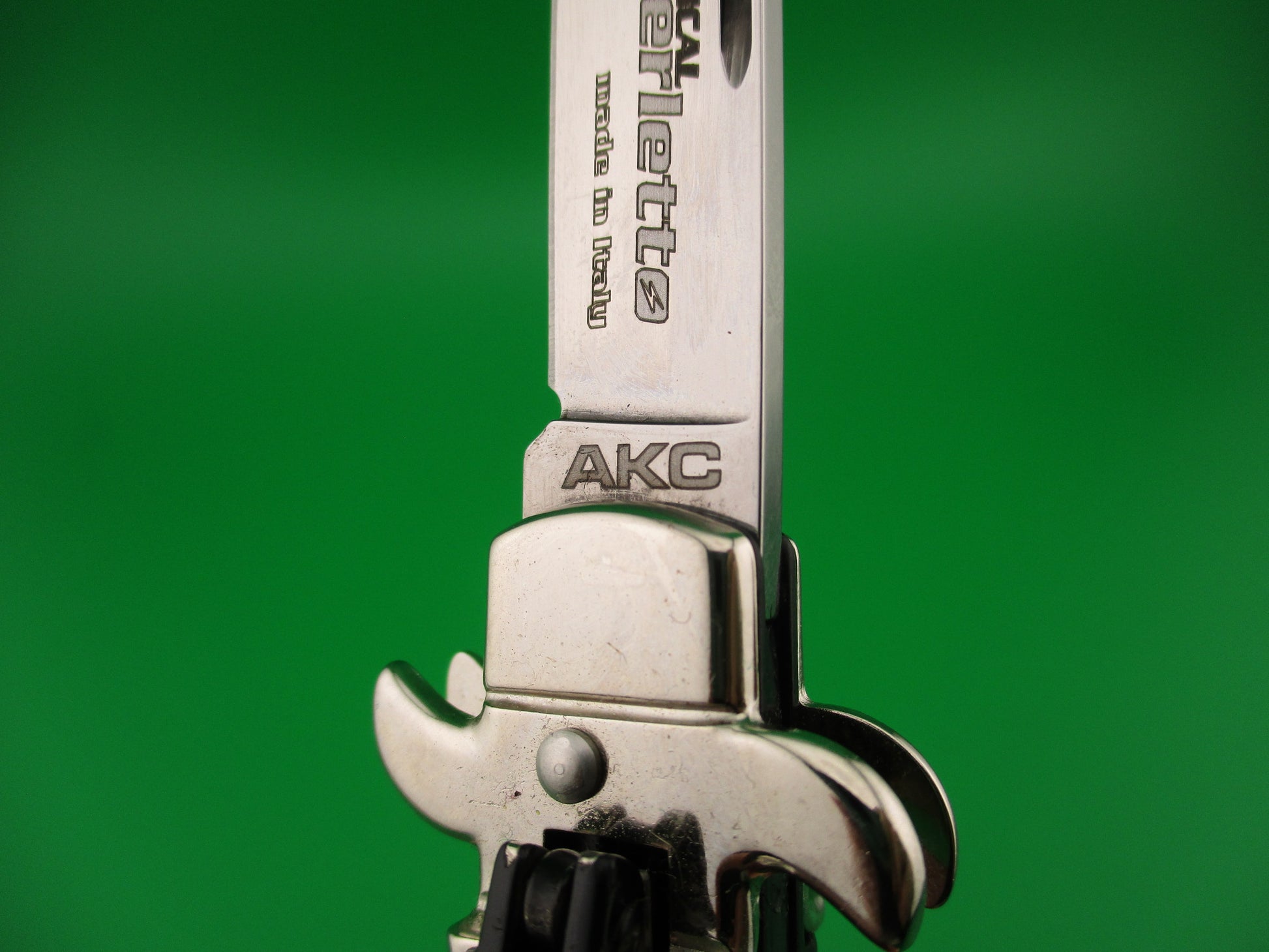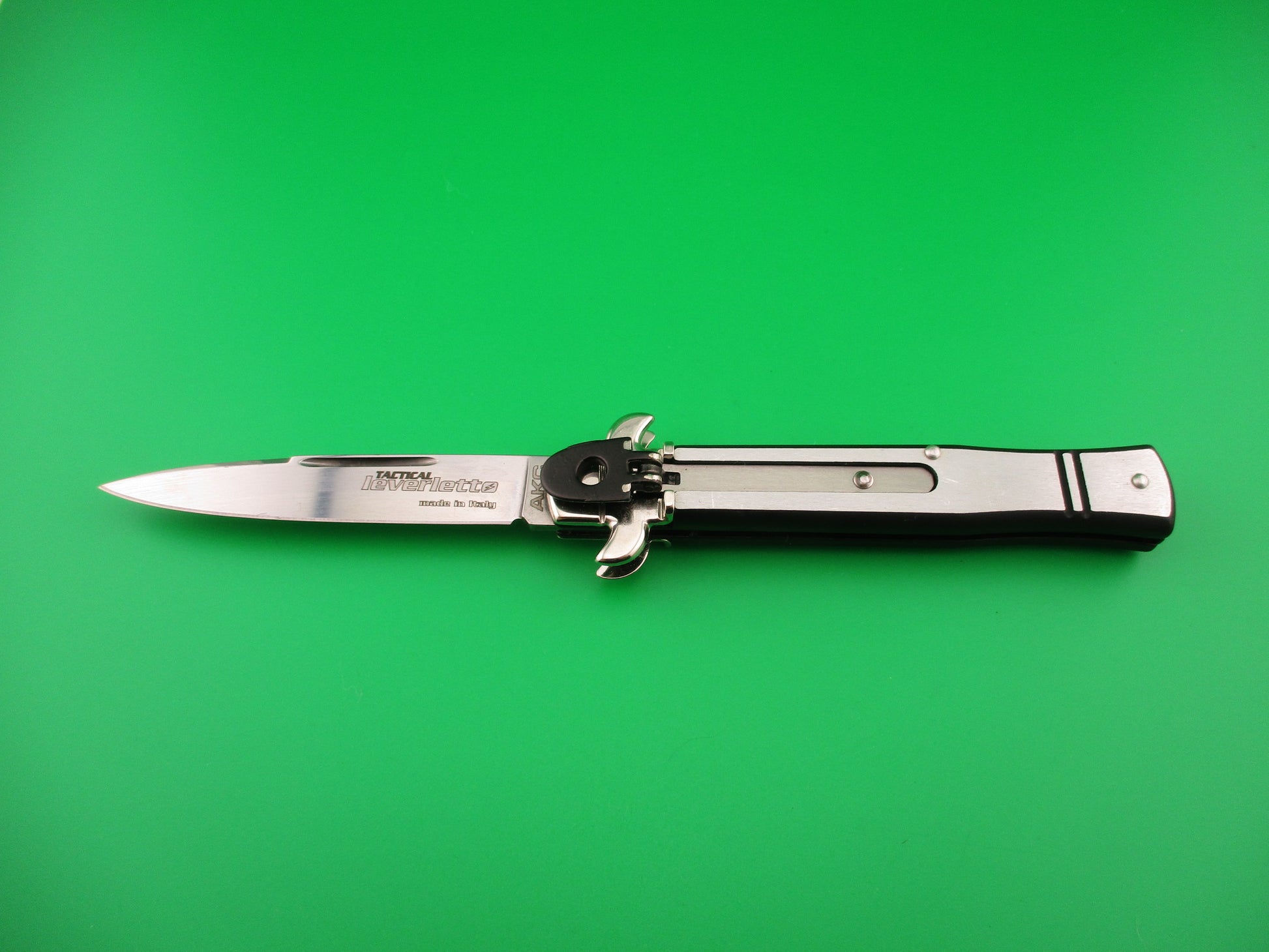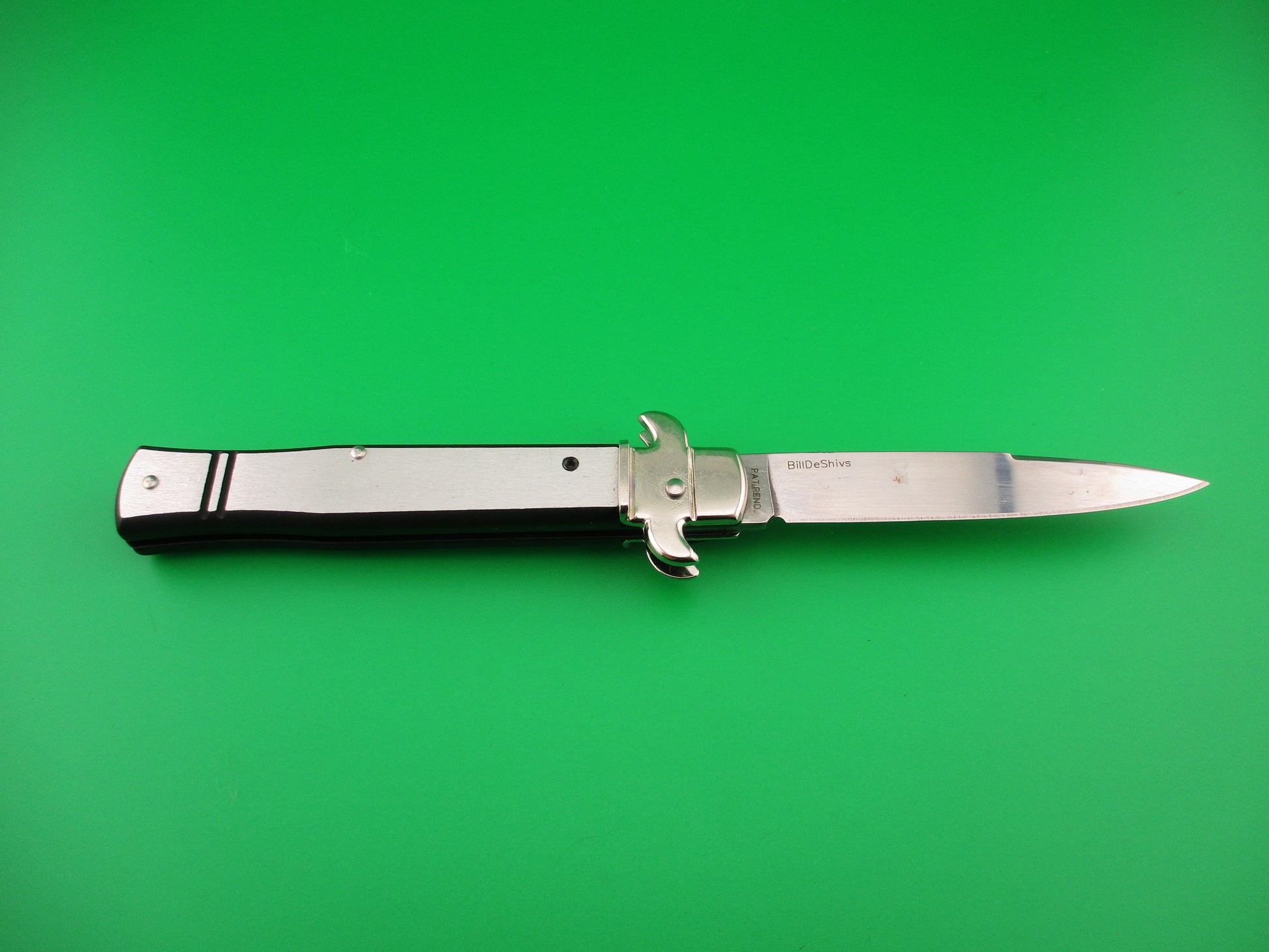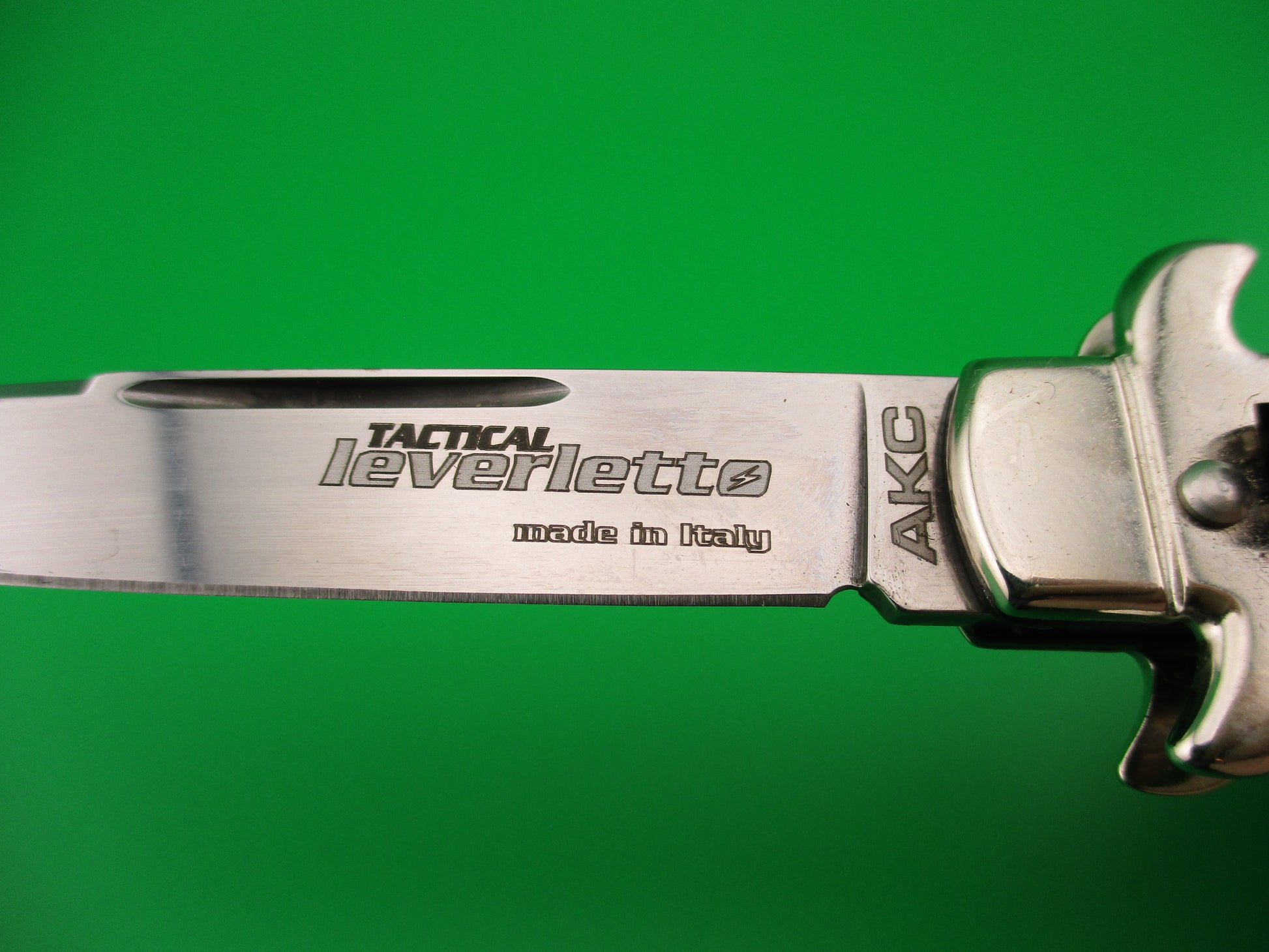 Leverletto TACTICAL AKC 20cm Italian Bill DeShivs lever automatic lever release switchblade by AKC. This knife was designed and named by a friend of mine, Bill DeShivs. This is the Tactical version with metal scales and black lever and edges. The knife measures 4 3/8" closed and 7 3/4" open with a solid black annodized aluminum frame with buffed faces. The blade is 100% full with all of the original finish and is marked TACTICAL LEVERLETTO Made in Italy on the face and AKC on the ricasso. Marked Bill DeShivs PAT PEND on the backside. There are a few minor scuffs from handling. The knife works perfectly with the blade tip seating deep closed, good snap and TIGHT lockup! Would make a GREAT EDC (every day carry).