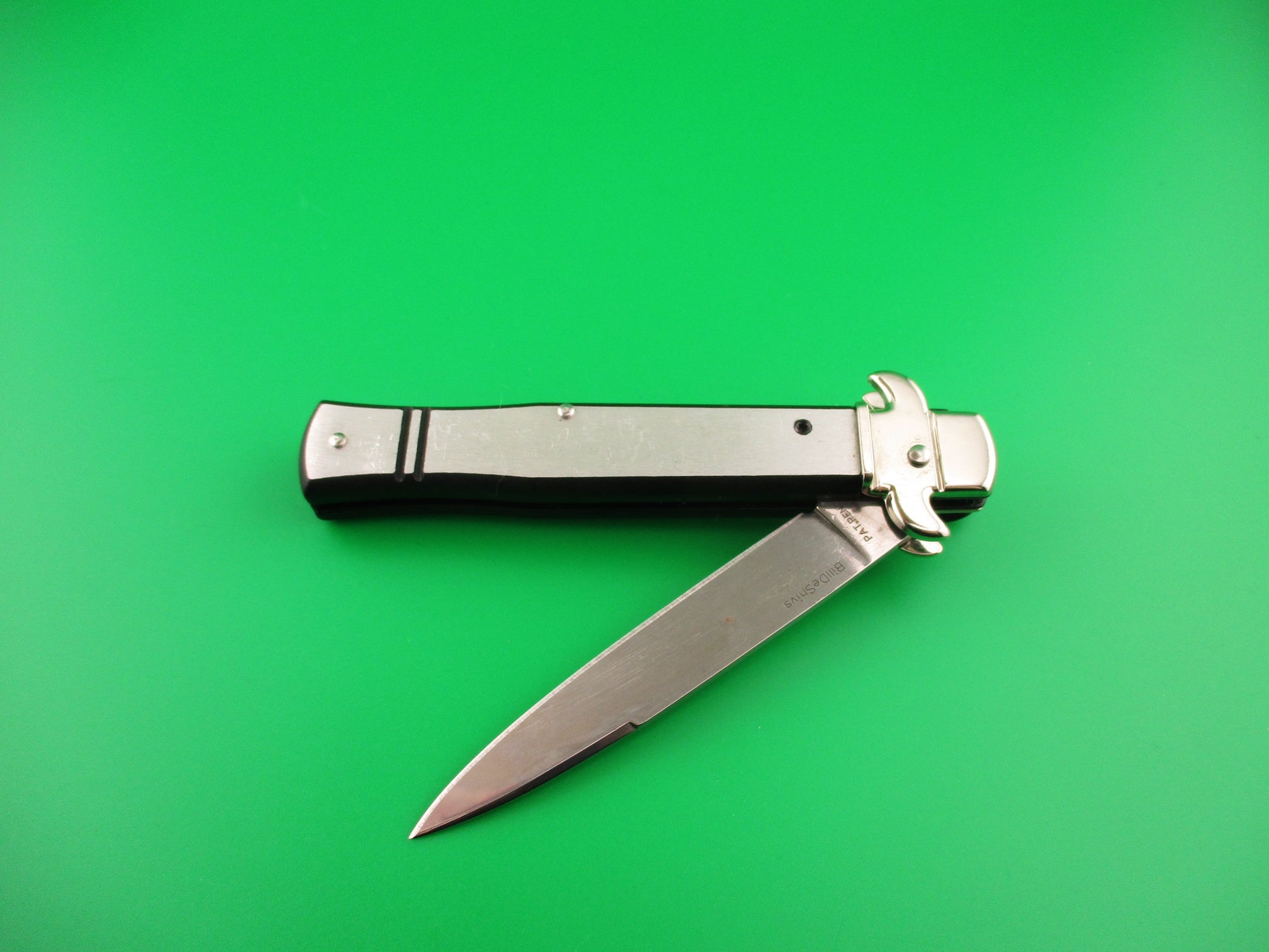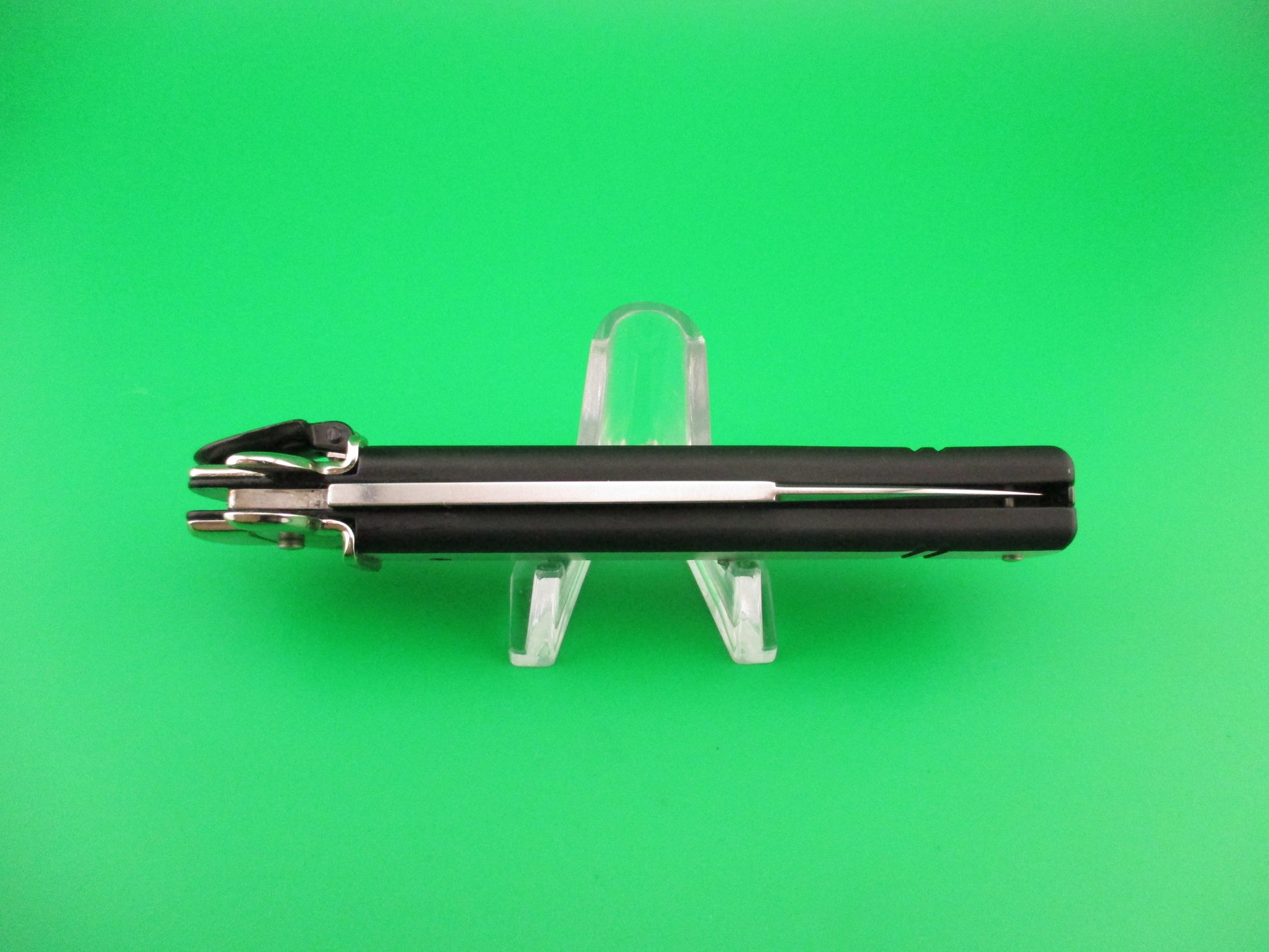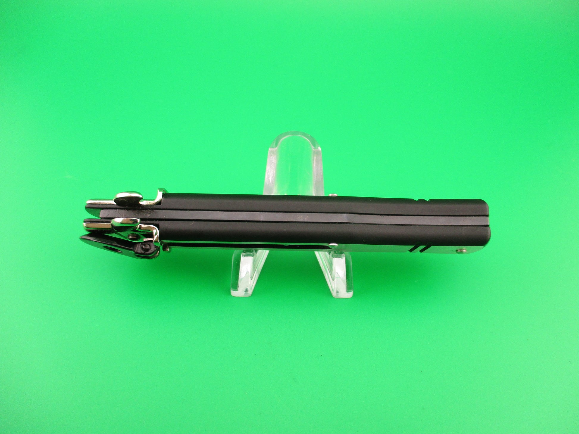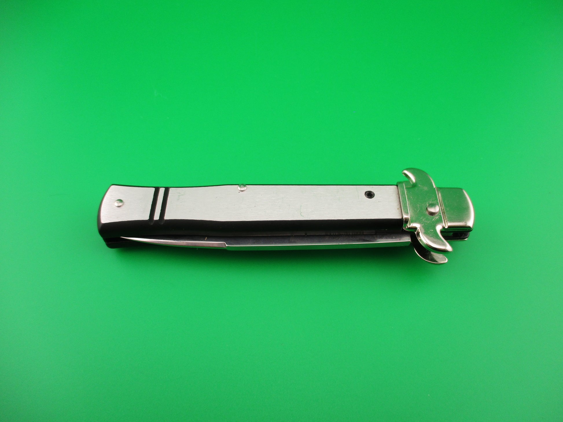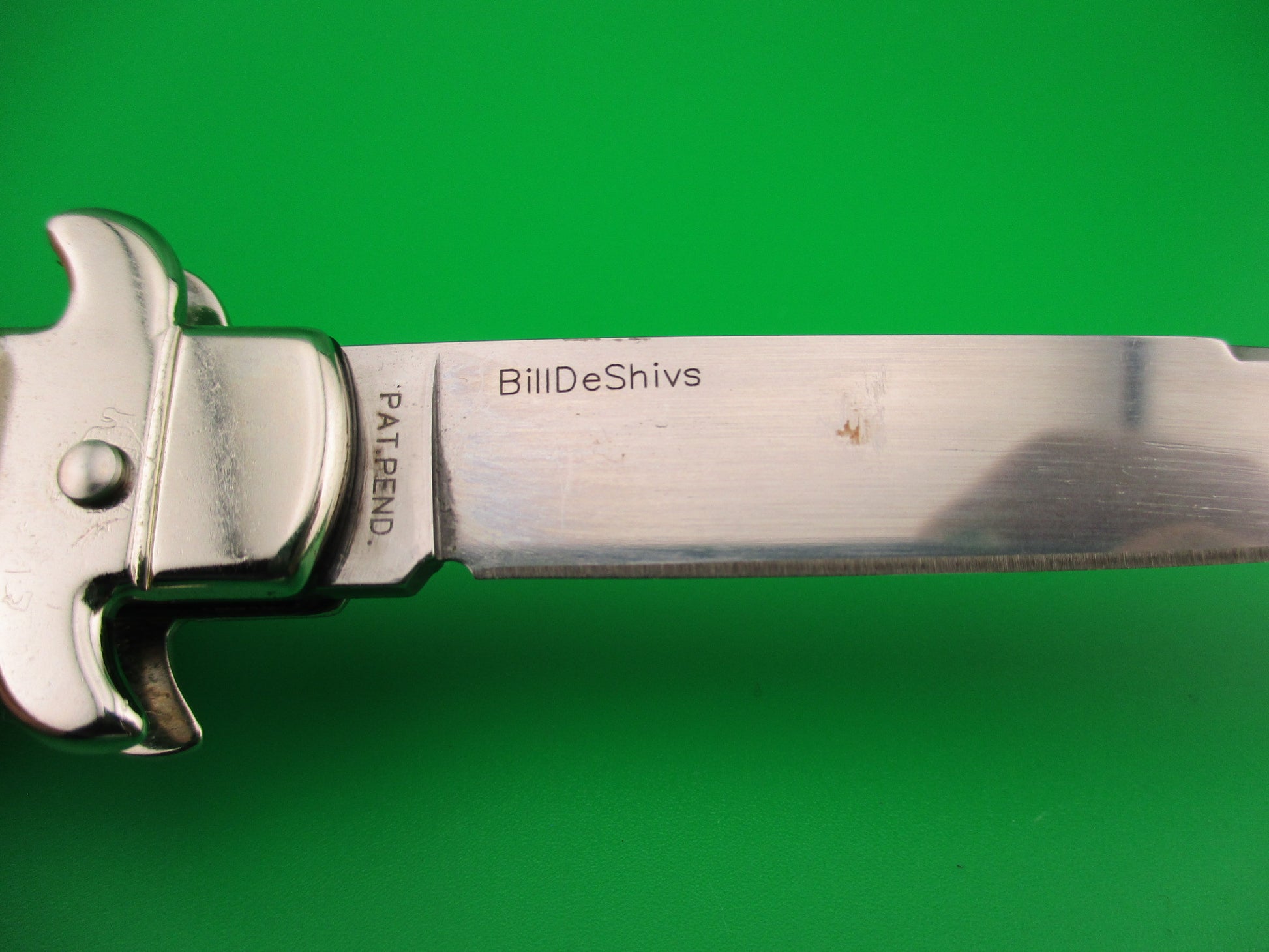Leverletto TACTICAL AKC 20cm Italian Bill DeShivs lever automatic lever release switchblade by AKC. This knife was designed and named by a friend of mine, Bill DeShivs. This is the Tactical version with metal scales and black lever and edges. The knife measures 4 3/8" closed and 7 3/4" open with a solid black annodized aluminum frame with buffed faces. The blade is 100% full with all of the original finish and is marked TACTICAL LEVERLETTO Made in Italy on the face and AKC on the ricasso. Marked Bill DeShivs PAT PEND on the backside. There are a few minor scuffs from handling. The knife works perfectly with the blade tip seating deep closed, good snap and TIGHT lockup! Would make a GREAT EDC (every day carry).