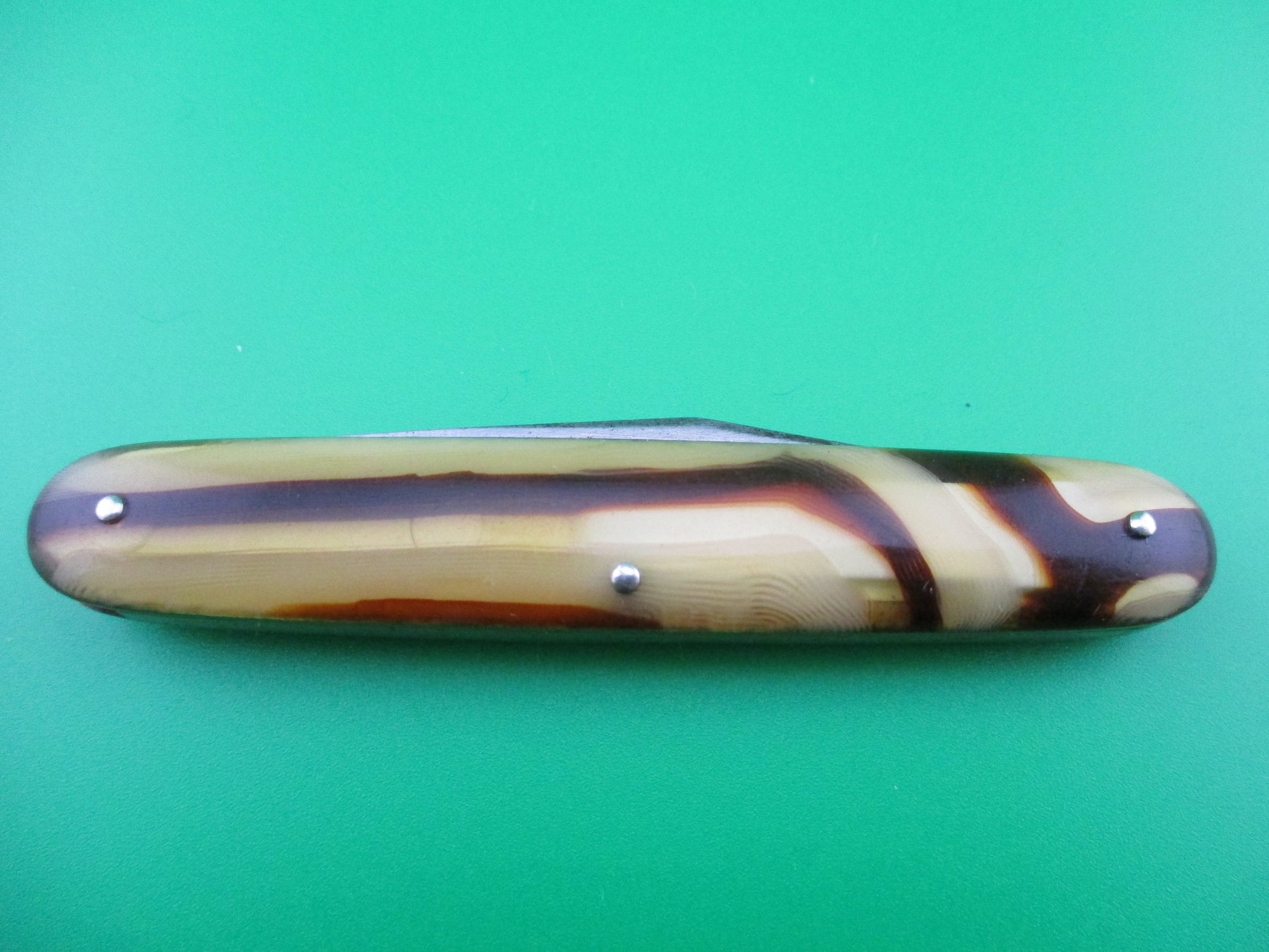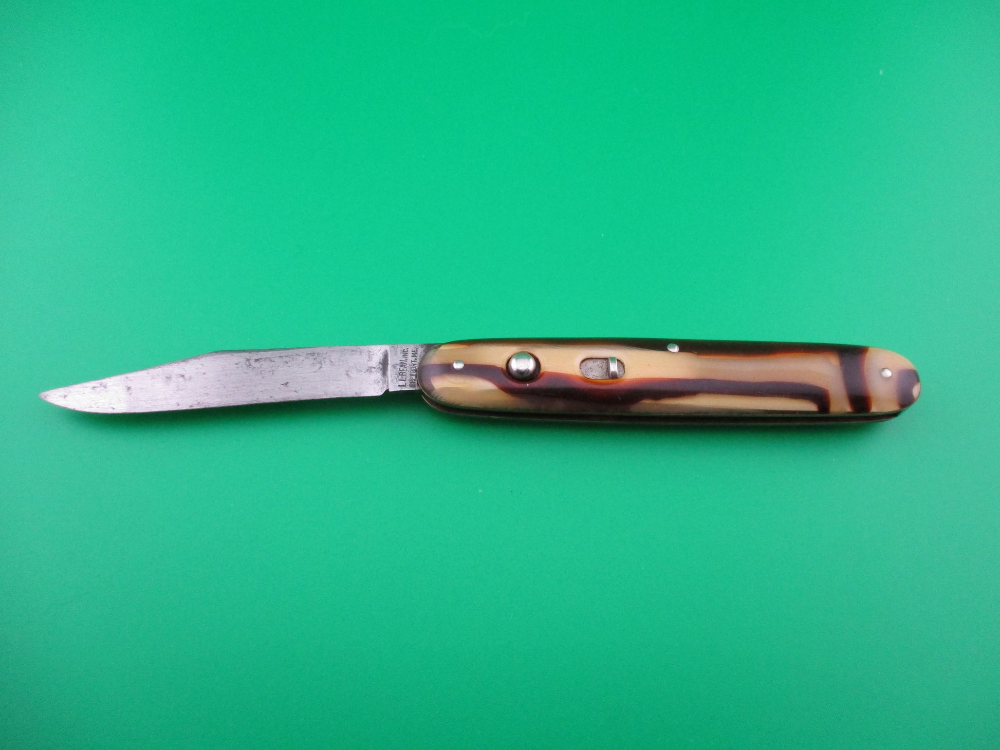 This is an LL Bean single blade switchblade made under contract by the Schrade Cutlery Co of Walden, NY for LL Bean from 1937 to 1943. It was touted to be LL's favorite pocket knife in the catalogs. It measures 3 3/8 inches closed and just under 6 inches open with brass liners. The tang is stamped LL Bean over Freeport, ME on the front and Pats 09,10 &16 on the rear. The blade is full with some of the original LL Bean etch still legible on the blade! Heavy patina and some light scratches. The Butter and Molasses celluloid scales are in excellent condition with only light signs of handling. Works great with blade tip seating deep, good snap and good lockup. I do have an original LL Bean catalog featuring the knife that I would offer to the winner at a low price.