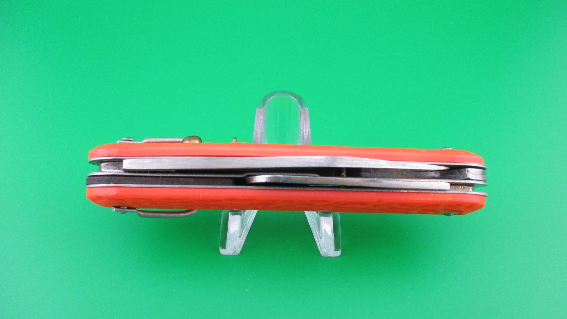 Logan Smyth MC1 Orange military paratrooper switchblade knife. This knife was made for the US government under contract , but they could not meet the quality standards set for them, so they lost the contract back to Camillus within a year in the 1990s. Main blade opens automatically by pressing the button and the hook blade opens manually. Typically paratroopers deployed with the hook blade in the open position for quick emergency use. The knife measures 4.25 inches closed and 7 3/8 inches with clip blade open and it has steel liners. The clip blade is marked LOGAN/SMYTH VENICE, FL and is full with original factory finish and some scratches. The hook blade is like new and has spring tension as it should. The orange jigged scales are in great condition with just a little shrinkage. The knife works great with the blade tip below the liners when closed, good snap and locks open with about 1/16 inch up and down at the tip. Comes wrapped in the original paper that it would have been issued with. Safety works. EX+ condition.