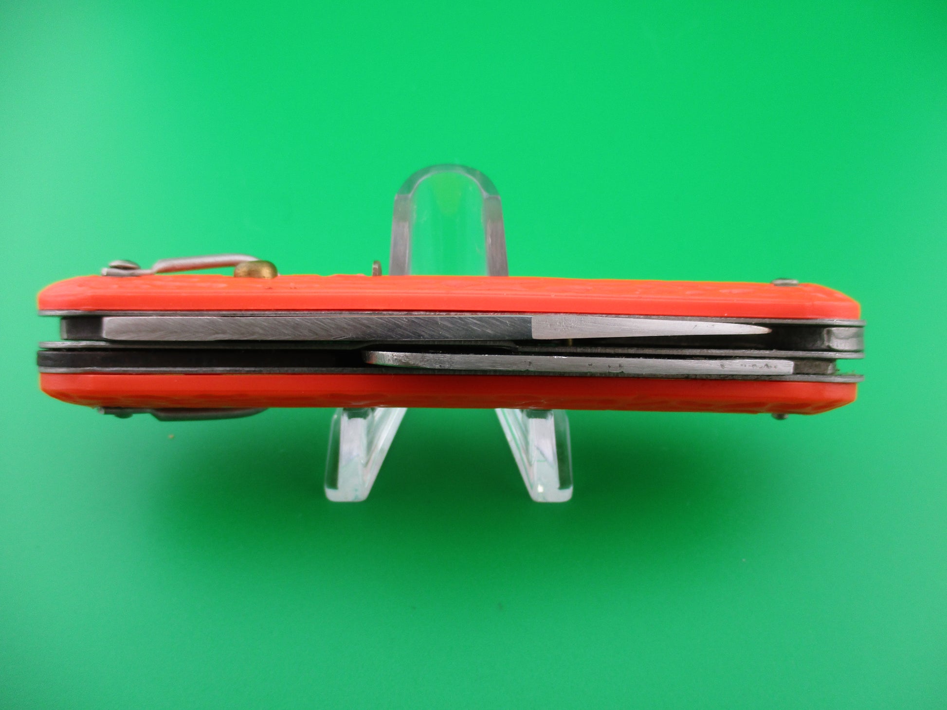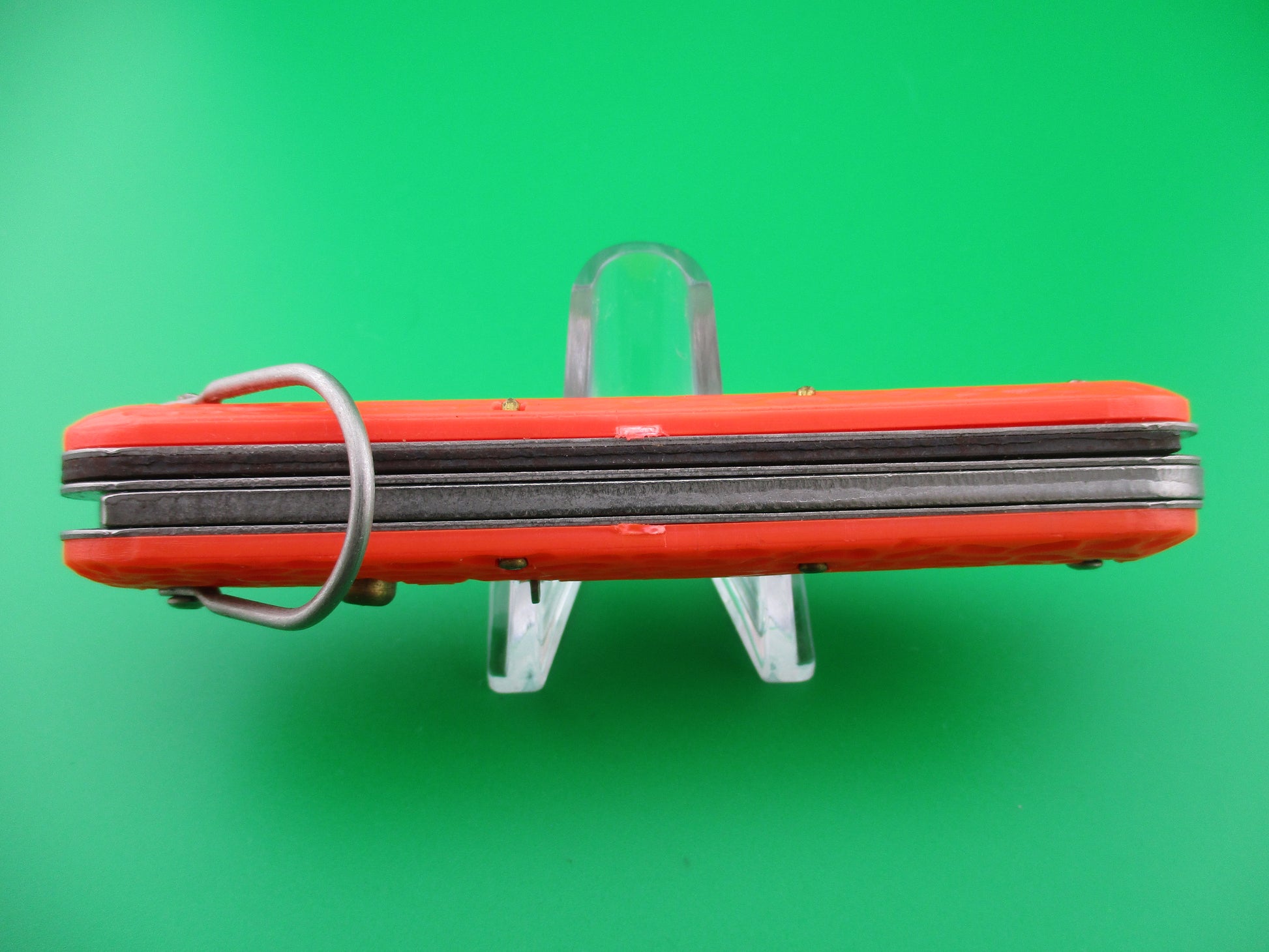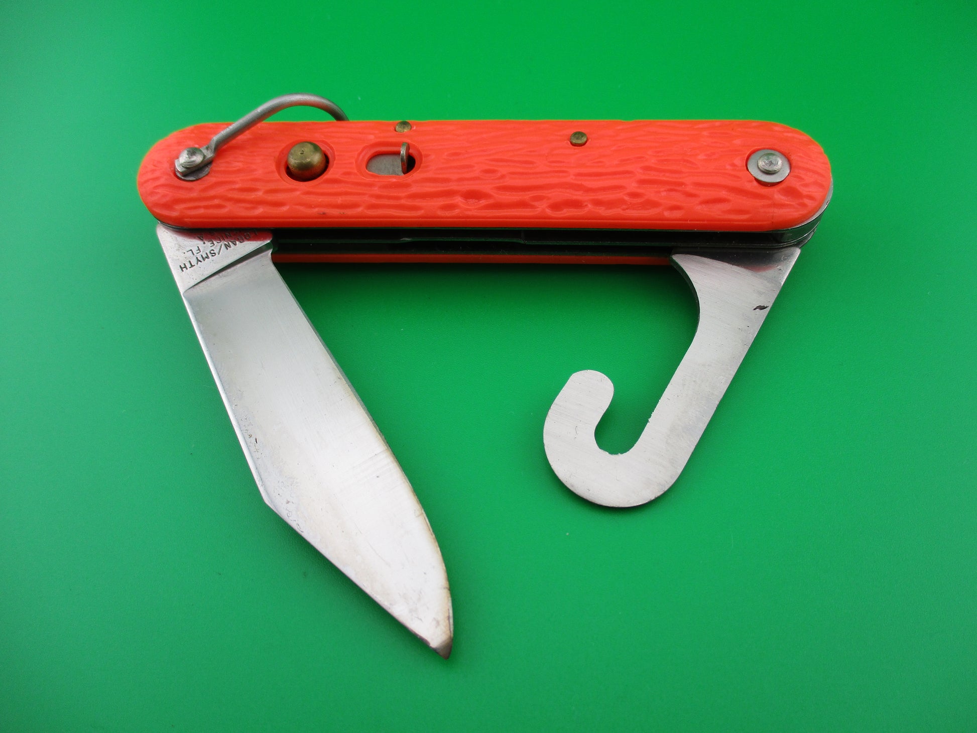 Logan Smyth MC1 Orange military paratrooper switchblade knife. This knife was made for the US government under contract , but they could not meet the quality standards set for them, so they lost the contract back to Camillus in the 1990s. The knife measures 4.25 inches closed and 7 3/8 inches with clip blade open and it has steel liners. The clip blade is opens automatically by pressing the button and the hook blade opens manually. Typically paratroopers deployed with the hook blade in the open position for quick emergency use. The clip blade is marked LOGAN/SMYTH VENICE, FL and is full with original factory finish and some scratches. The hook blade is like new and has spring tension as it should. The orange jigged scales are in great condition with just a little shrinkage. The knife works great with the clip blade seating deep in the well closed, good snap and average lockup when open with just a little up and down and side to side. Safety works. Near mint condition.