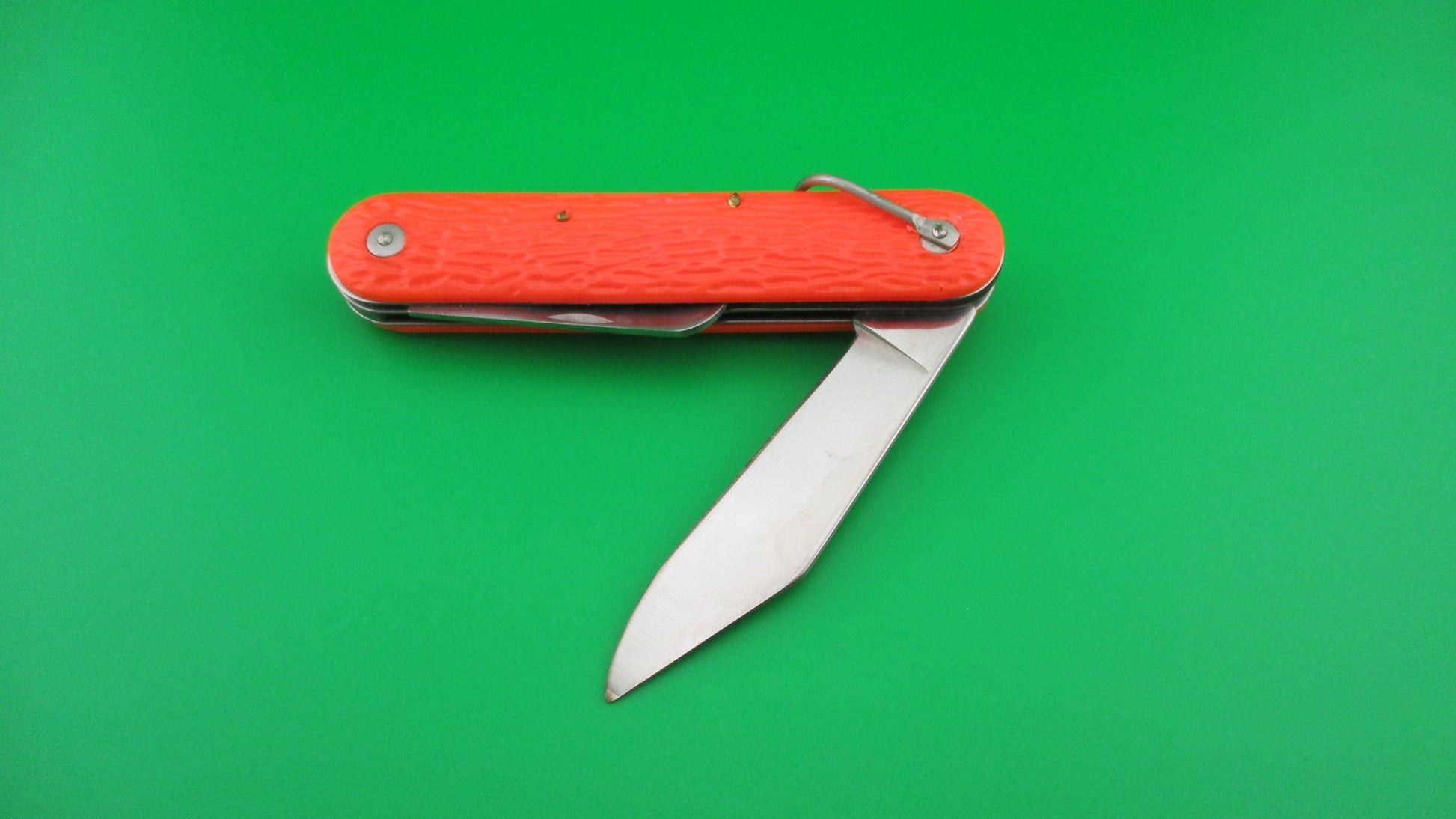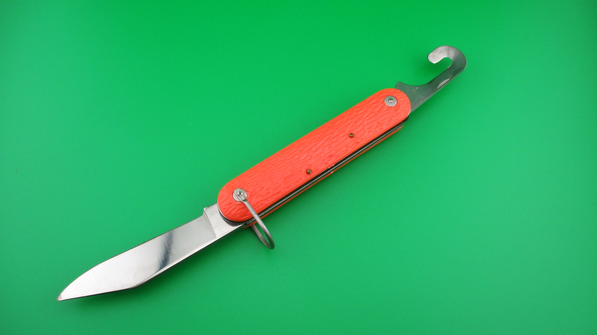 Logan Smyth MC1 Orange military paratrooper switchblade knife. This knife was made for the US government under contract , but they could not meet the quality standards set for them, so they lost the contract back to Camillus in the 1990s. The knife measures 4.25 inches closed and 7 3/8 inches with clip blade open and it has steel liners. The clip blade is opens automatically by pressing the button and the hook blade opens manually. Typically paratroopers deployed with the hook blade in the open position for quick emergency use. The clip blade is marked LOGAN/SMYTH VENICE, FL and is full with original factory finish and some scratches. The hook blade is like new and has spring tension as it should. The orange jigged scales are in great condition with just a little shrinkage. The knife works great with the clip blade seating deep in the well closed, good snap and average lockup when open with just a little up and down and side to side. Safety works. Near mint condition.