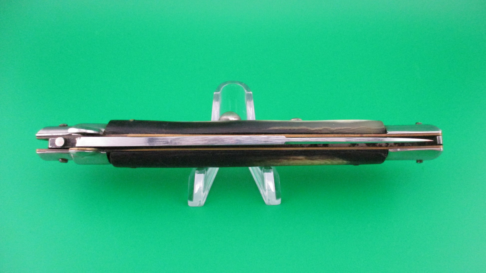Vintage M ITALY INOX 28cm Vintage Italian transitional switchblade knife. This is a swivel bolster release transitional stiletto made in the 1960s. It measures 27.6cm (10 15/16 inches) open with brass D stamped liners and nickel silver bolsters, button and safety cap. The flat grind swedge blade is marked M ITALY INOX in a circle and is nearly full with light scratches from light sharpening/use. The Brazilian horn scales are in very good condition and range from black, tan, translucent green to cream. The knife works well with the blade tip below the liners closed, strong spring and good lockup with just a little movement each way at the tip. Nice example of a vintage Italian transitional stiletto switchblade. Safety works. VG+ condition.