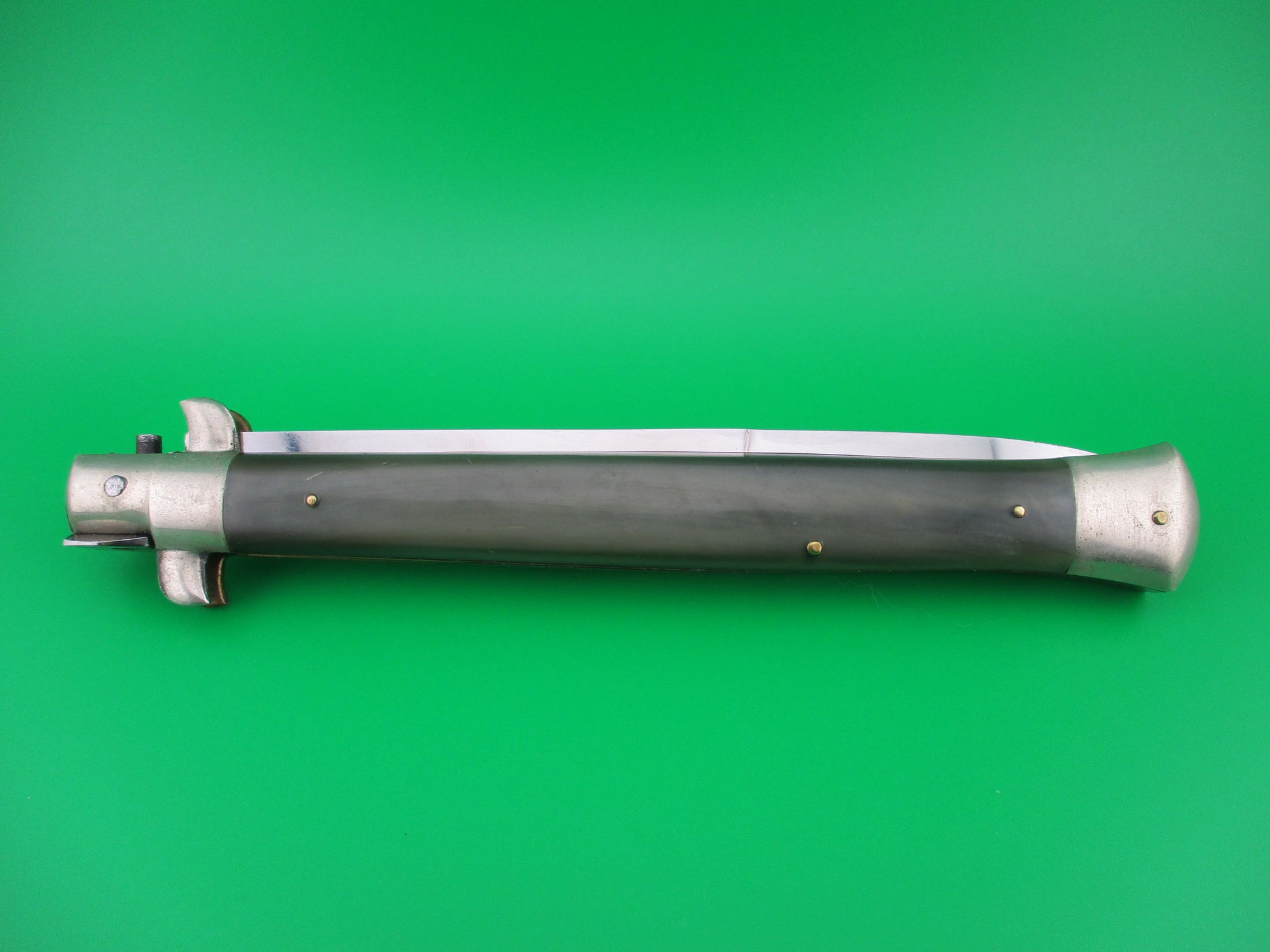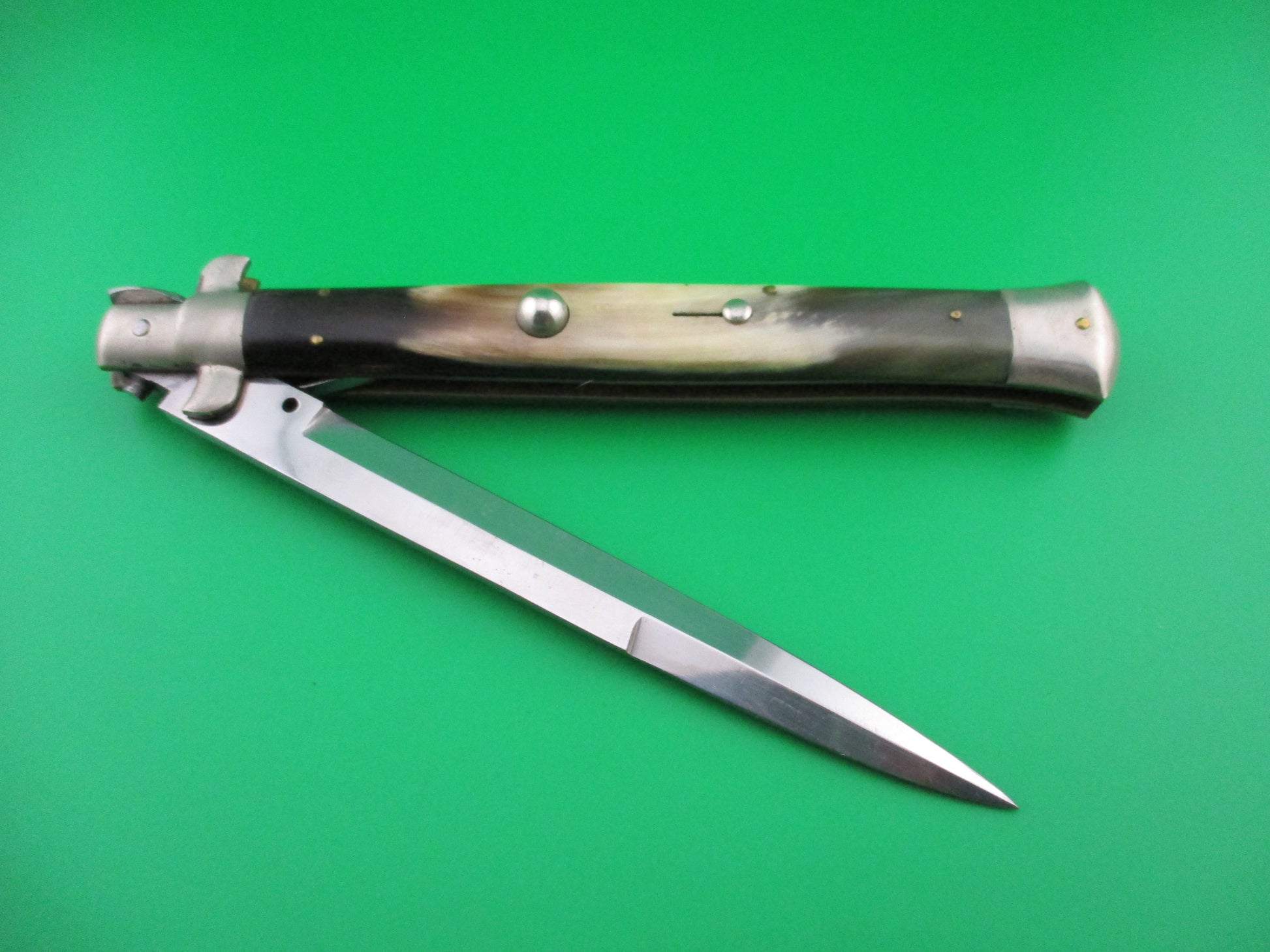 M ITALY INOX 33cm Italian Picklock Vintage 1950s automatic knife. This is a Gorgeous old picklock that measures 33.3cm (13 1/8" open) with D Stamped brass liners, nickel silver bolsters, button and safety cap. The blade is beautiful and full with original factory finish and is stamped M ITALY over INOX inside an oval. Thick 5mm backspring. Beautiful Brazilian horn with colors ranging from dark brown to tan to cream to translucent green (back scale) and in excellent condition. The knife functions perfectly with blade tip deep and centered when closed, strong snap and great lockup with a tiny bit of side to side at the tip. Safety works. EX+ condition.