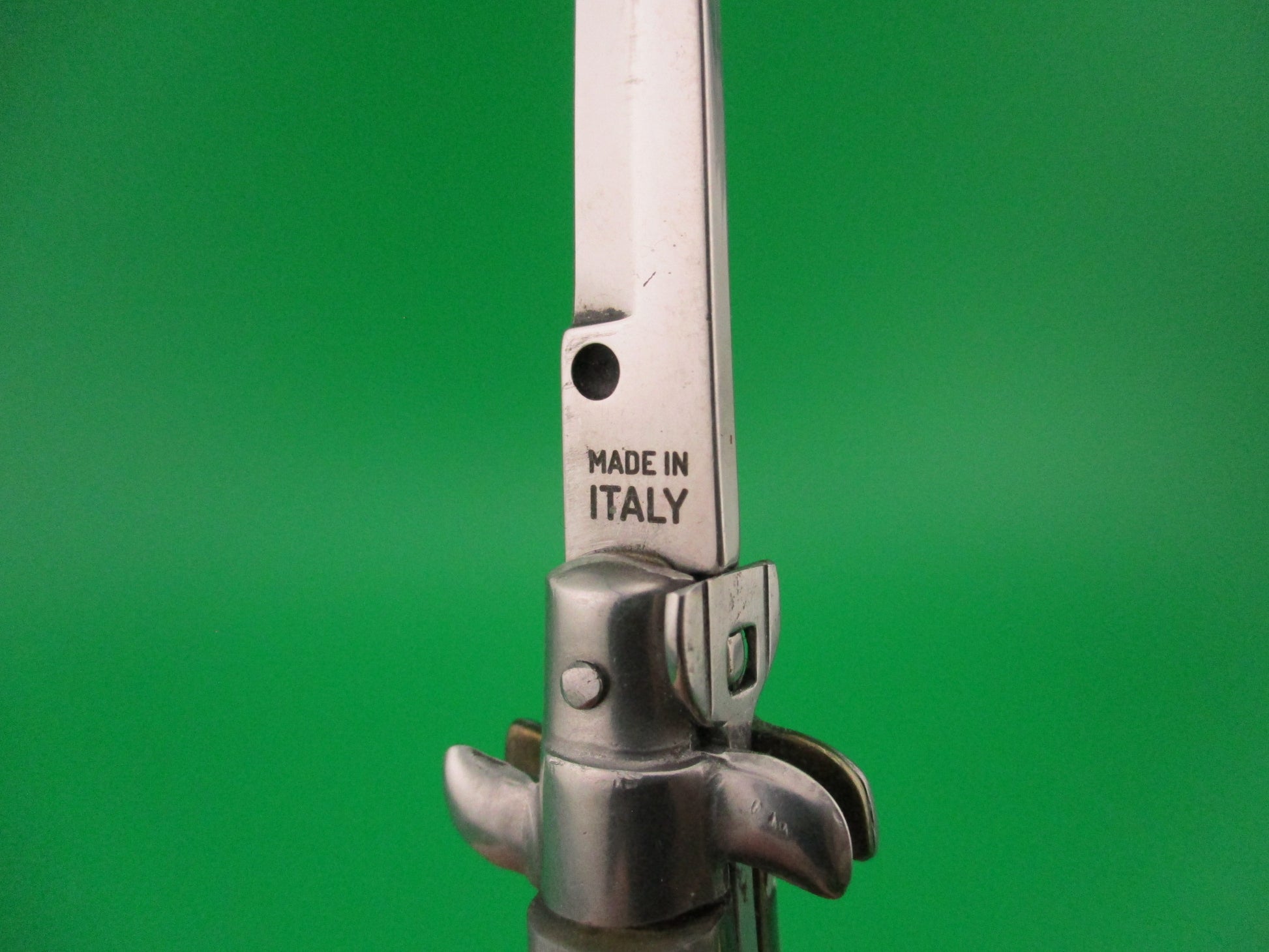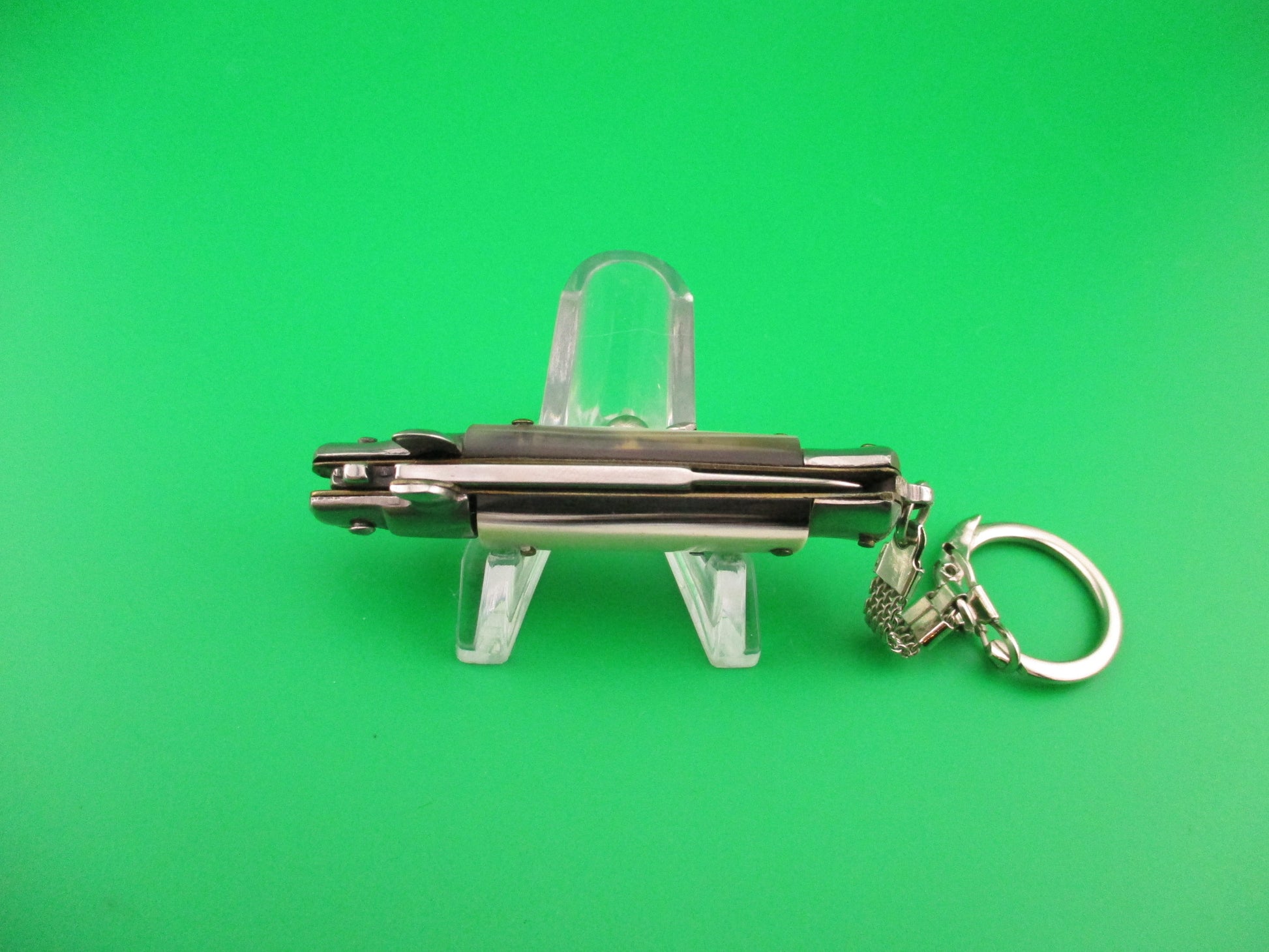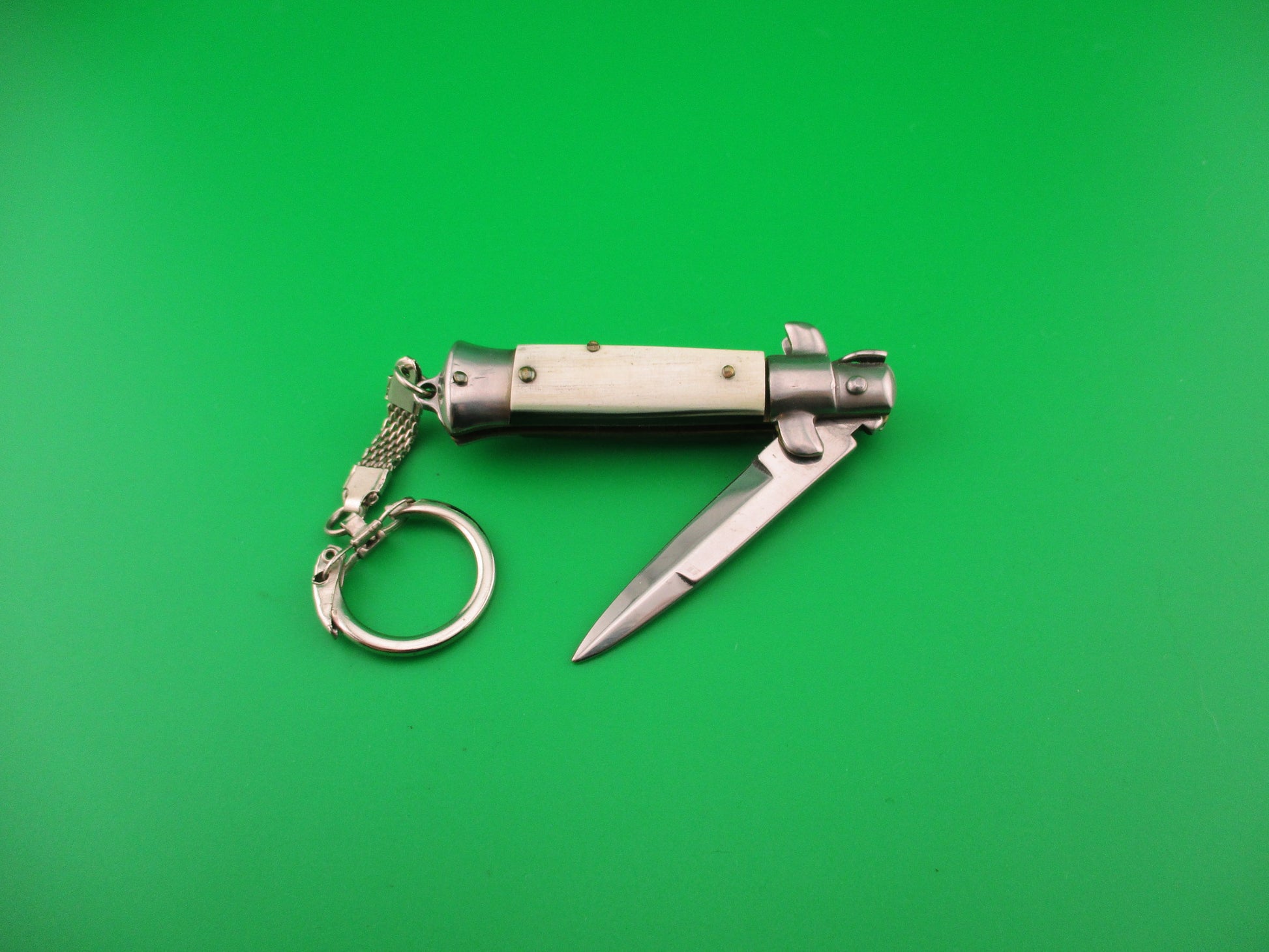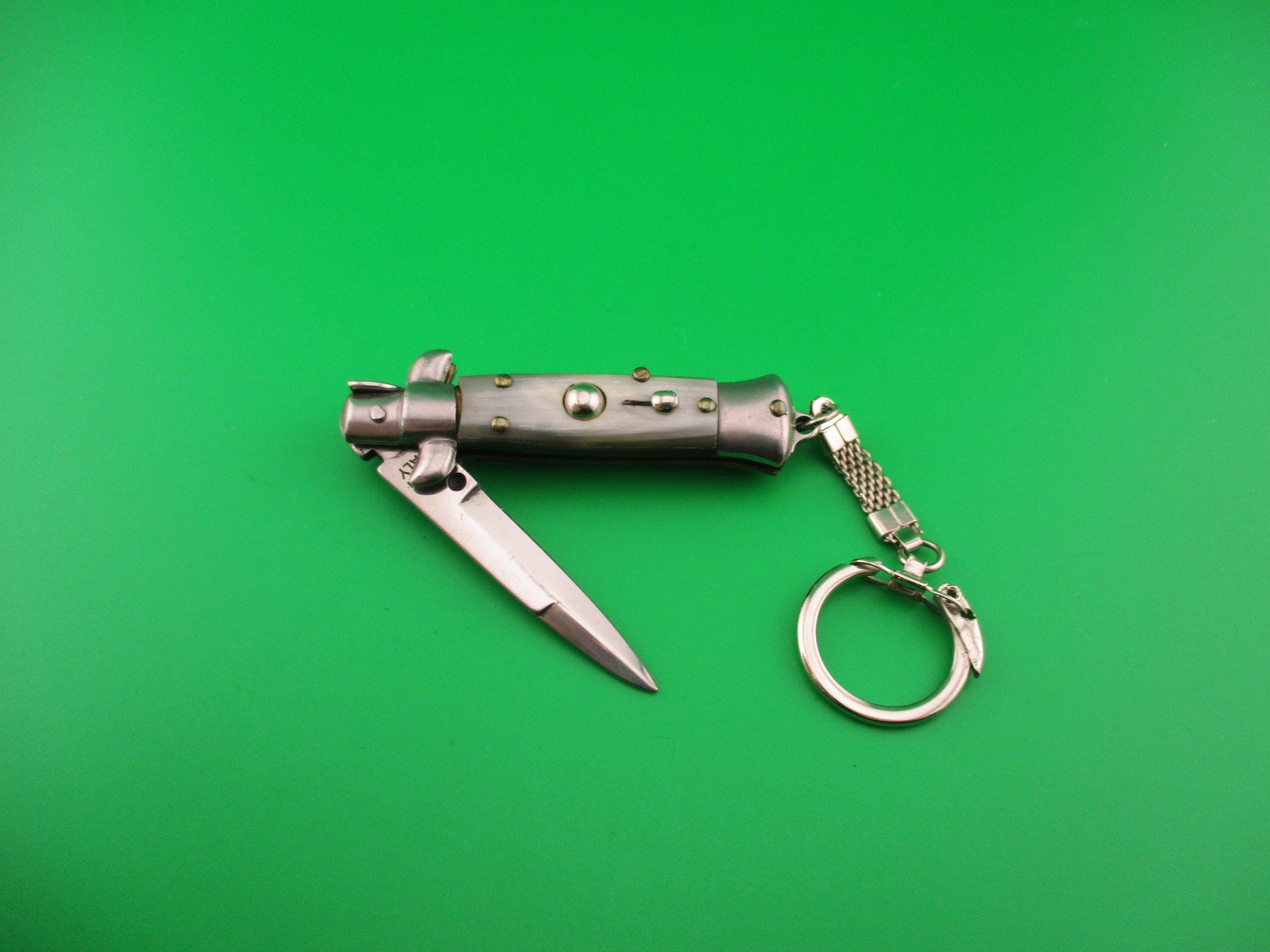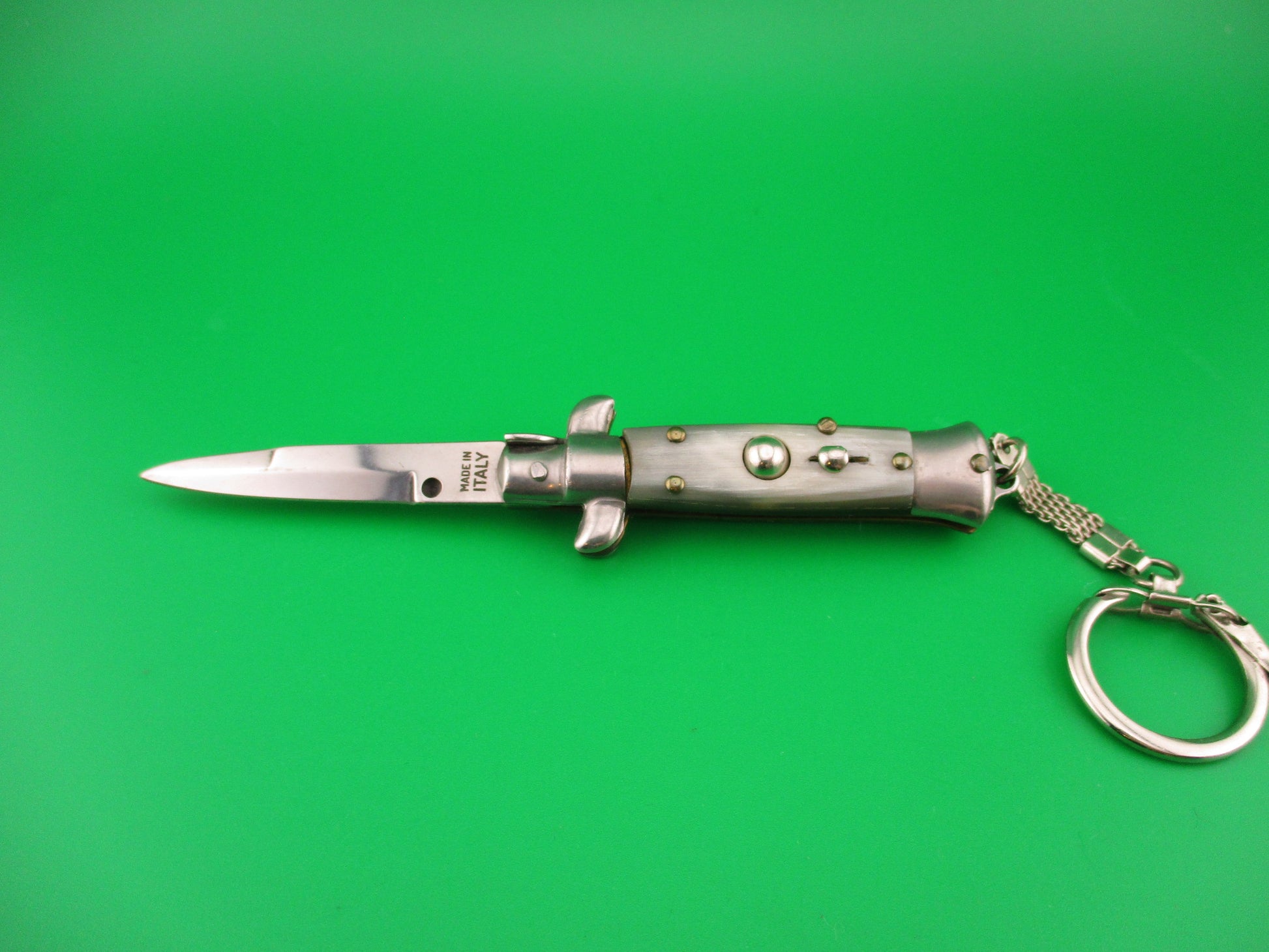 MADE IN ITALY 12cm Italian Large Keychain Swivel bolster horn automatic knife made in Italy post 1990. It measures 12cm (4.75 inches) open including bump on the bottom to connect chain and 2.75 inches closed with brass liners and steel bolsters, button & safety cap. The bayonet blade is 100% full with original finish and ricasso is stamped MADE IN ITALY. The handles (scales) are genuine horn white, black & gray in great condition. The knife works well with blade tip deep & centered, strong snap and Tight lockup open. Safety works, but slides a bit when button pressed. Don't see many in this size & quality. EX+ condition.