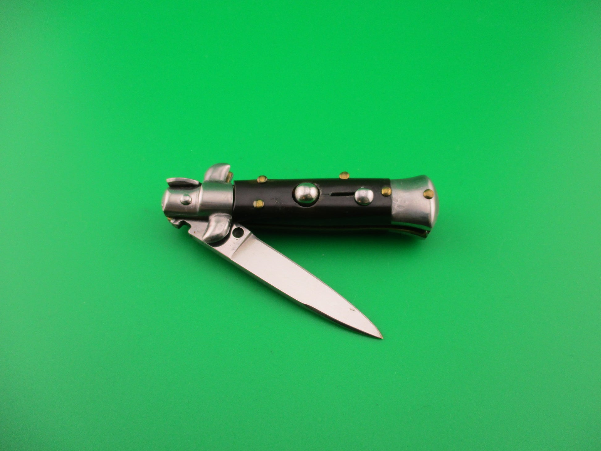 MADE IN ITALY 12cm Italian Swivel bolster dark horn vintage automatic knife made post 1980 in Italy. It measures 11.8cm (4 11/16 inches) open and 2 5/8 inches closed with brass liners and steel bolsters, button & safety cap. The finger guards on the back side are brass lined, so likely made in 1980s, or 90s. The flat spear blade is 100% full with original finish and the ricasso is stamped MADE IN ITALY. The blade locking tab has a square hole. The genuine horn scales (handles) are basically black and in great condition. The knife works well with the blade tip deep & centered closed, strong snap and excellent lockup. EX+ condition.