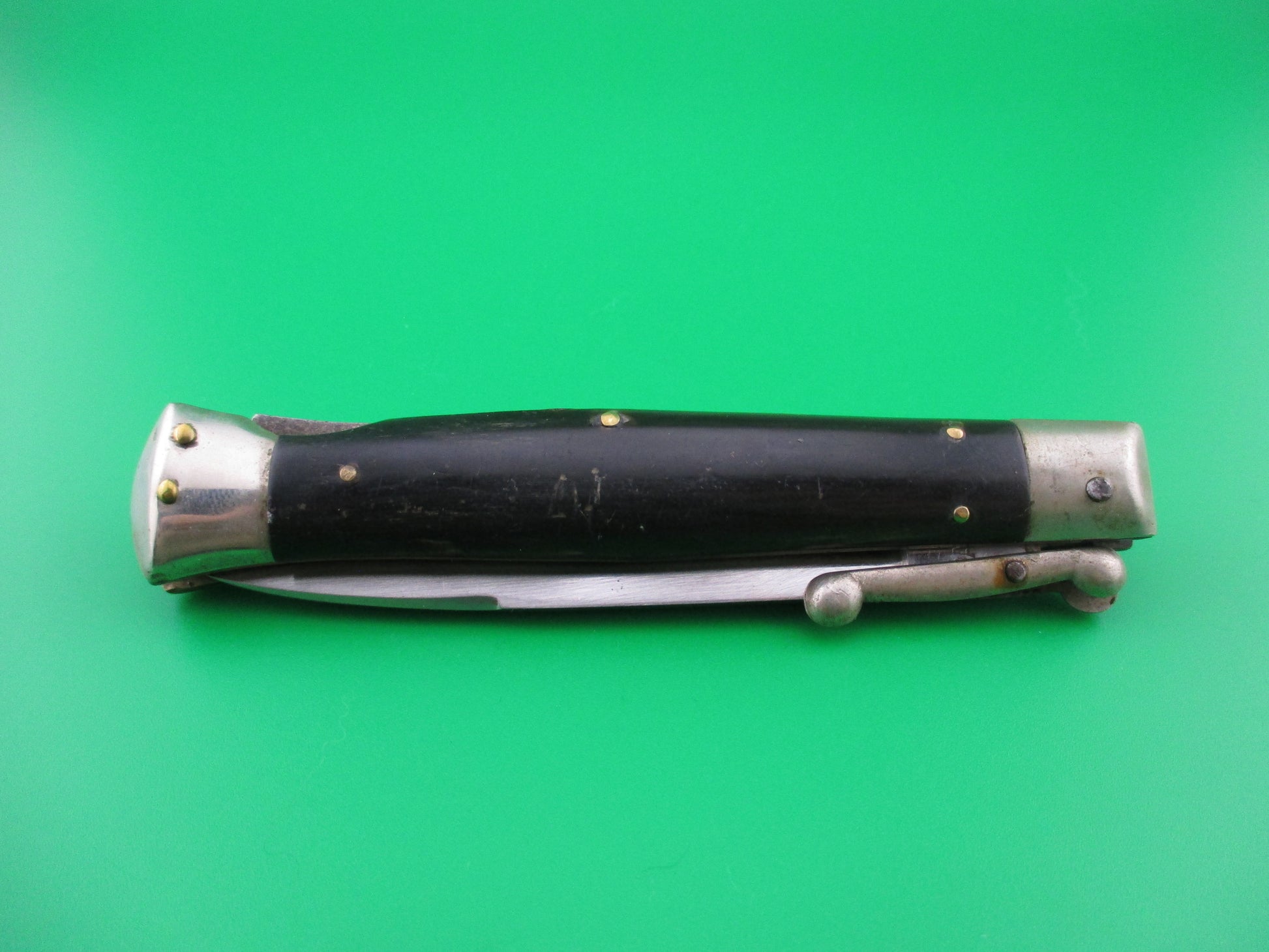 Vintage Italian Swinger from the 1960s. Measures 20.5cm open (8") with brass liners and nickel silver bolsters, guards, button & safety cap. The blade is 97% full with much of the original factory finish still intact under lots of light scratches from sharpening and use that could be easily cleaned off. The blade is marked MADE IN ITALY INOXID on the front and PATENT on the back of the tang. This knife has a Red Dot safety and the horn scales are in very good condition, with some handling marks. The front scale is nearly black with tan streaking in the middle and the back scale is basically black. The knife works well with the blade tip seating well below the liners when closed, good snap and good lockup with just a little movement. The safety works well. This is a backspring release knife so you have to push down on the tab near the bottom bolsters to close the knife. There is some spotting on the backspring, but not bad. Overall a good honest working example of a 1960s vintage Italian swing guard switchblade.