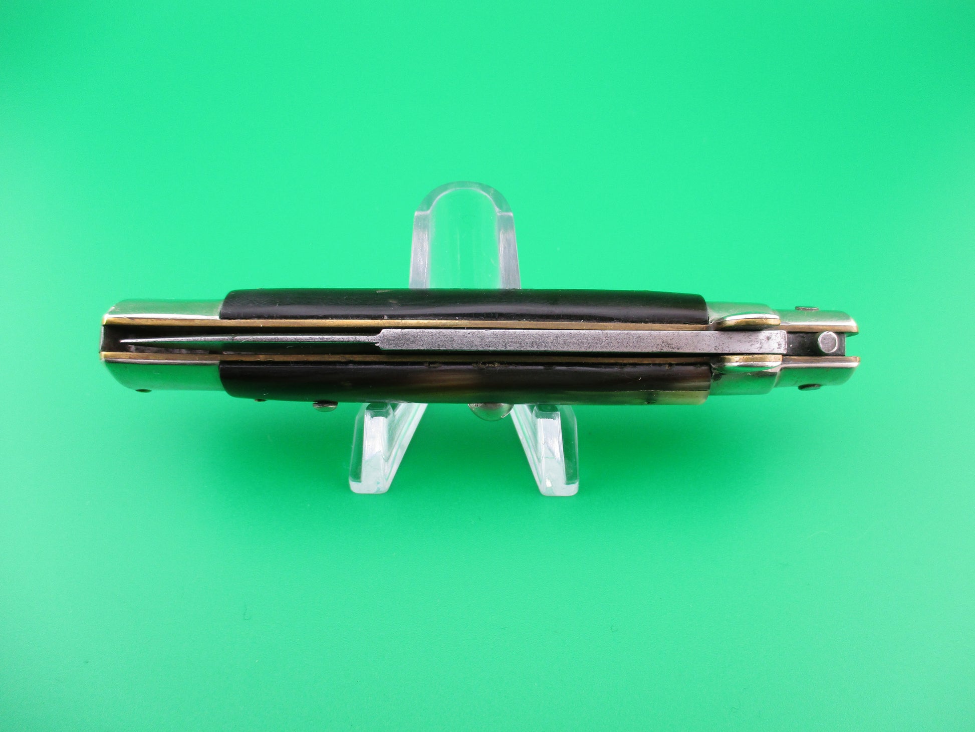 This is a 1950s vintage Italian picklock. The knife measures 20.5cm ( just over 8 inches) open with brass D stamped liners and nickel silver bolsters, button & safety cap. The bayonet style blade is nearly full with patina and spotting and is stamped MADE ITALY on the ricasso. The horn scales range in color from black to green to cream with a little brown streaking and are in very good condition. The knife works good with blade tip even with the liners, good snap and good lockup with a little movement each way at the tip. The spring is a little short and hits on the blade edge when closing. Would be good idea to replace it someday, but works okay as it is. Safety works. EX- condition.