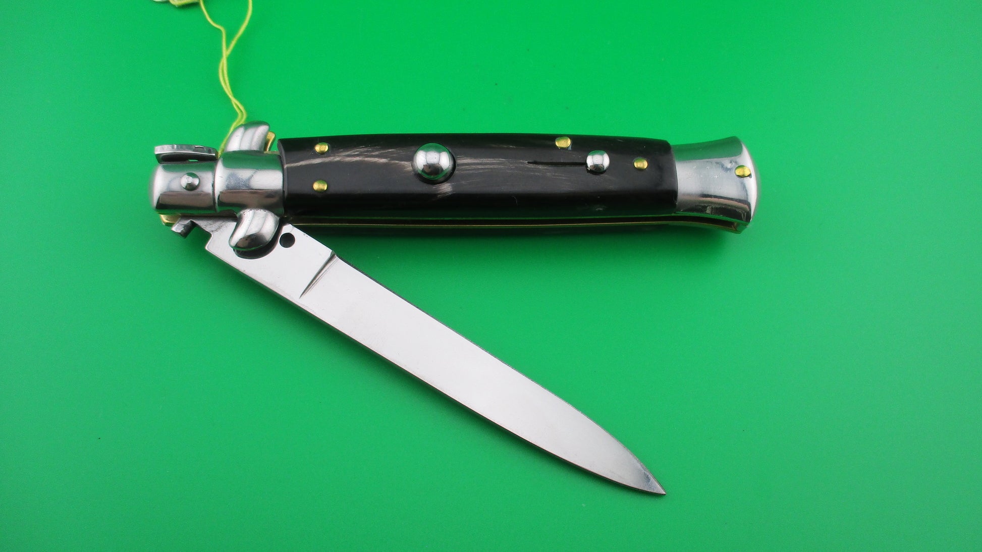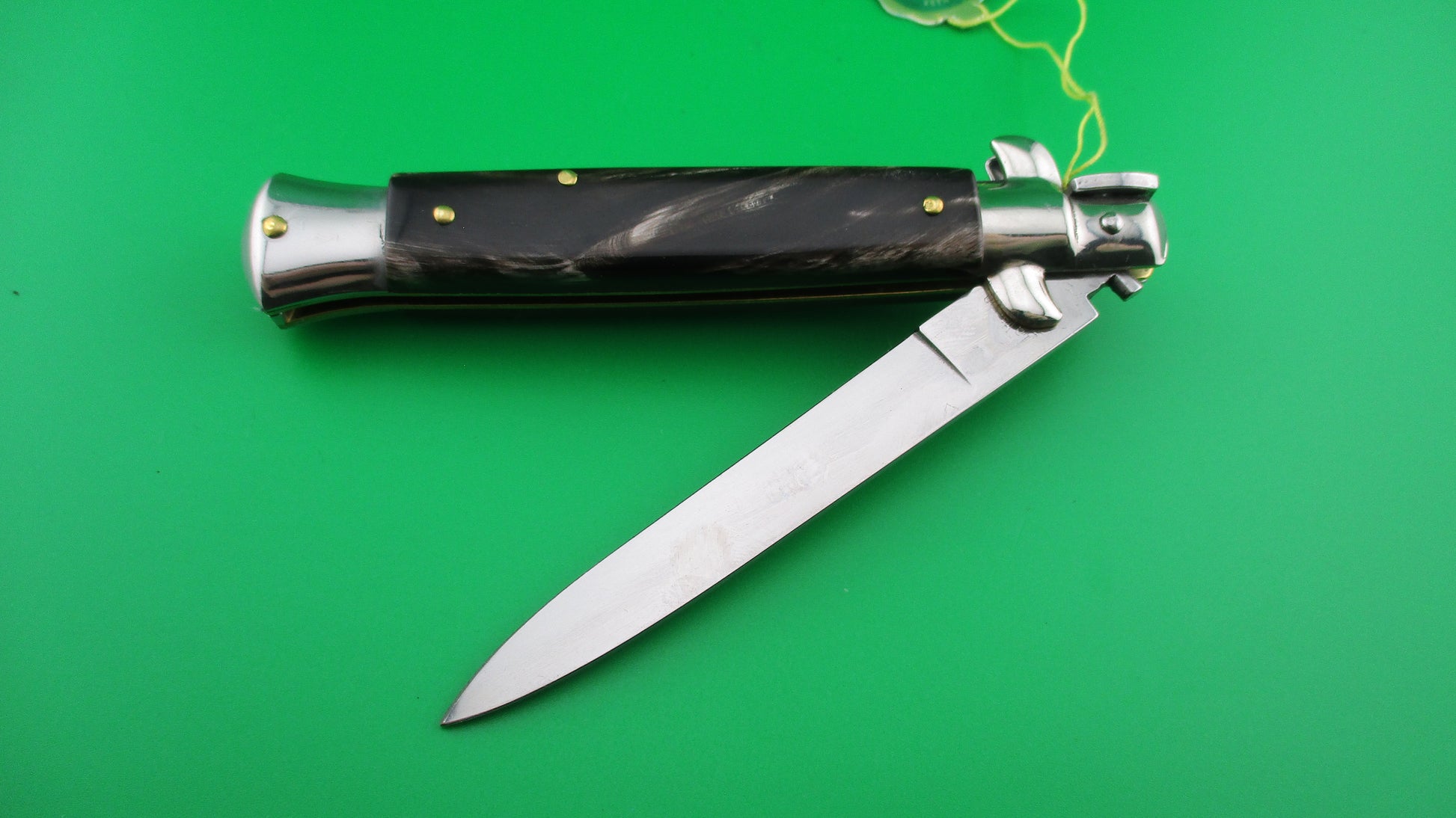 MADE ITALY LaVespa 23cm Italian Stiletto Swivel bolster vintage switchblade knife from the 1980s, or 90s. It measures 22.2cm (8.75 inches) open with brass liners, three steel bolsters, button & safety and one nickel silver bolster (top rear) with brass lined finger guards. The flat grind blade is 100% full with original factory finish and is stamped MADE ITALY on the ricasso and LaVespa on the backside. Horn scales are in excellent condition, are held on with brass pins and are mostly black in color with white and tan streaks. The knife works like new with blade tip deep in the well closed, strong snap and TIGHT lockup open. Safety works. New condition.