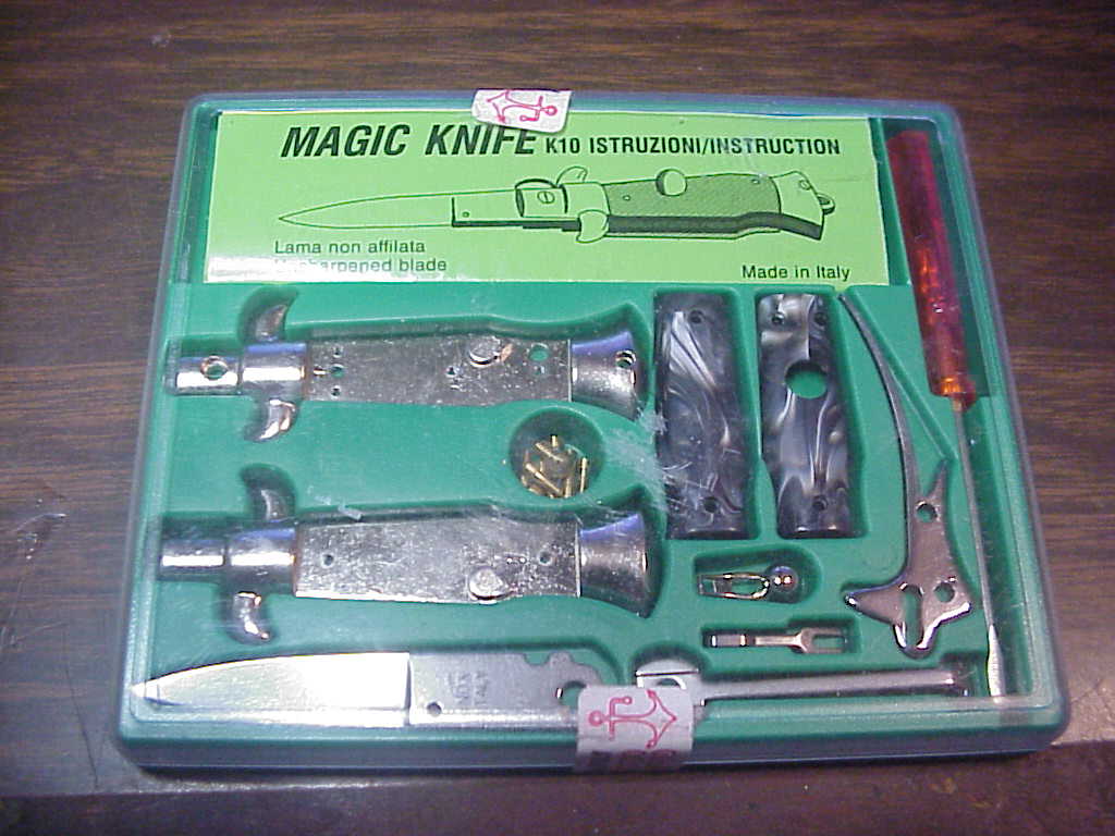 Cute little Magic Knife kit from Italy. All the parts needed to put your own keychain size switchblade automatic knife together. Includes screw driver. New Old Stock still sealed.