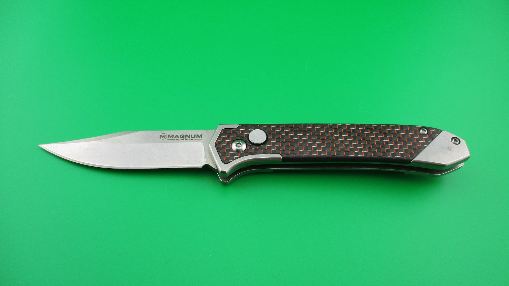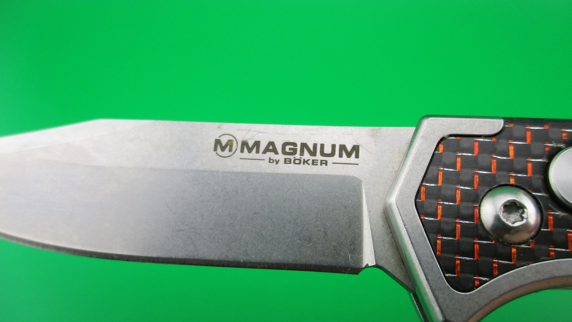 MAGNUM by BOKER 20cm 440A Coilspring Automatic knife measures 19.5cm (8.25 inches) open with steel liners and button. The saber grind clip blade is 100% full with factory finish and factory edge and is etched M (in a circle) MAGNUM By BOKER on the front below the spine and 440A on the backside. Wild 3D checkered pattern changes as you turn it to the light, mostly black, orange and silver. The knife works perfectly with blade tip deep closed, strong snap and tight lockup! Very Smooth knife and feels Great in the hand. Has clip for boot/belt. No safety. EX+ condition.