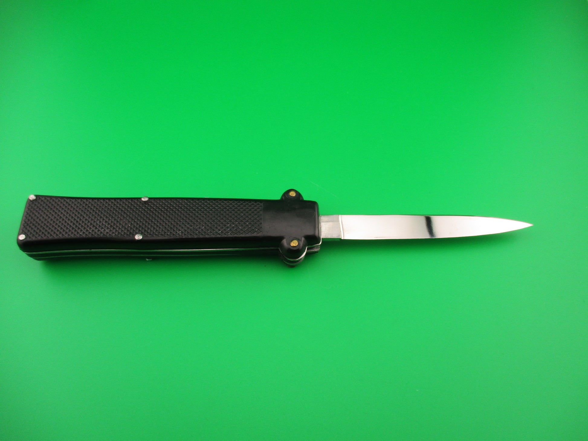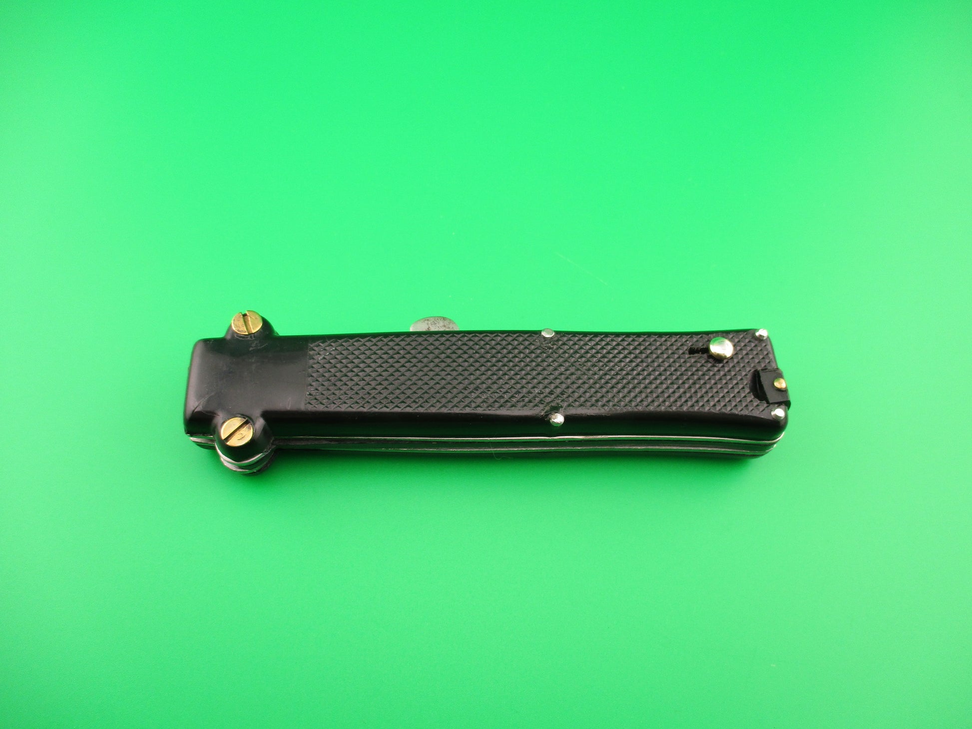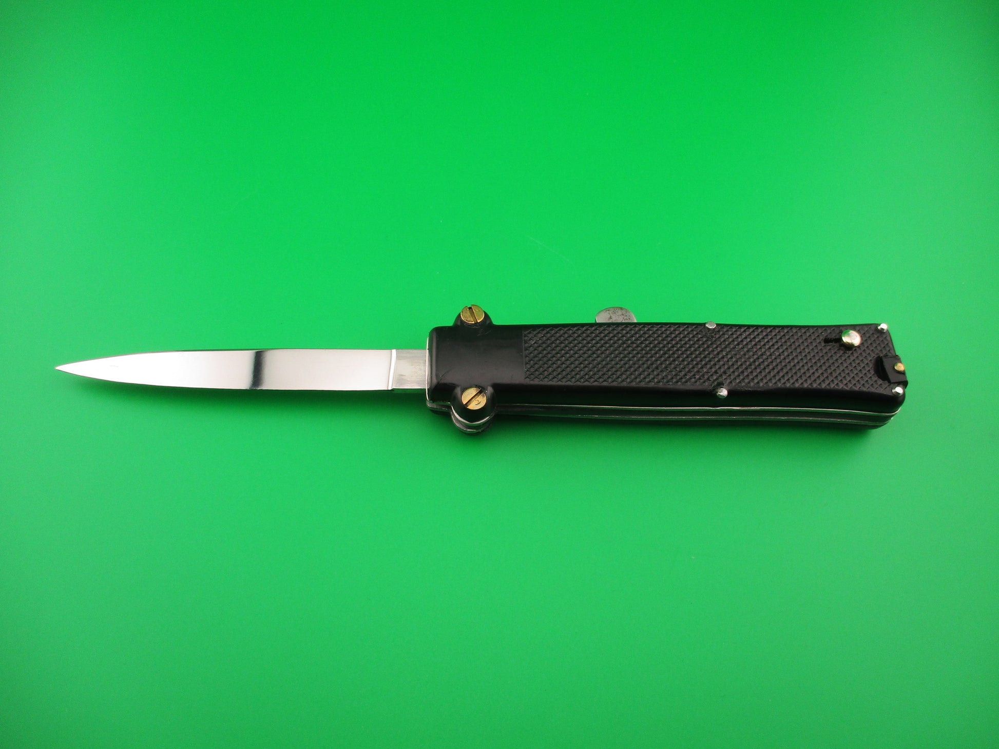 Vintage MAKINOX 22cm French OTF Single Action automatic knife made in the 1960s or 70s in France. The knife measures 21.4cm (8 3/8 inches) open and 4.75 inches closed with steel liners and release knob. The blade is 99% full, or better and retains original factory finish with no markings, but a few light scratches. Black checkered plastic scales are in very good condition with no cracks and are held on by brass screws and steel pins. The knife works perfectly. Fires to full open when release knob is pressed. Retracts part way when knob is pressed again, then is cocked into the firing position by pulling the cocking knob at the bottom (back) end of the knife. Sliding safety works well. EX+ condition.