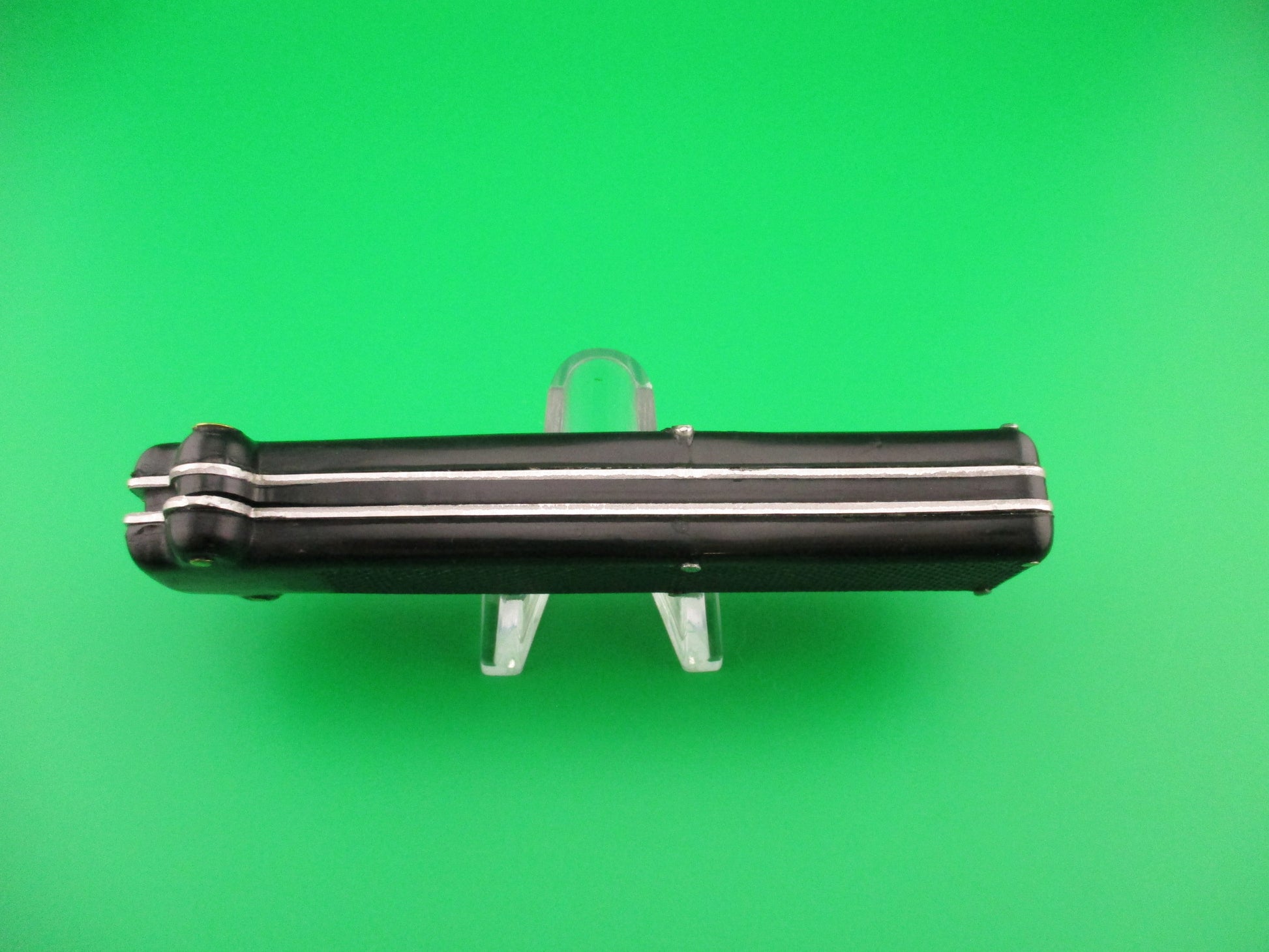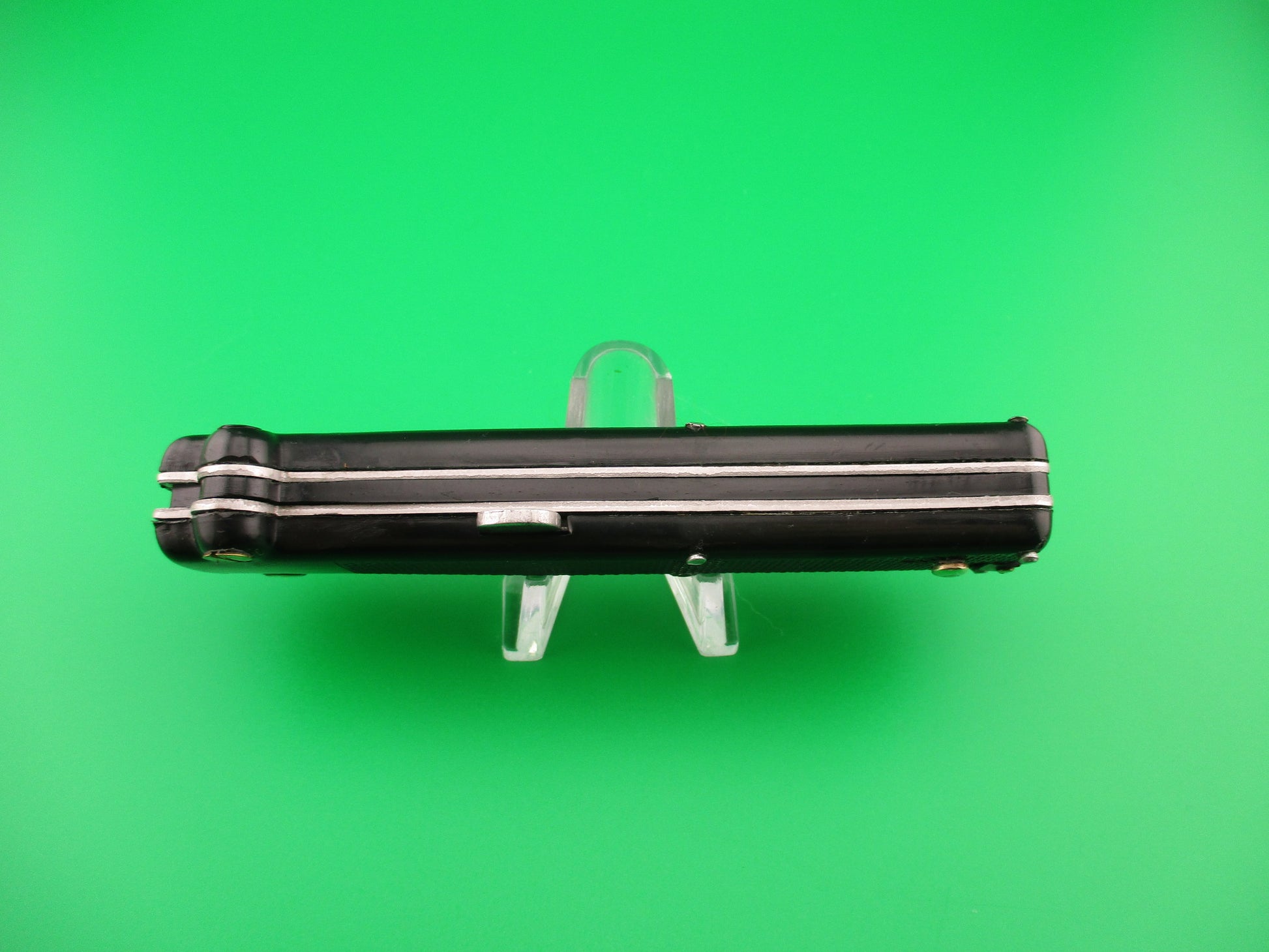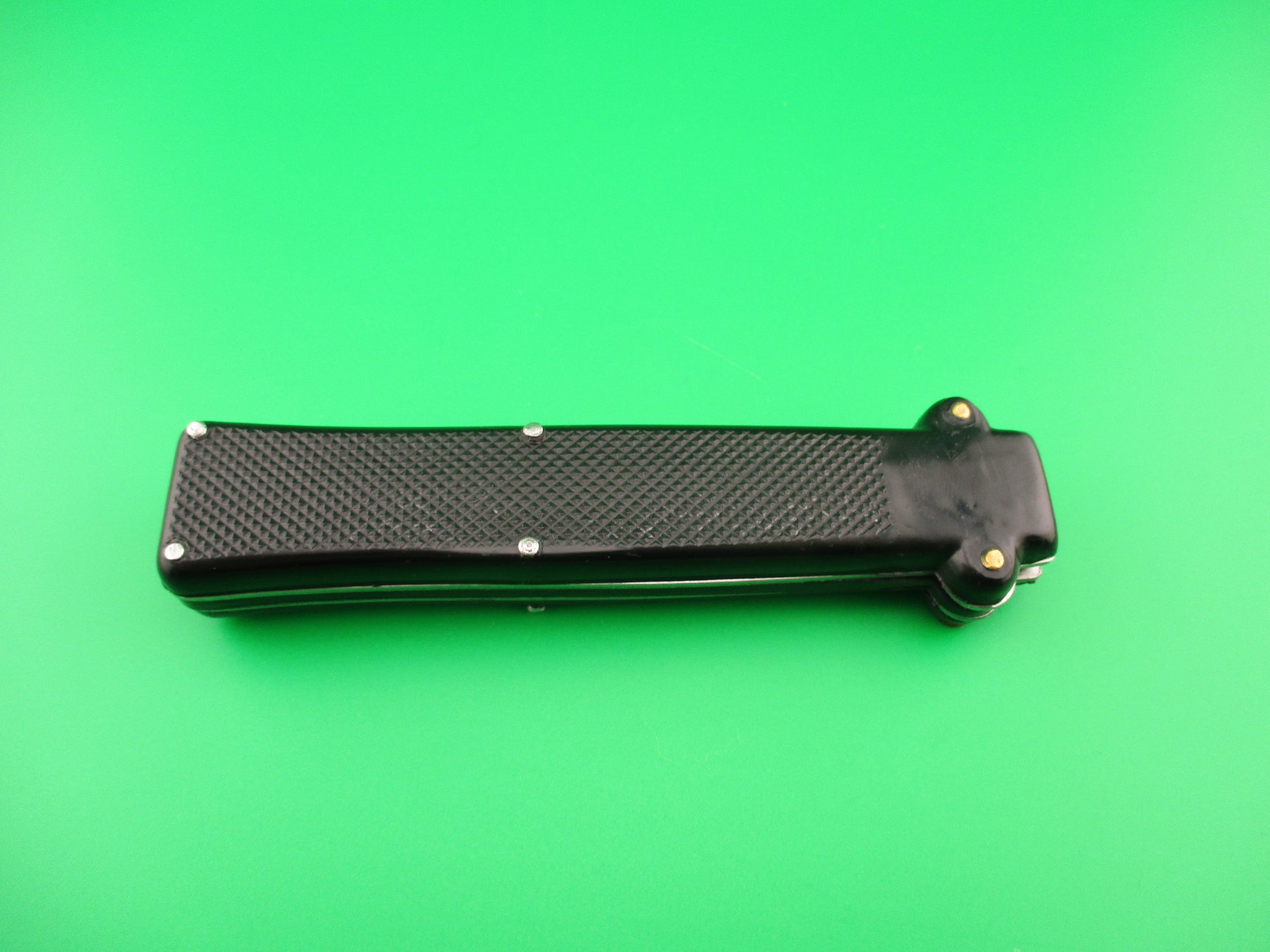 Vintage MAKINOX 22cm French OTF Single Action automatic knife made in the 1960s or 70s in France. The knife measures 21.4cm (8 3/8 inches) open and 4.75 inches closed with steel liners and release knob. The blade is 99% full, or better and retains original factory finish with no markings, but a few light scratches. Black checkered plastic scales are in very good condition with no cracks and are held on by brass screws and steel pins. The knife works perfectly. Fires to full open when release knob is pressed. Retracts part way when knob is pressed again, then is cocked into the firing position by pulling the cocking knob at the bottom (back) end of the knife. Sliding safety works well. EX+ condition.