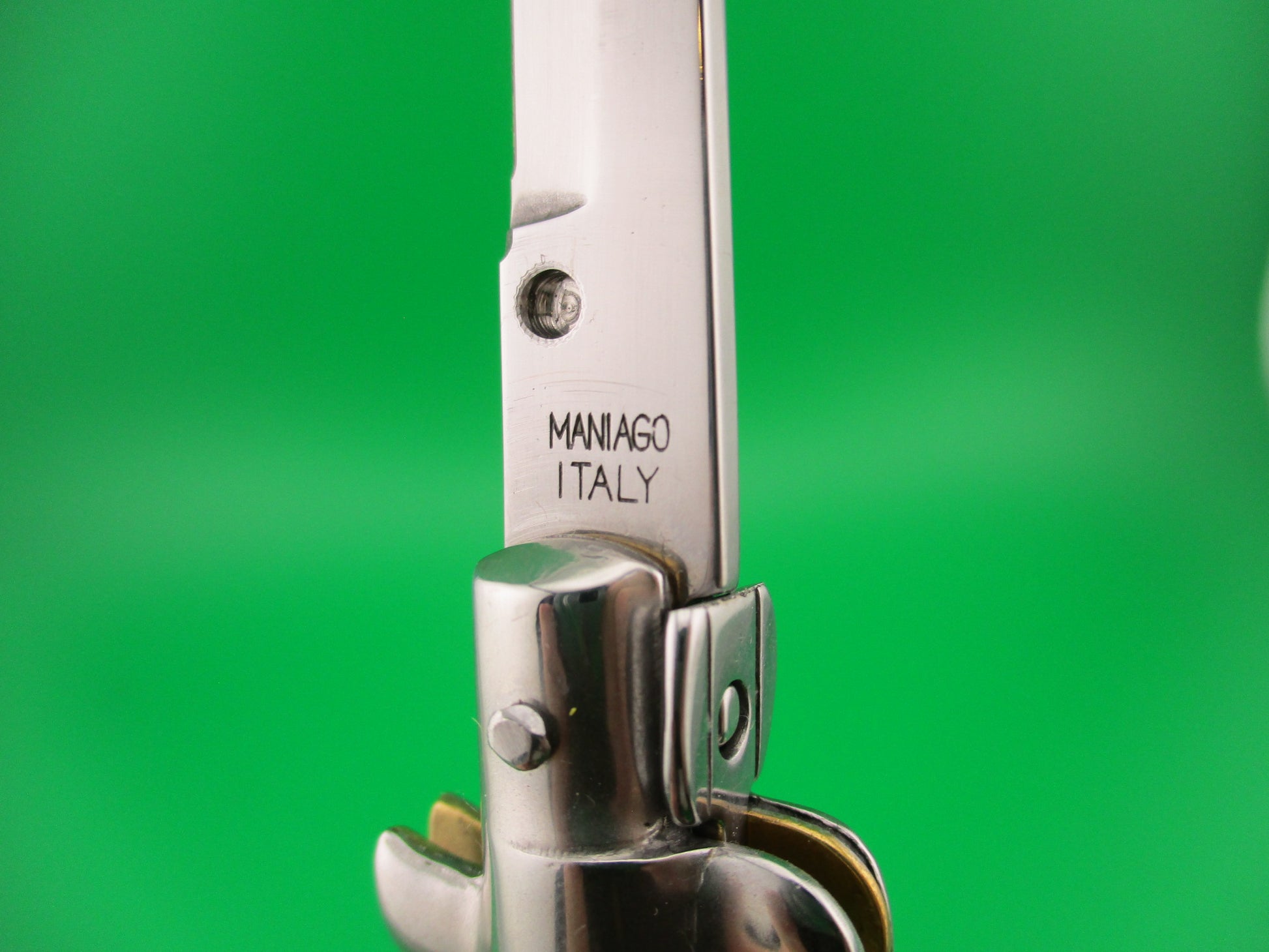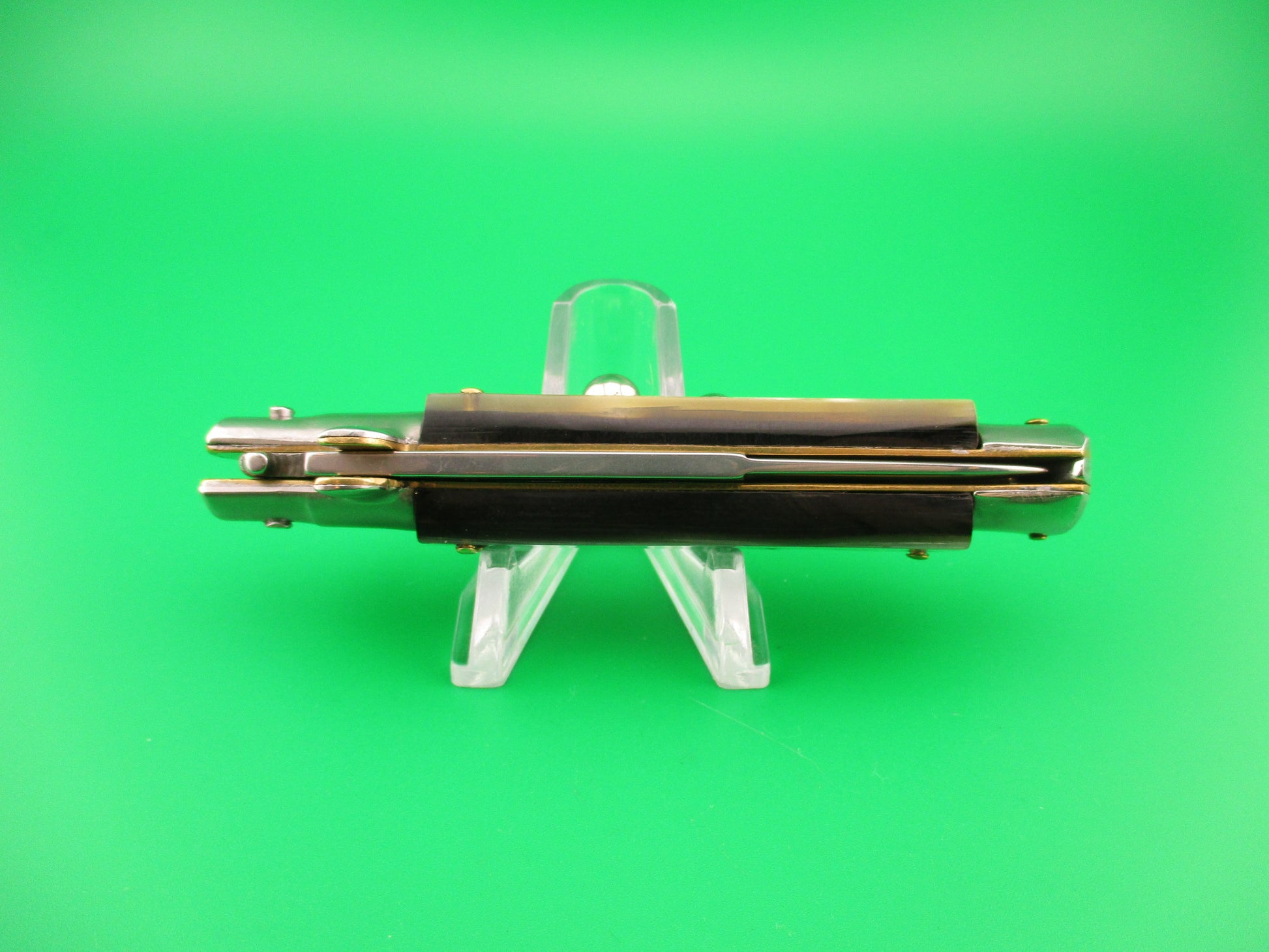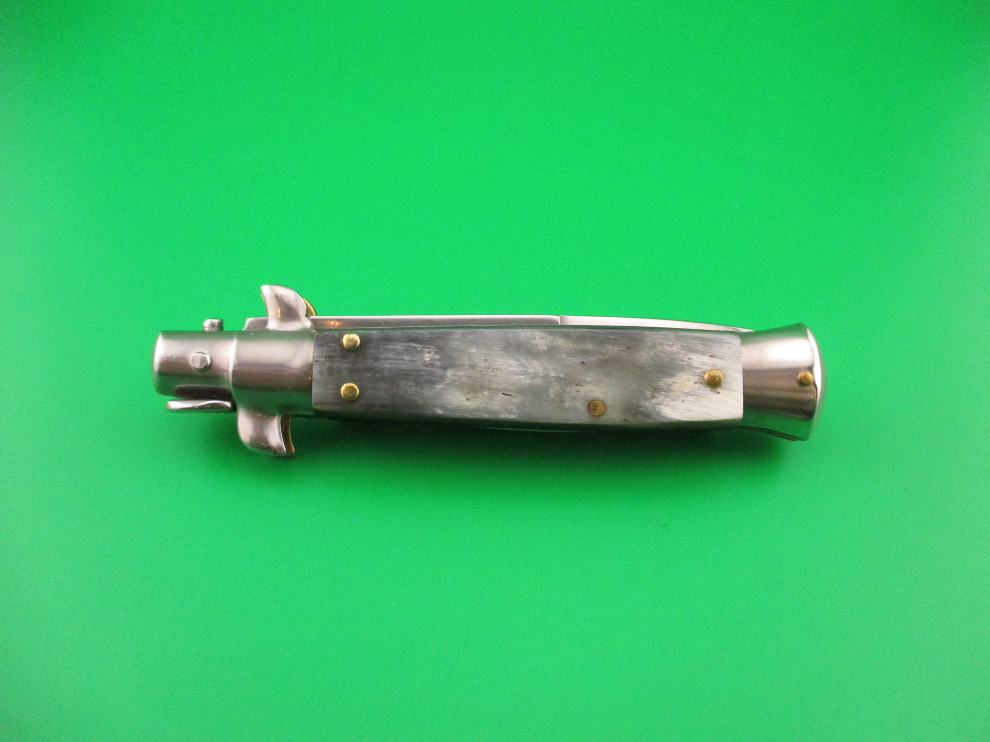 MANIAGO ITALY 18cm Italian Picklock horn Stiletto automatic knife made by Lucio Flaca made prior to him making the knives for the D.M. brand. The knife measures 17.7cm (7 inches) open and 3 15/16 inches closed with brass liners & pins and nickel silver top (front) bolsters and steel bottom (back) bolsters, button and safety cap. The bayonet style blade is 99% full or better with original finish and the ricasso is stamped MANIAGO ITALY on the front and later ones have D.M. with picture of two dolphins on the rear, but the rear is Blank so this is a pre-DM knife. The genuine horn scales are very nice with the front being green with white streaks and black edges and the back is gray with white streaks and black edges. The knife works well with blade tip deep and centered in the well, strong snap and very good lockup open with maybe 1/32" movement at the tip. Does not rattle if shaken with the blade open. Safety works, but is a little loose. EX+ condition.