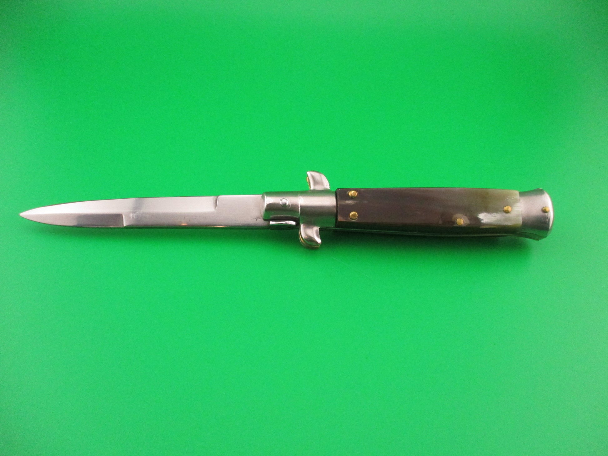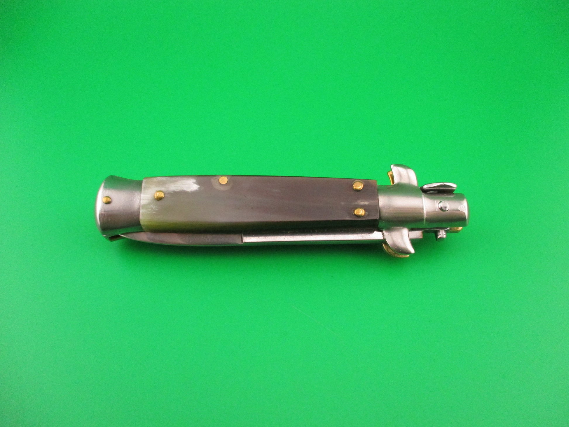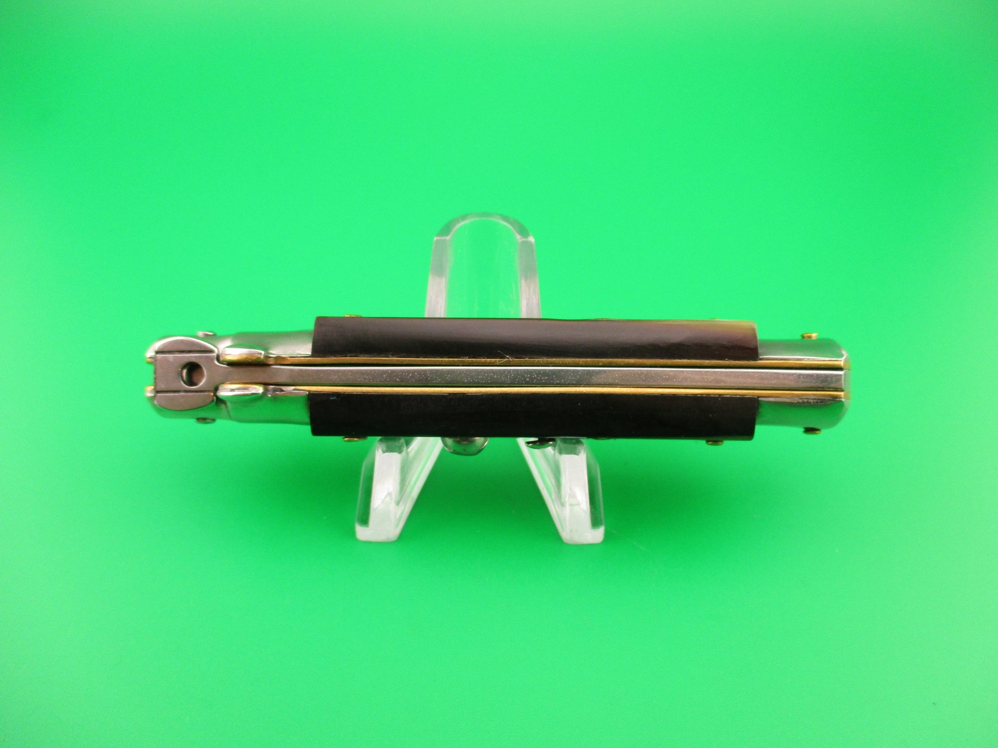 MANIAGO ITALY 18cm Italian Picklock horn Stiletto automatic knife made by Lucio Flaca made prior to the knives he made for the D.M. brand. The knife measures 17.7cm (7 inches) open and 3 15/16 inches closed with brass liners & pins and nickel silver top (front) bolsters and steel bottom (back) bolsters, button and safety cap. The bayonet style blade is 99% full or better with original finish with small sharpened area and the ricasso is stamped MANIAGO ITALY on the front should have D.M. with picture of two dolphins on the rear, but the rear is Blank. The genuine horn scales are very nice with the front being black with white streaks and the back is translucent green with tan and white streaks. The knife works well with blade tip deep and centered in the well, strong snap and very good lockup open with maybe 1/32" movement at the tip. Does not rattle if shaken with the blade open. Safety works. EX+ condition.