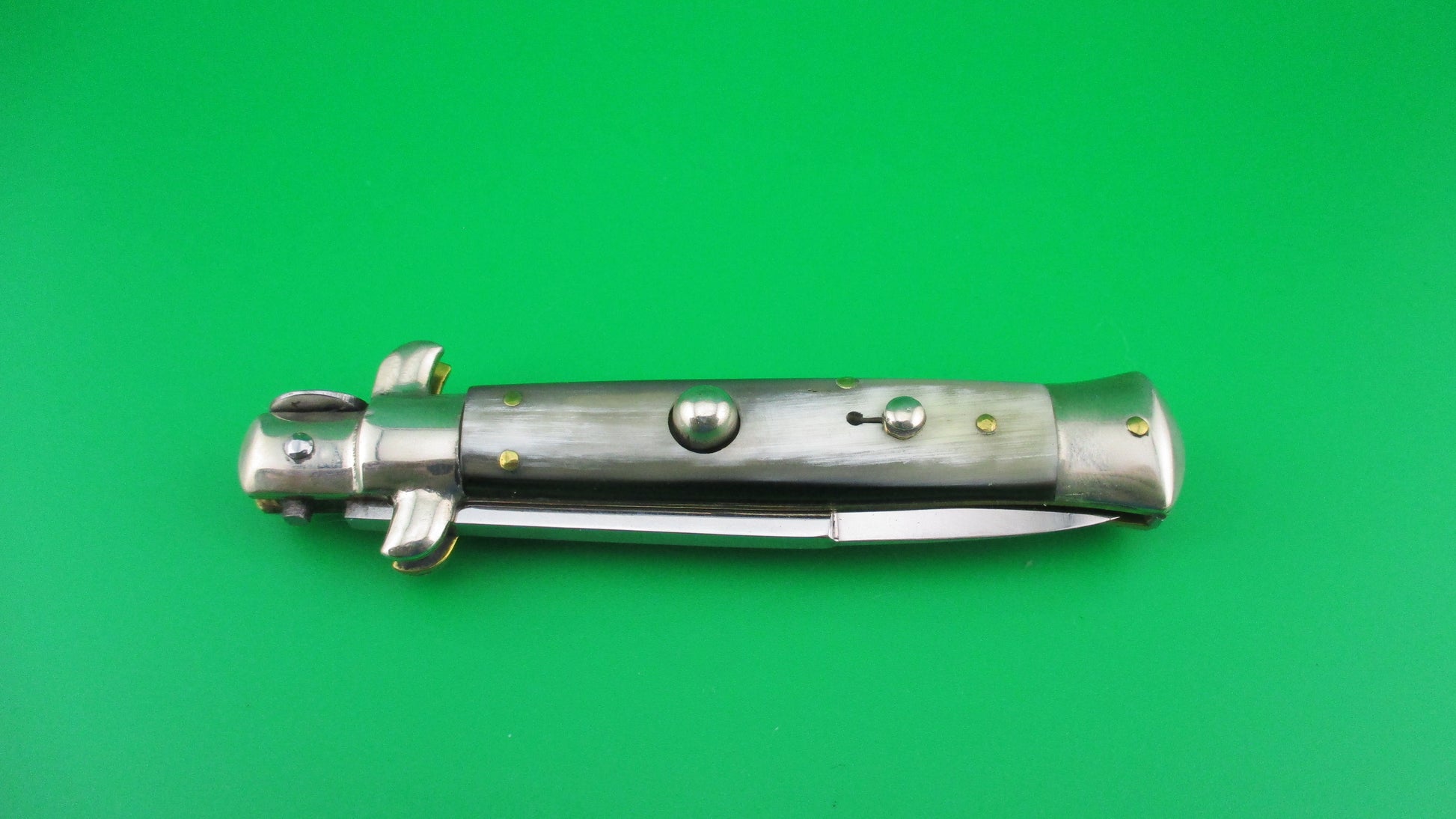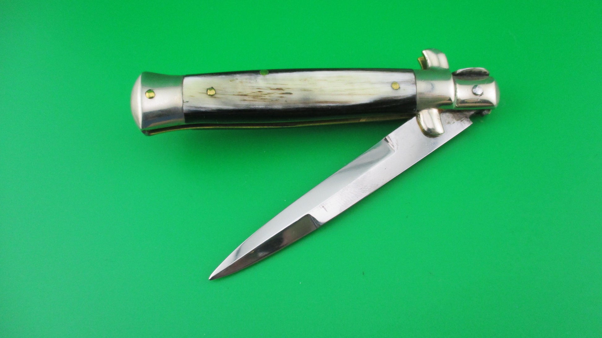 MAURO MARIO 18cm Picklock Italian 1950s vintage automatic knife measures 18cm (7 inches) open with D stamped brass liners and pins and nickel silver bolsters, button and safety. The bayonet style blade is full with original factory finish and is stamped MAURO MARIO MADE IN ITALY on the ricasso. The horn scales are very attractive with black edges and white & cream streaked centers, often referred to as "skunks". The knife works great with the blade tip below liners and centered closed, strong snap and good lockup with just a hint of up and down at the tip. Does not rattle if shaken open. Safety works. EX+ condition.