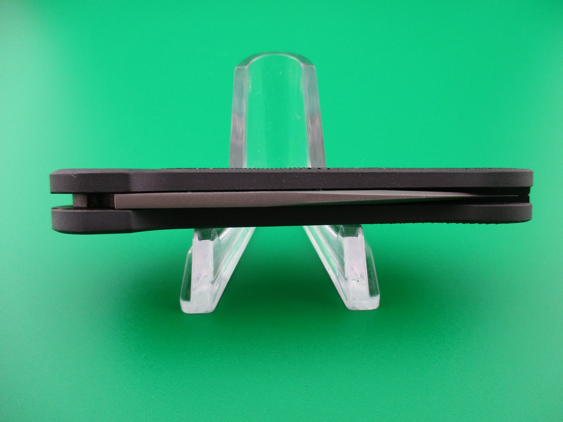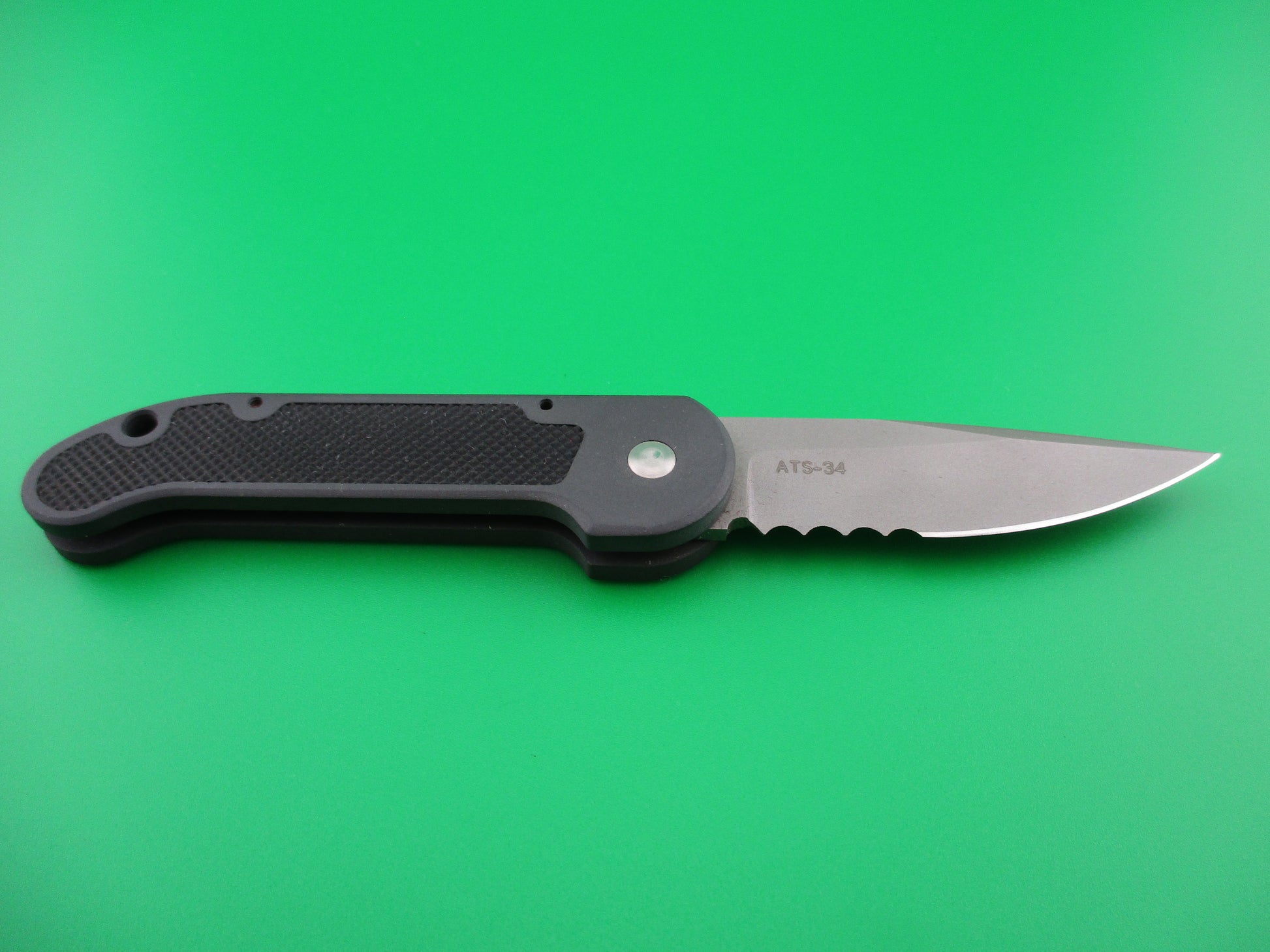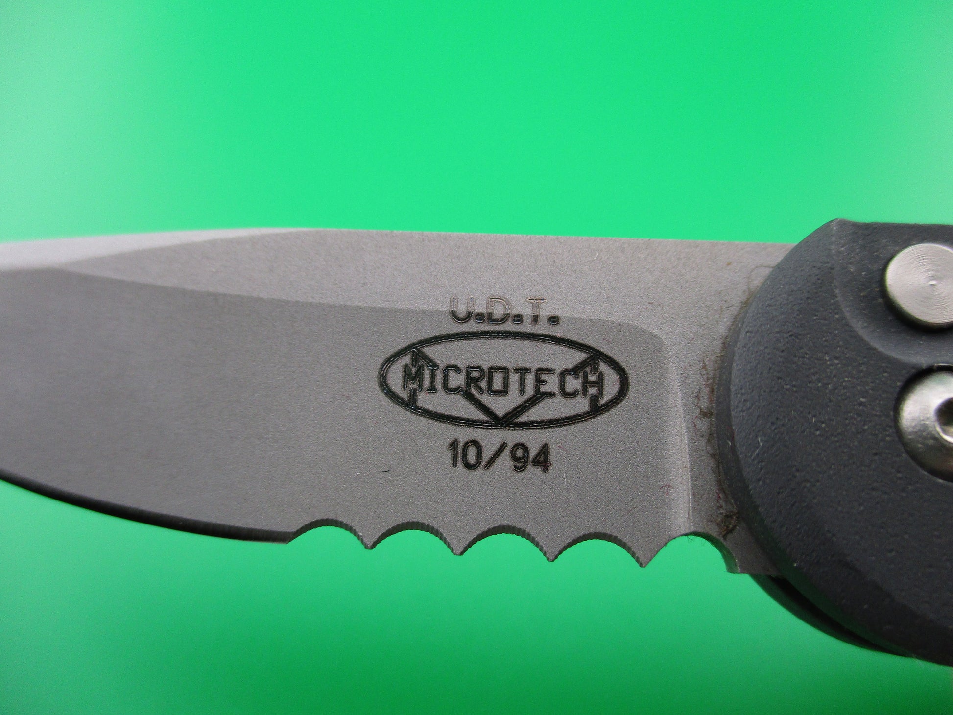 The Mini UDT is the smallest size of the popular U.D.T. (Underwater Demolition Team) automatic knife from Microtech. It features an aluminum handle and stainless steel bead blasted drop point blade. The knife features fast-action and a solid lockup. It measures 5.5 inches open with black aluminum frame and black rubber inserts for better grip. The blade is marked Microtech U.D.T. 10/94 on the front and ATS-34 on the back. This knife is like new and works like new with Tight lockup open. Nice addition to a collection of modern automatic knives.