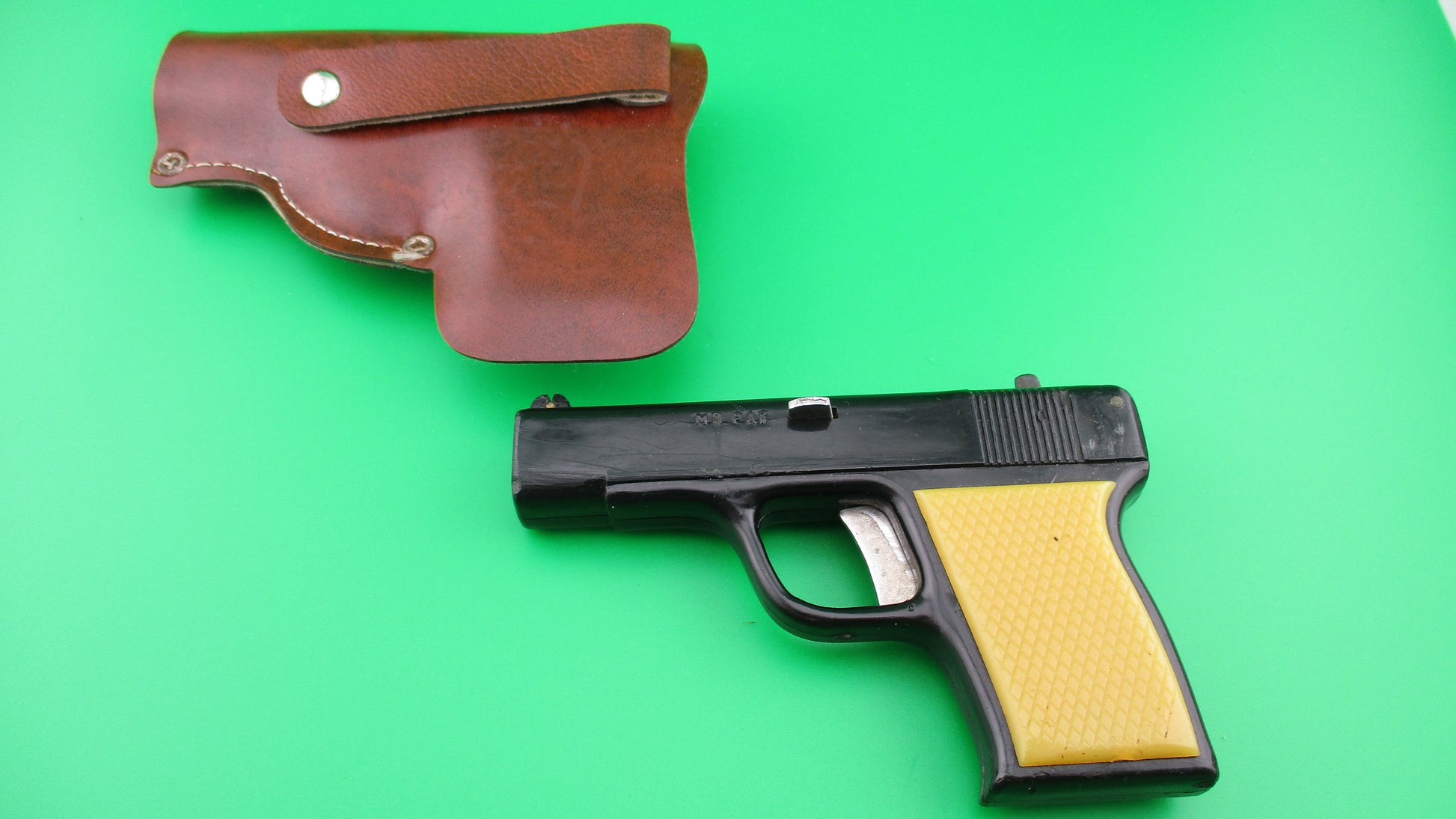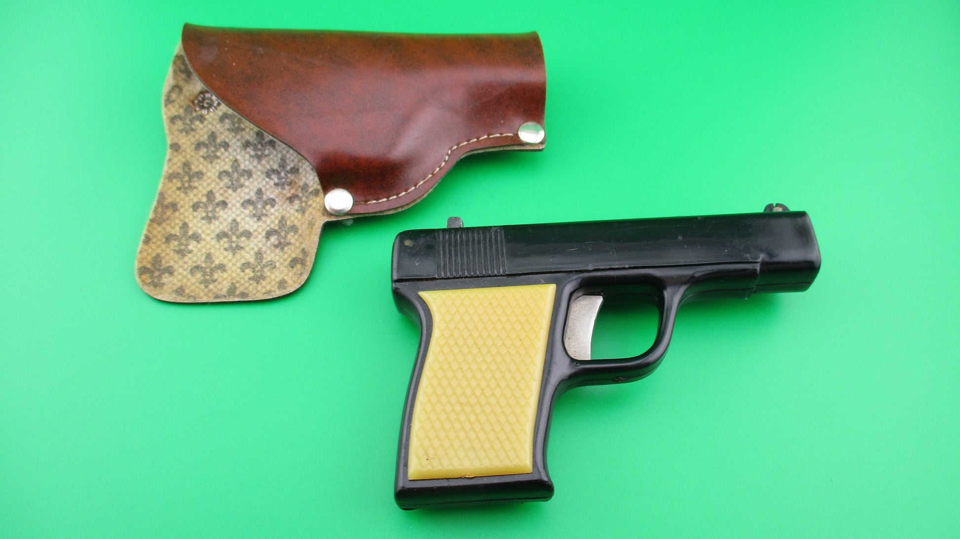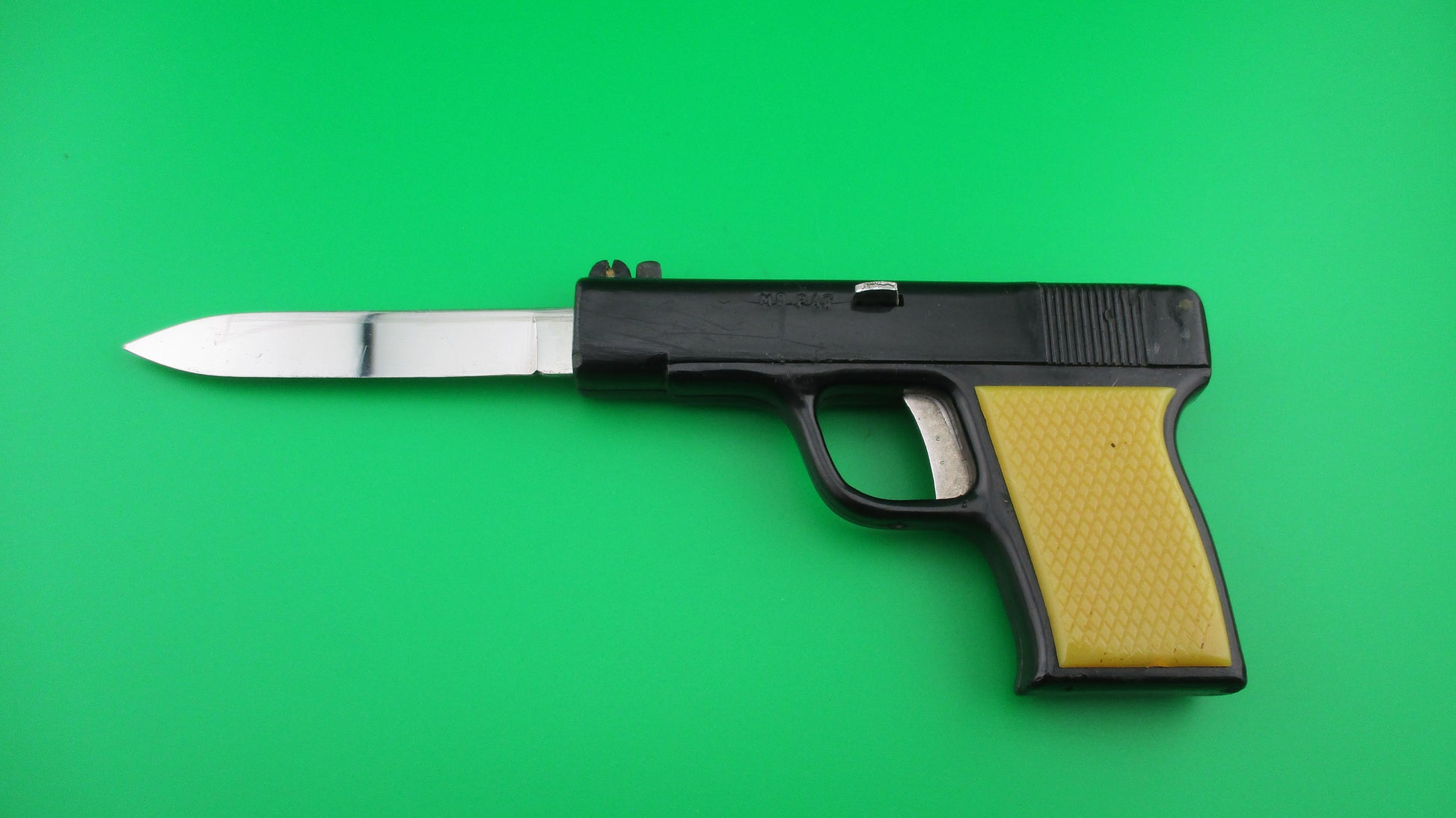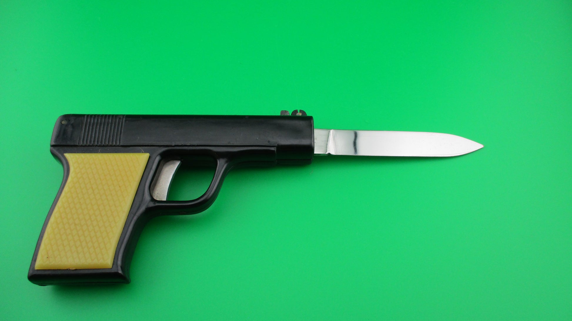 MO PAT Spanish OTF Pistol knife vintage 1960s switchblade with leather sheath. Neat old pistol knife most likely made in Spain for tourist souvenirs in the 1960s or 70s. The only marking on the knife is MO PAT near the blade release knob, nothing on the blade. The pistol is plastic and in very good condition, with steel blade, trigger and blade release knob. The spearpoint blade is full with most of the original finish intact with some scratches. The knife works well. You have to hold the blade release knob while pressing the trigger to open the knife and press the knob again to release the blade to be pulled closed by a knob on the spine of the blade. The original leather holster/sheath is in excellent condition and has a Fleur de lis pattern on the inside. Excellent condition overall.