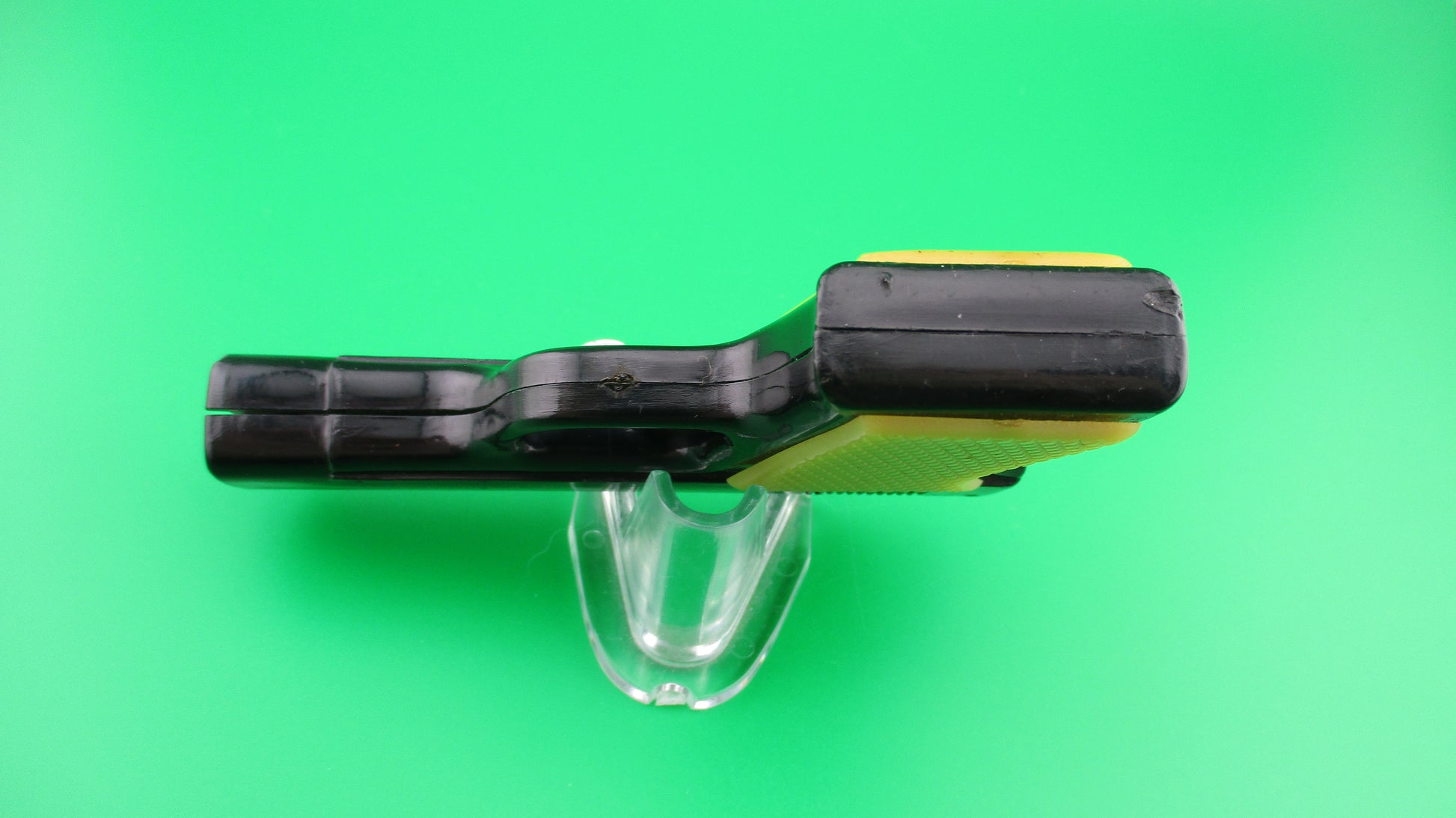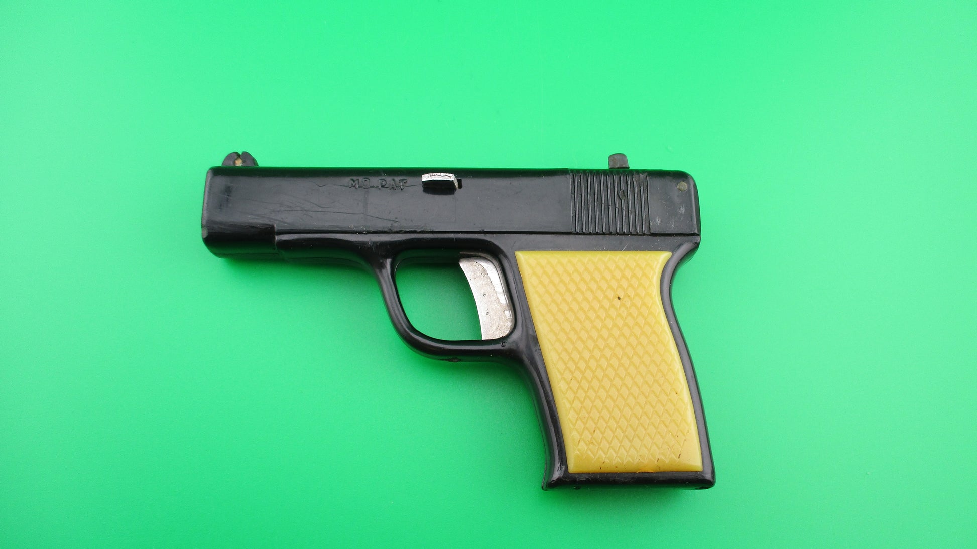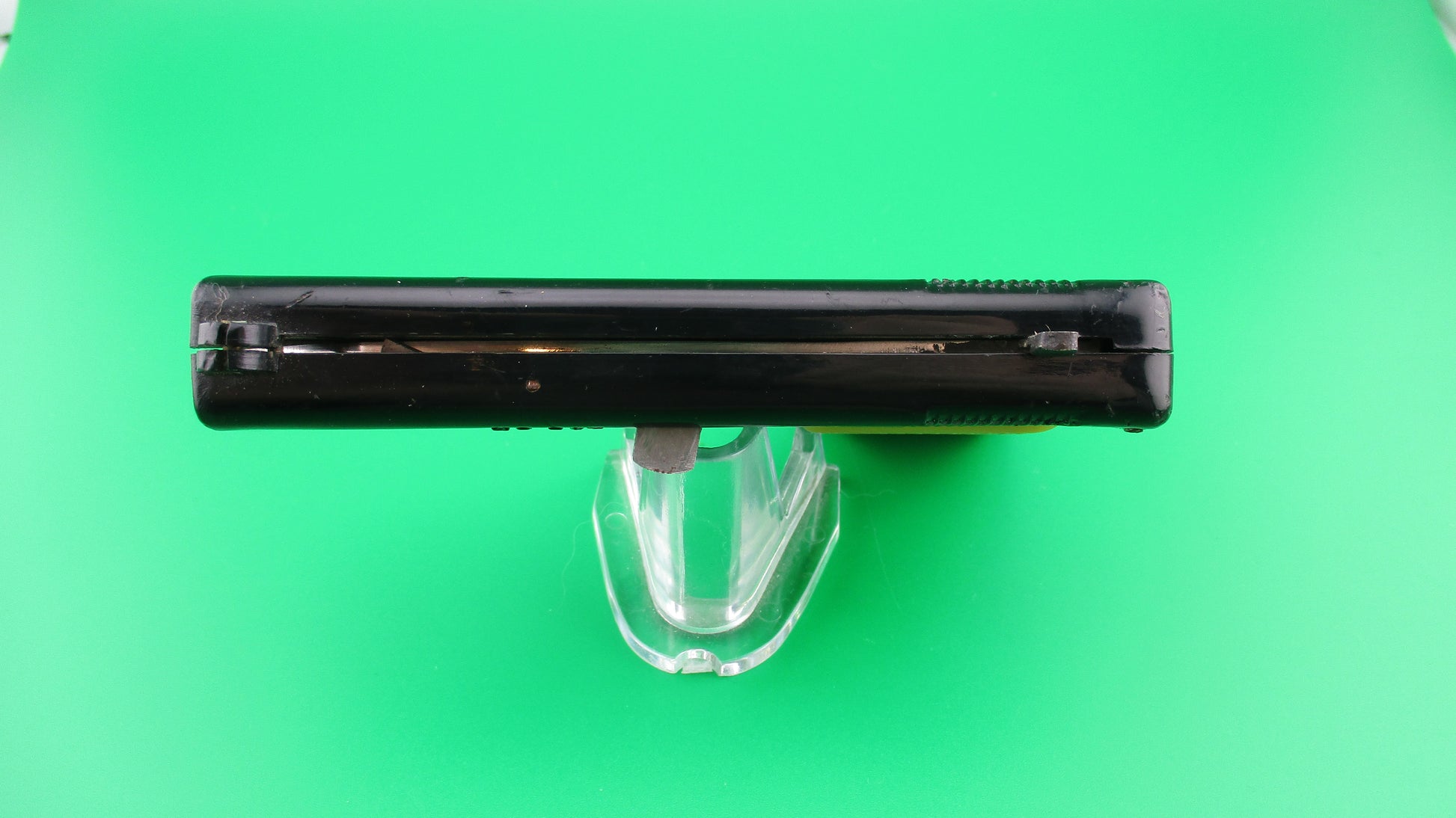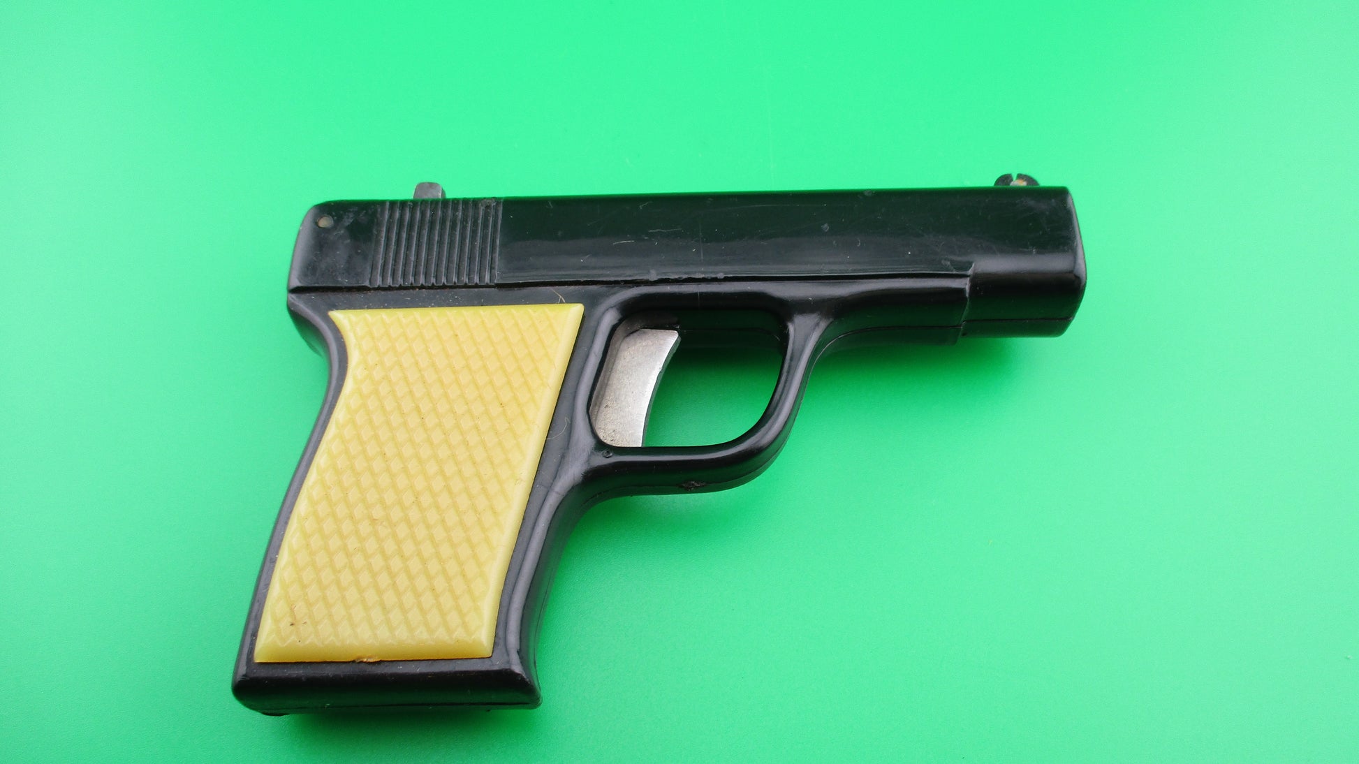 MO PAT Spanish OTF Pistol knife vintage 1960s switchblade with leather sheath. Neat old pistol knife most likely made in Spain for tourist souvenirs in the 1960s or 70s. The only marking on the knife is MO PAT near the blade release knob, nothing on the blade. The pistol is plastic and in very good condition, with steel blade, trigger and blade release knob. The spearpoint blade is full with most of the original finish intact with some scratches. The knife works well. You have to hold the blade release knob while pressing the trigger to open the knife and press the knob again to release the blade to be pulled closed by a knob on the spine of the blade. The original leather holster/sheath is in excellent condition and has a Fleur de lis pattern on the inside. Excellent condition overall.
