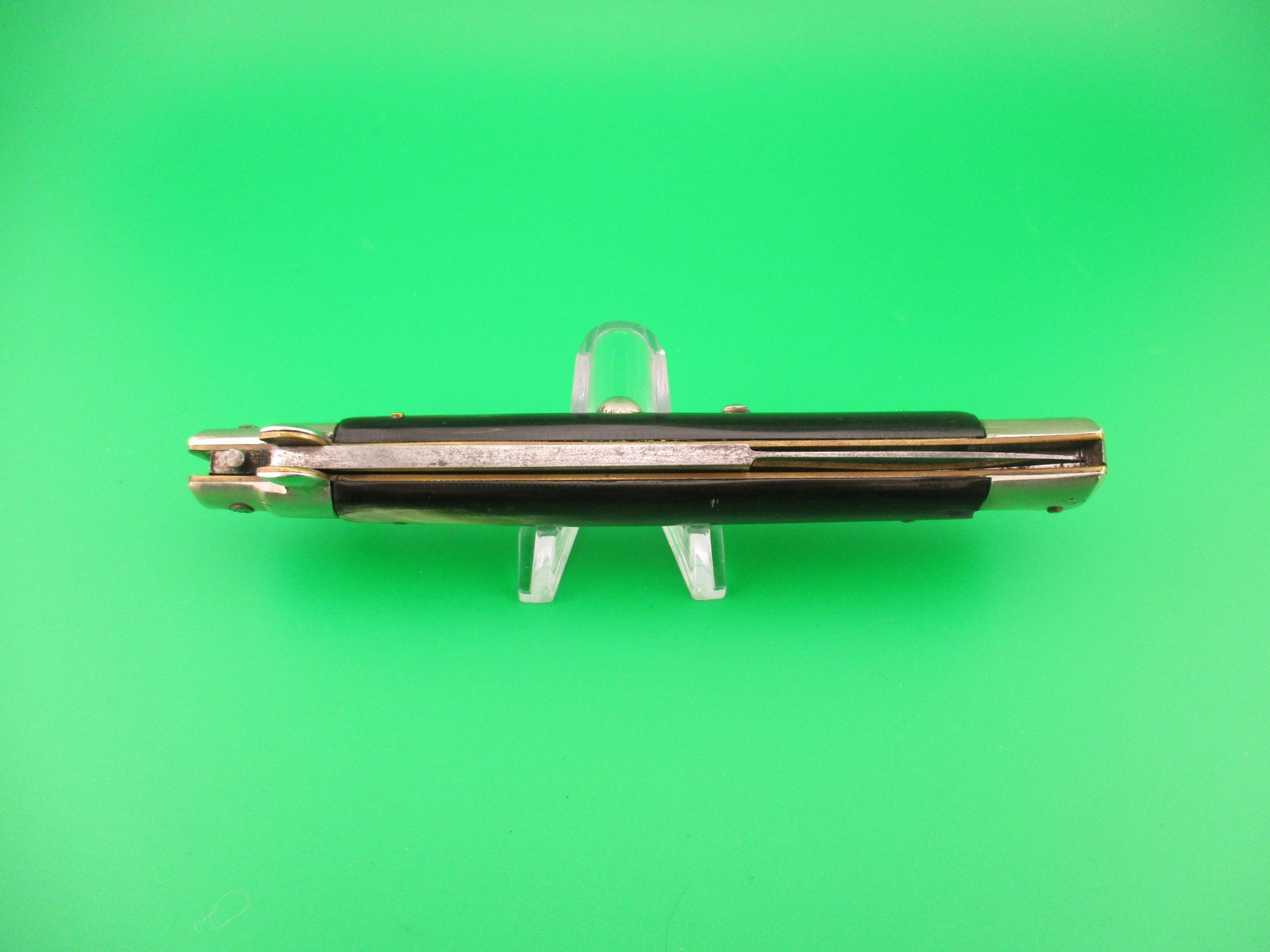 Vintage Sterile (No Stamp) 28cm Italian Picklock Bayonet blade Horn handled automatic knife made in Italy in the 1950s, Very Nice. The knife measures 28cm (11 inches) open and 5 7/8 inches closed with D stamped brass bolsters and nickel silver bolsters, button & safety cap. The bayonet style blade is 100% full with nearly all of the original finish with some spotting and some scratches & scuffs near the tip which is slightly blunted. The genuine horn scales (handles) are mostly black with some tan & cream streaks and in very nice condition. The knife works great with blade tip deep & centered closed, strong snap and excellent lockup open with just a hint of movement at the tip. Does not rattle if shaken with blade open. Safety works. EX condition.