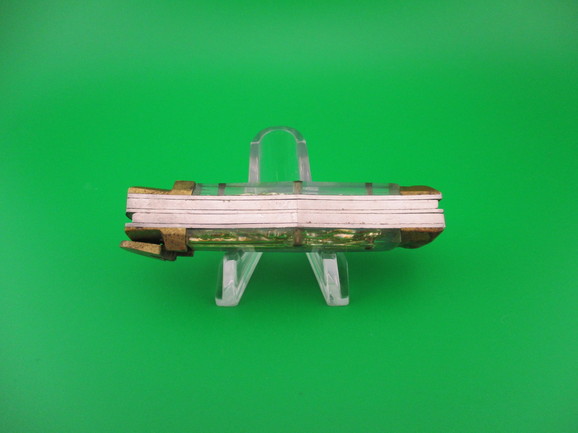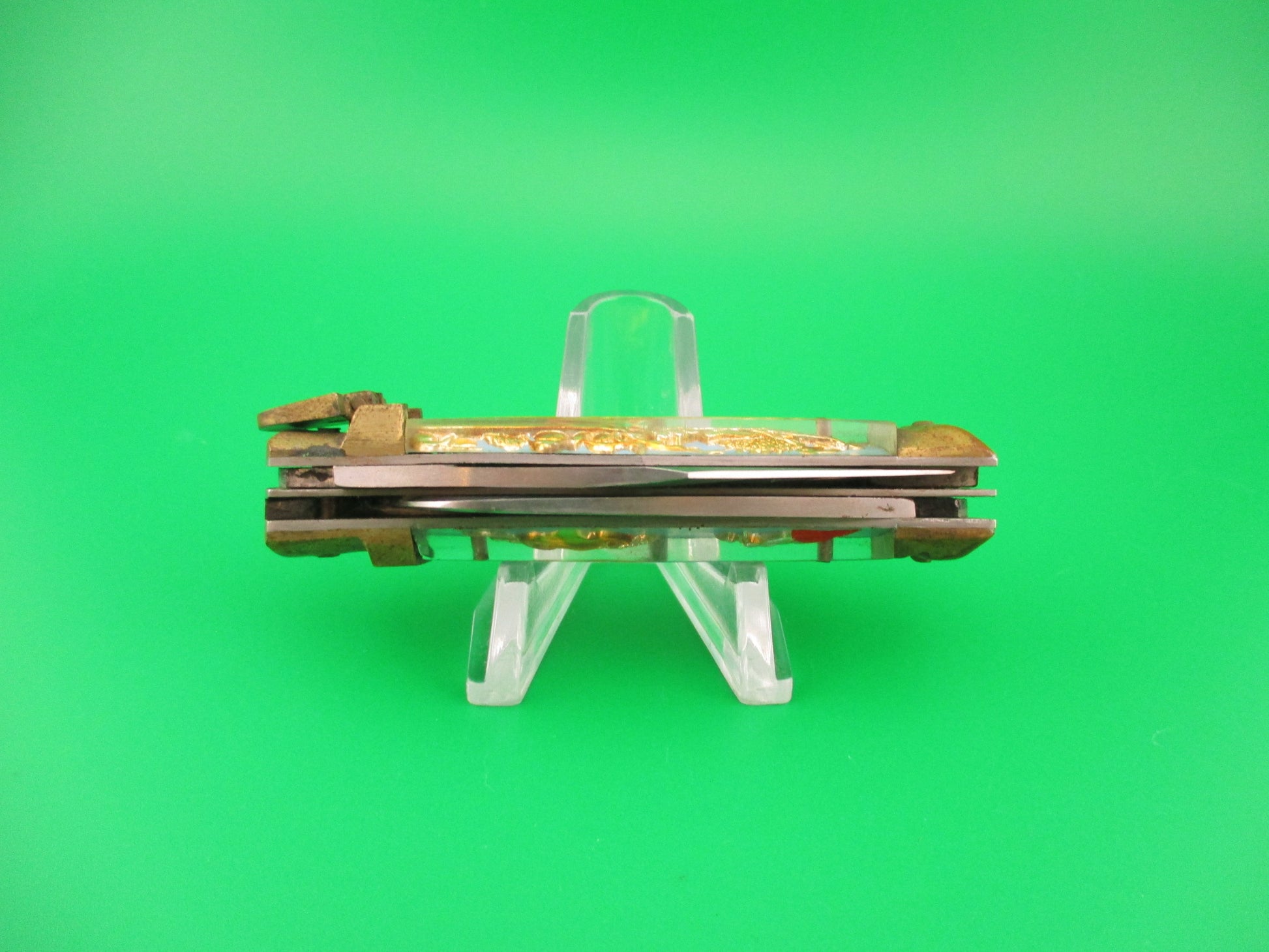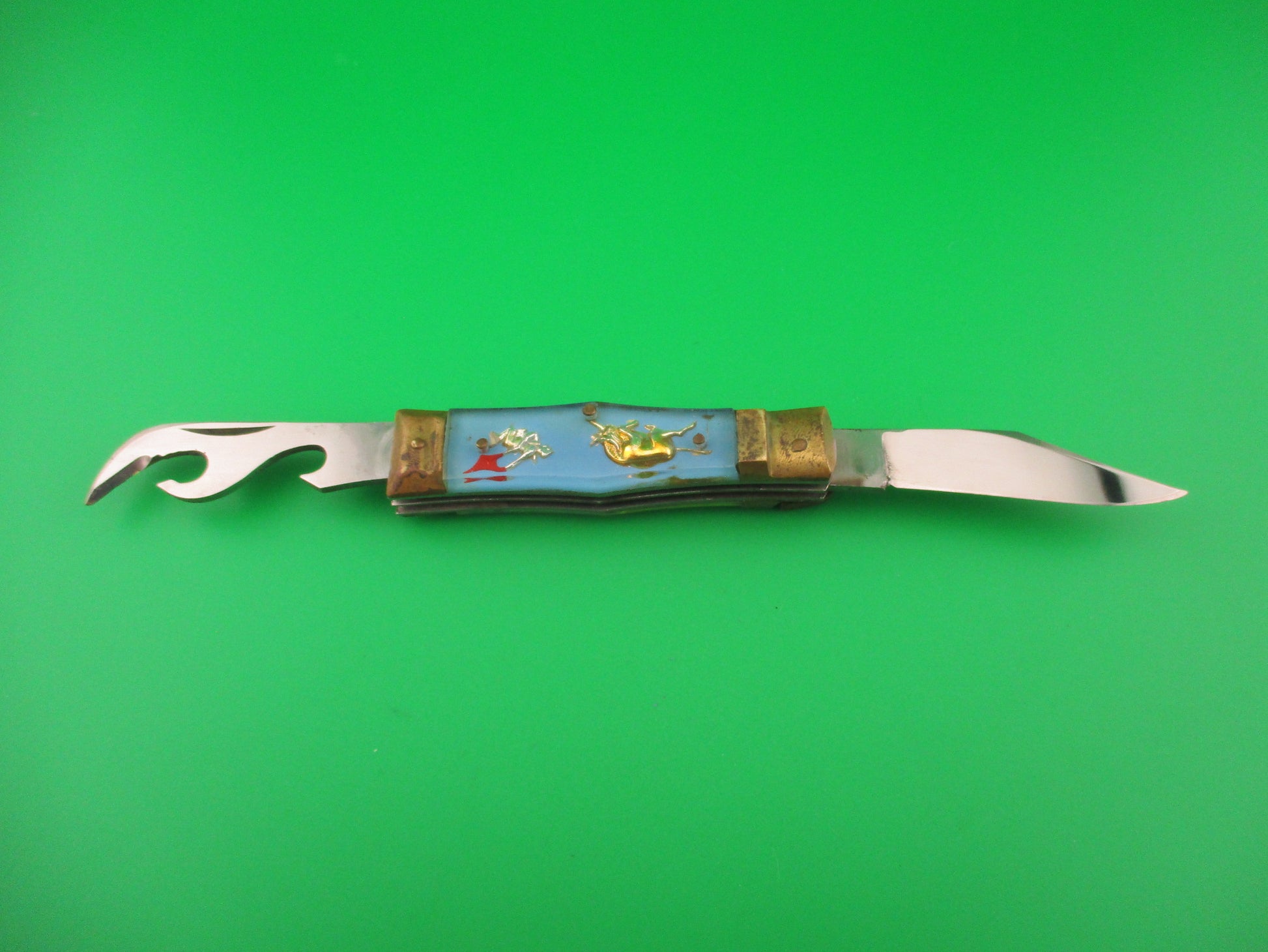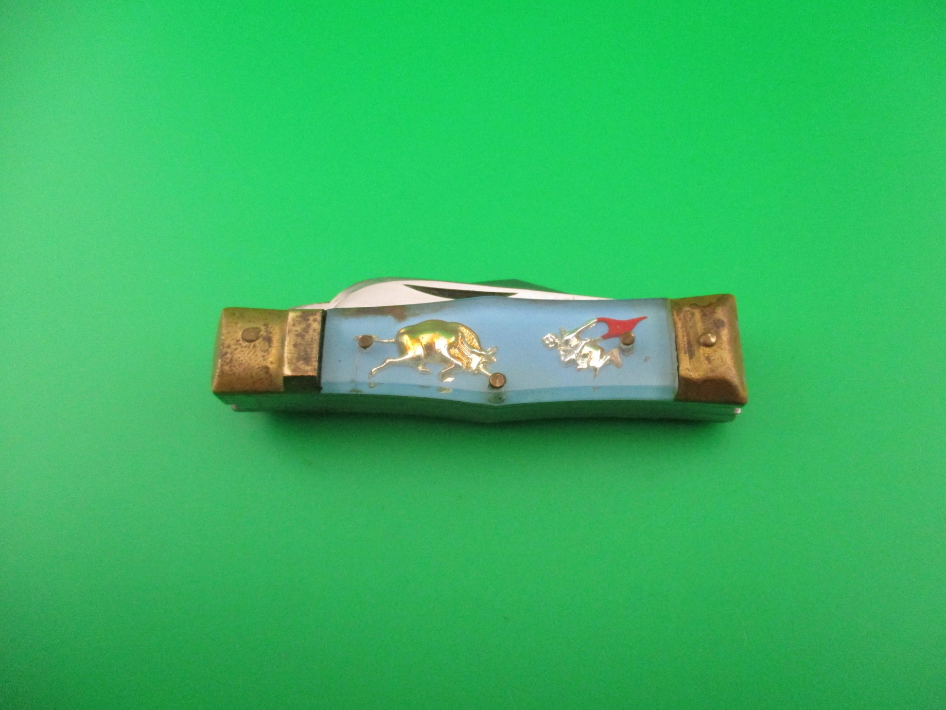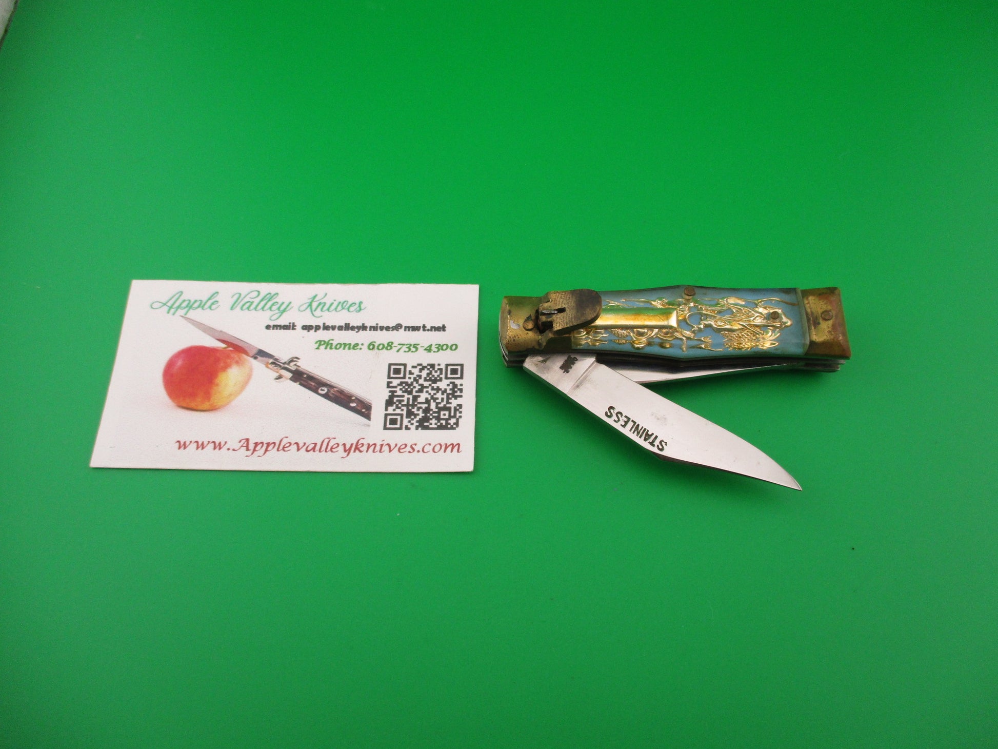 Vintage OMOR JAPAN 14cm Japanese Lever Bullfighter RARE 2 blade automatic knife made in Japan in the 1960s. This is not only a rare Size and rare Color for a bullfighter (matador) knife, but it's even more Rare because it has TWO blades! If that's not enough it's New Old Stock in the original 2 piece cardboard box! The knife measures 14cm (5.5 inches) open and 3 1/8 inches closed with steel liners and brass bolsters & lever. The clip blade is stamped STAINLESS on the face and the tang is stamped O.M.O.R. JAPAN, which interestingly is ROMO backwards, a desirable Italian marking. The secondary manual Can opener, bottle opener blade is also o100% full with no markings. The scales are rare light blue with 3D Golden Dragon under clear acrylic on the front and 3D Matador (bullfighter) scene on the back. The knife works great with blade tip deep, strong snap and tight lockup open. This is a NOS knife in original box from the 1960s which is missing one end on the top. Nearly new condition.