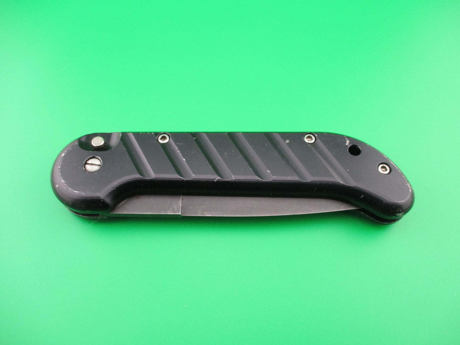 Very cool, lightly used BLK-1992 Special ops knife from Ox Forge. The knife measures 5.5 inches closed and 9 3/8" open. There are no markings that I can find on the knife. the blade appears to be nearly full with a dark finish. The metal scales are black and show some use/handling, but very good overall. The knife works great with the blade seating deep, strong snap and average lockup with a little movement at the tip (springs back). Very cool military automatic knife from Charles Ochs.