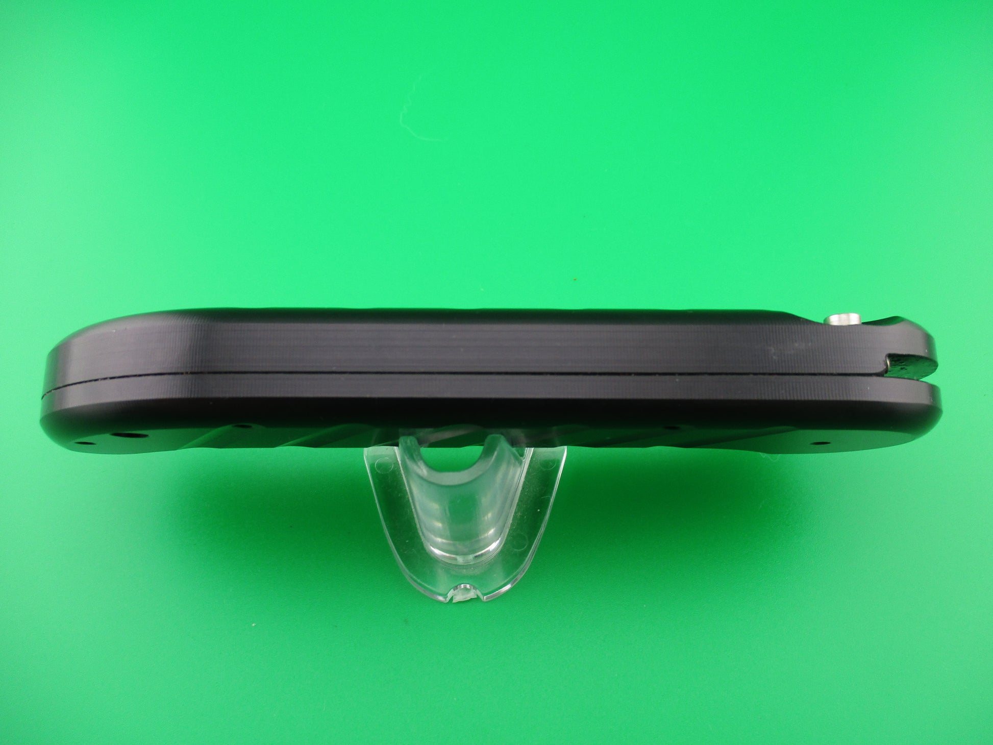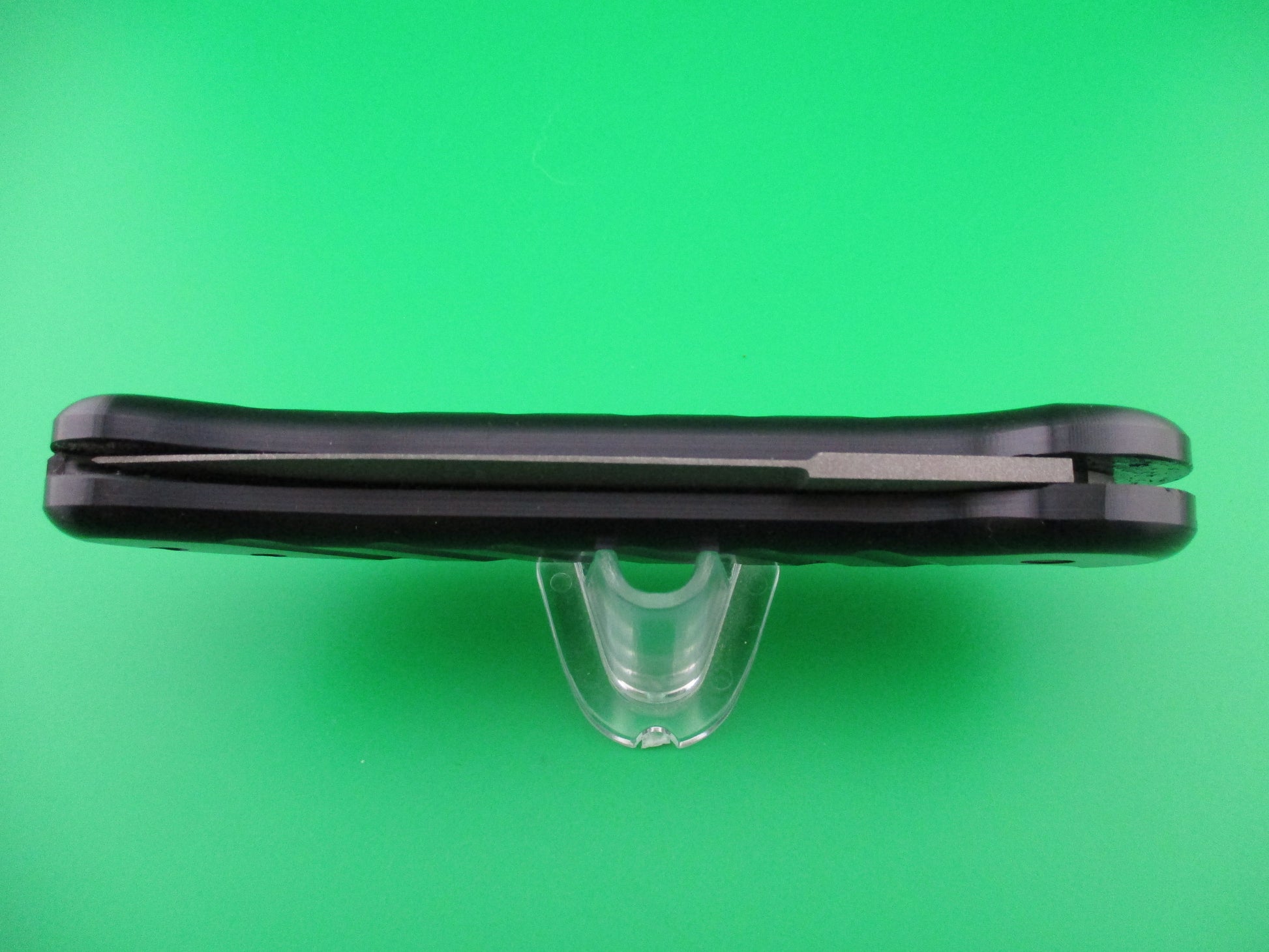 OX FORGE Black Navy Seal Team knife with Bead blasted blade automatic knife 9 5/8" open. The Black Knife is in like new condition. I believe it was made in the 1990s by Ochs Forge. No markings on the bead blasted bayonet style blade that is 100% full with factory edge. Black powder coated Aluminum handles are super nice. The knife functions like new with the blade tip seating deep, strong snap and good lockup open. Super nice knife.