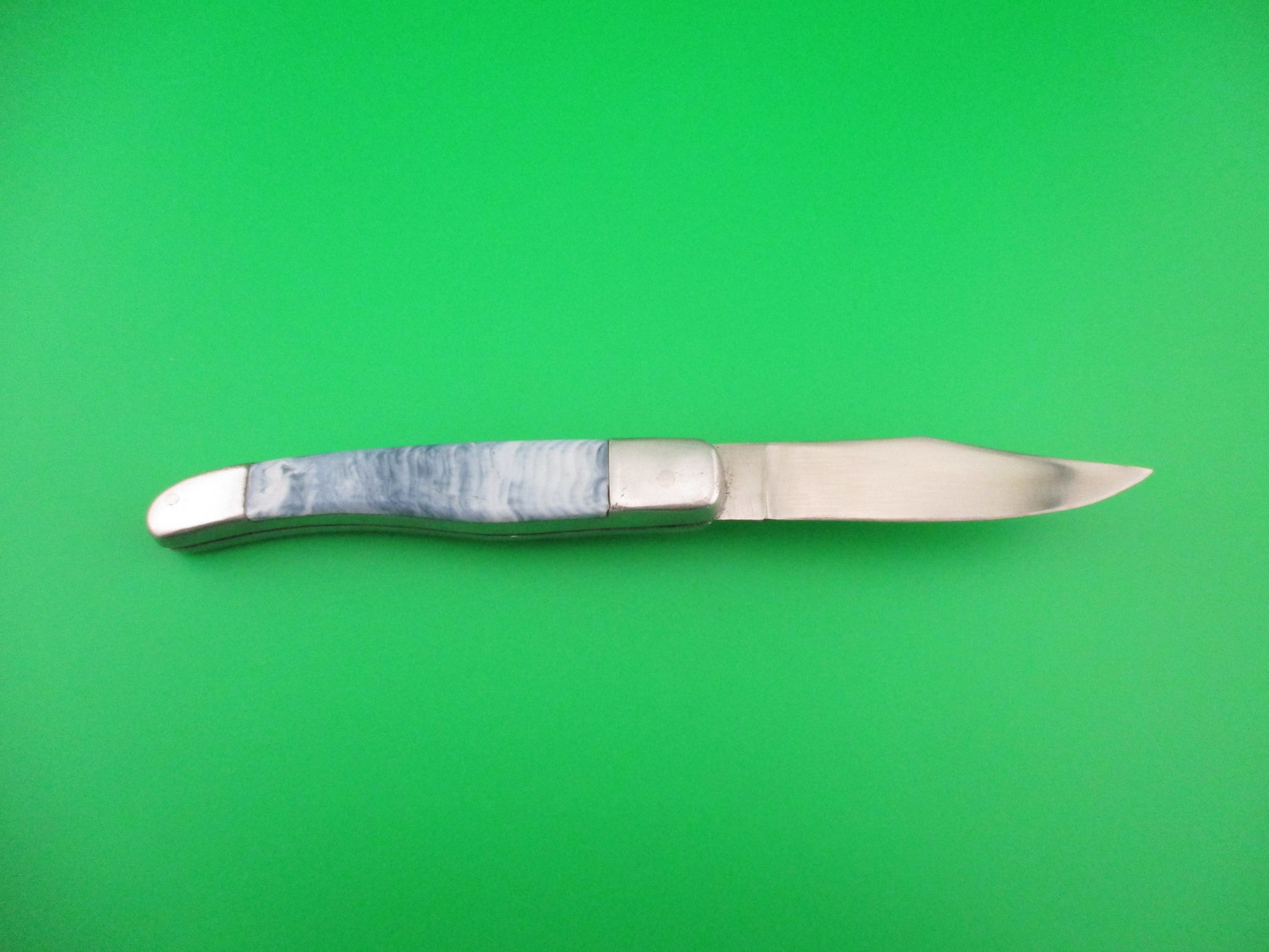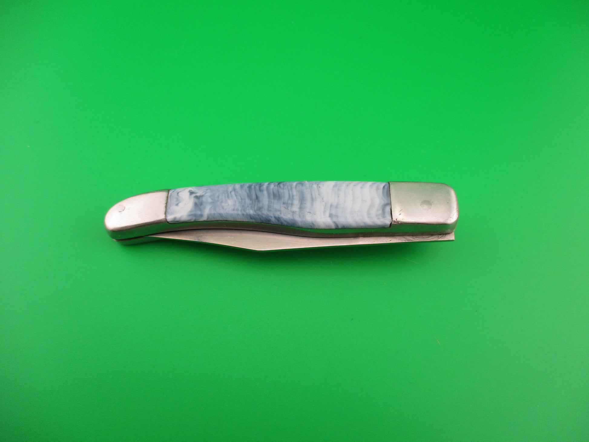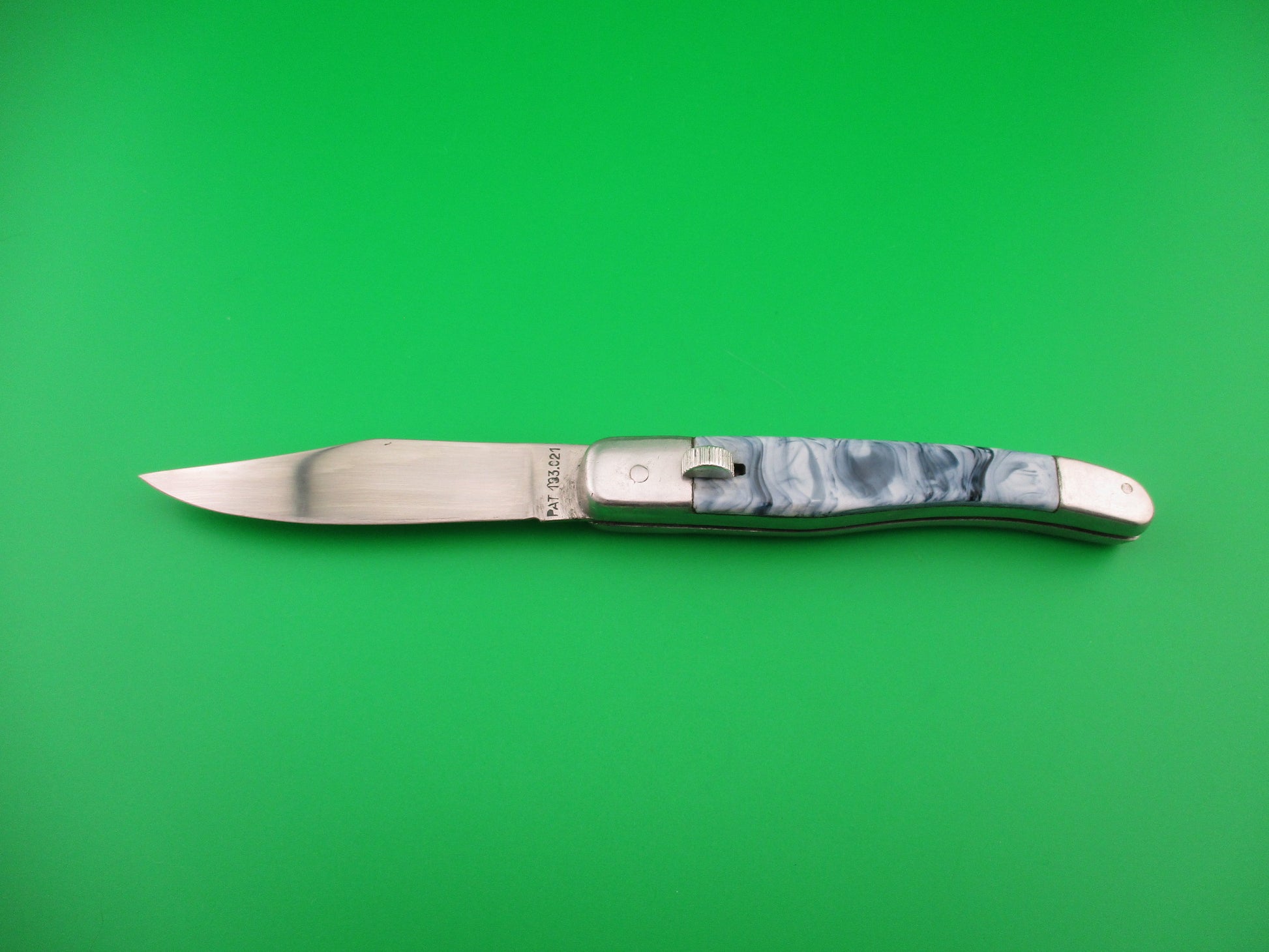 Vintage PAT 193.021 18cm Spanish Aluminum Coilspring automatic knife sliding button with blue/white swirl scales most likely made 1960s or 70s in Spain. The knife measures 17.8cm (7 inches) open and 4 inches closed with aluminum frame. The clip blade is 99% full, or better with most of the original finish with a couple of light scratches and the tang is stamped PAT 193.021. The synthetic blue/white swirl scales are in excellent condition and very attractive. The knife works great with blade tip deep in the well closed, good snap and very good lockup with just a hint of movement at the tip open. EX condition