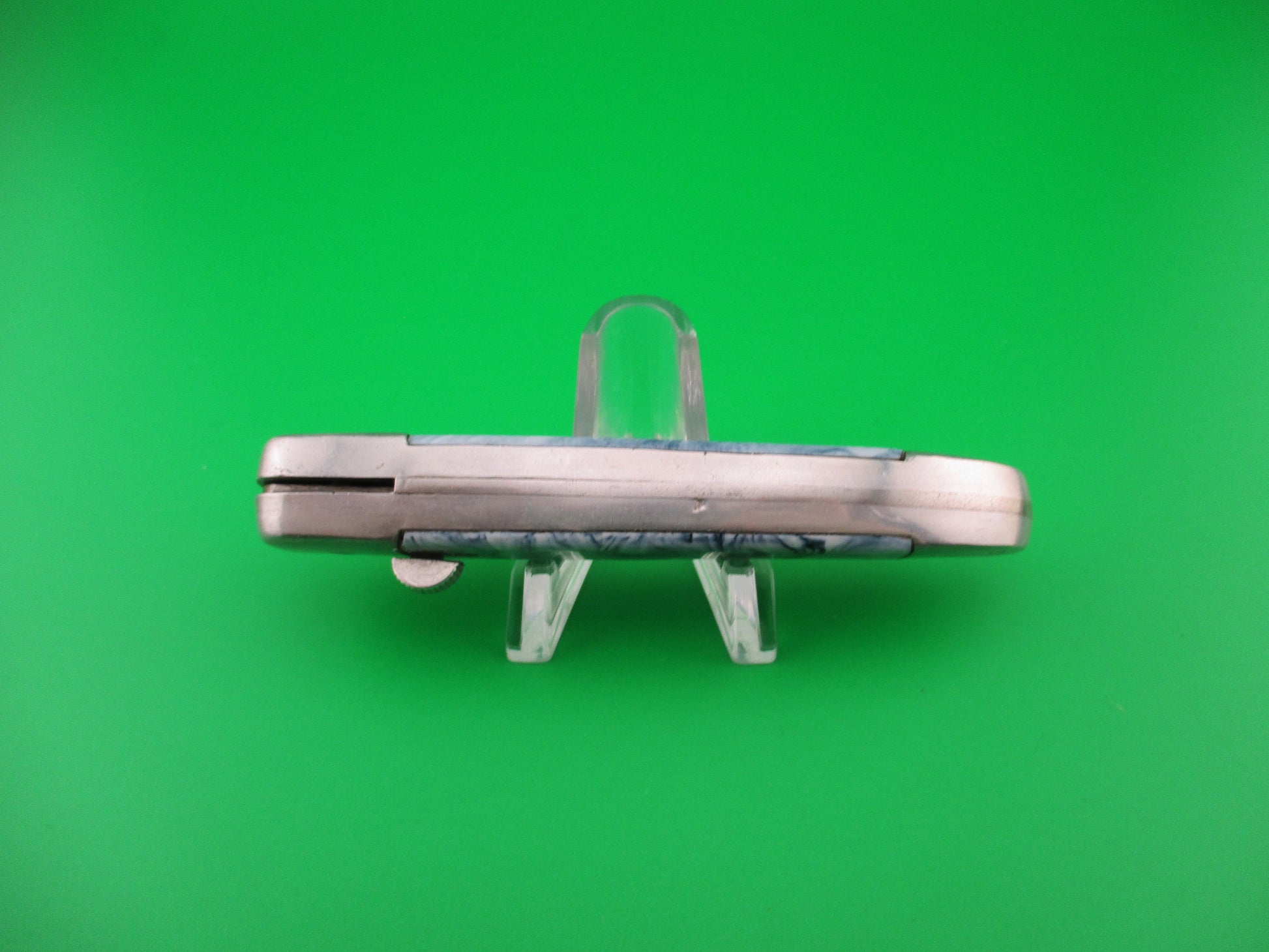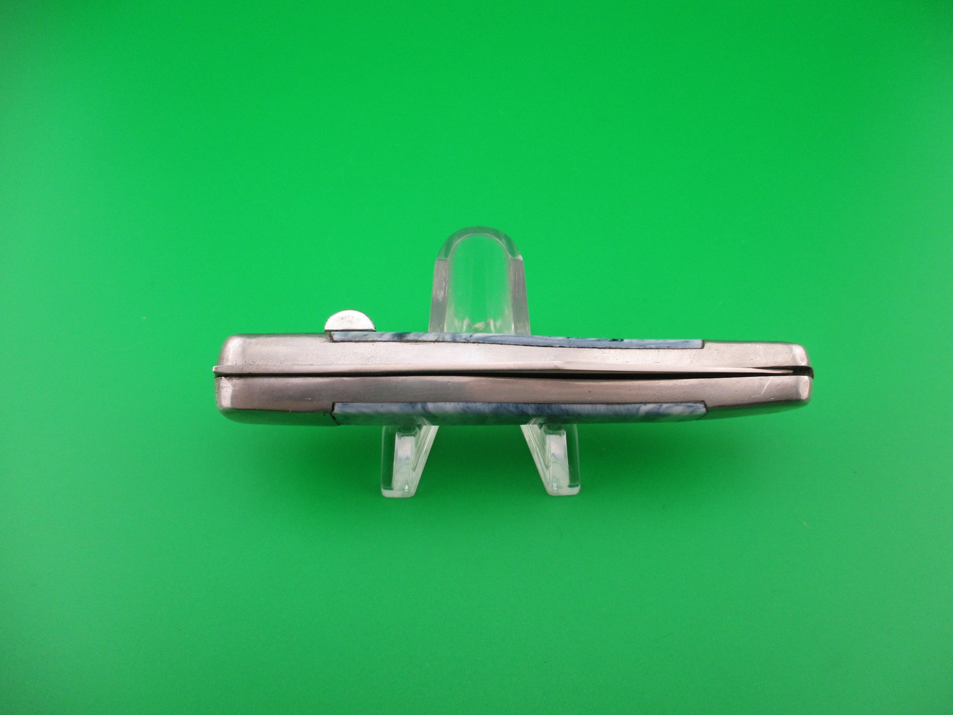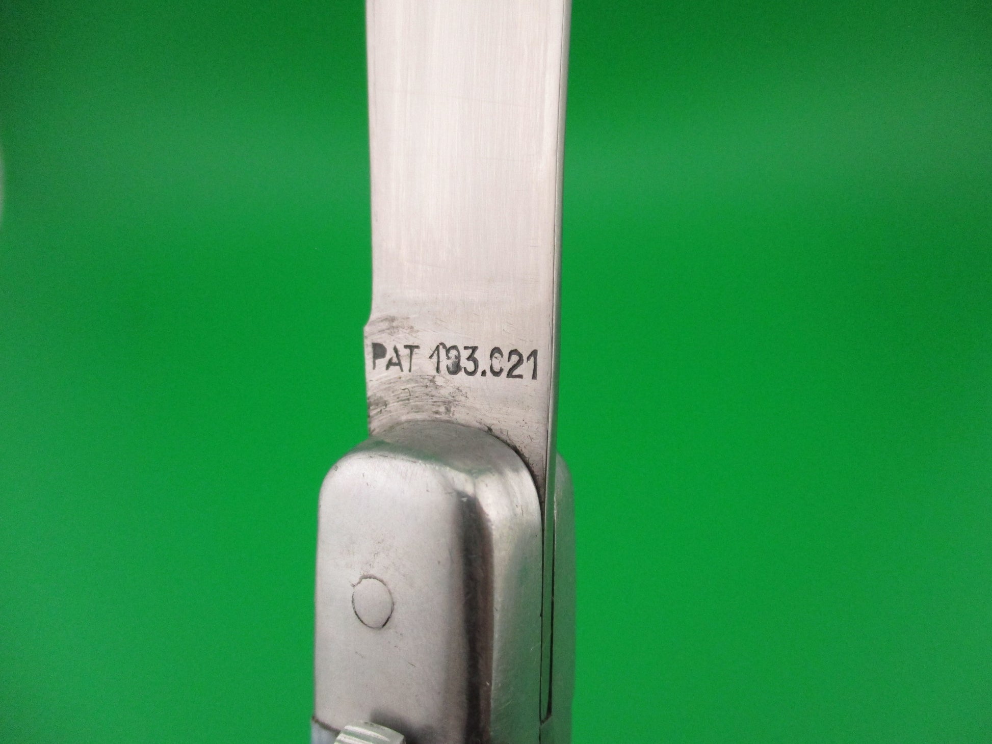 Vintage PAT 193.021 18cm Spanish Aluminum Coilspring automatic knife sliding button with blue/white swirl scales most likely made 1960s or 70s in Spain. The knife measures 17.8cm (7 inches) open and 4 inches closed with aluminum frame. The clip blade is 99% full, or better with most of the original finish with a couple of light scratches and the tang is stamped PAT 193.021. The synthetic blue/white swirl scales are in excellent condition and very attractive. The knife works great with blade tip deep in the well closed, good snap and very good lockup with just a hint of movement at the tip open. EX condition
