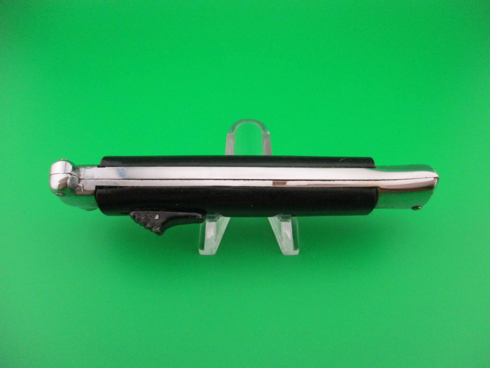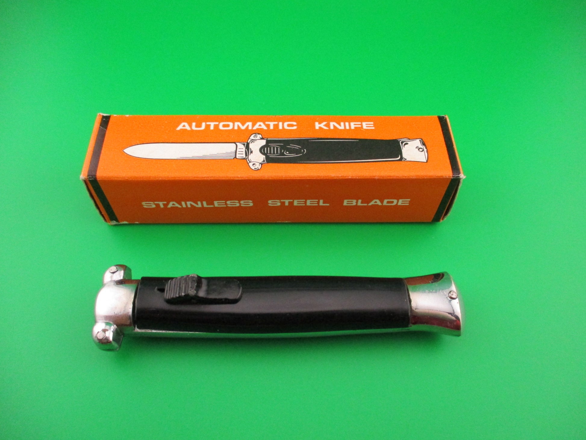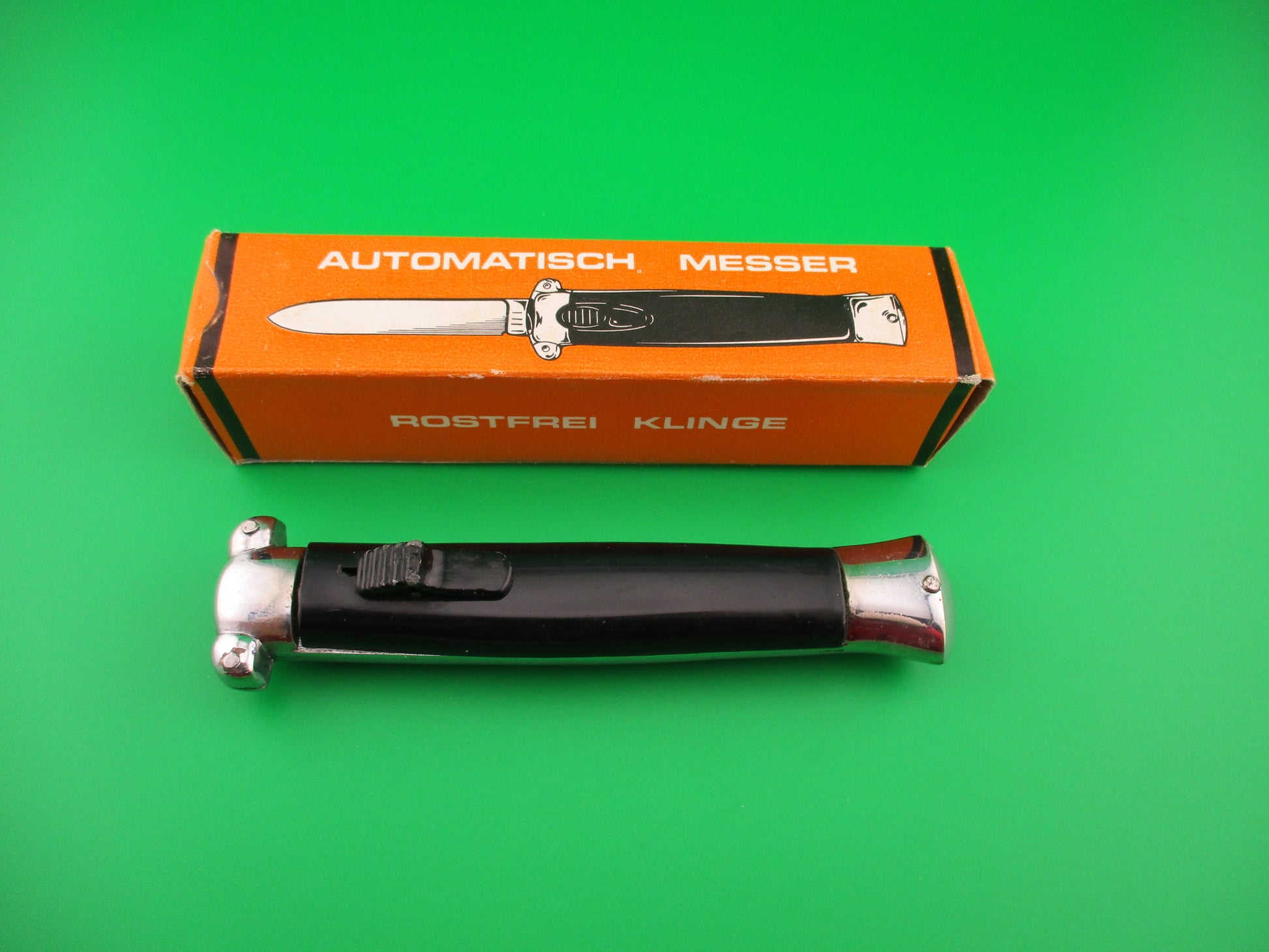 Vintage C JUL HERBERTZ PATENT ROSTFREI 21cm Italian Out The Front Double Action Black metal button automatic most likely made in the 1970s by Rosa Uliana Primo in Italy for German Importer C Jul Herbertz. The knife measures 20.9cm (8 3/16 inches) open and just under 5 inches closed with chrome plated brass frame & bolsters. The flat spear point blade is 100% full with original factory finish and the face of the blade is etched C JUL HERBERTZ LIC 1062146 and the ricasso is stamped PATENT ROSTFREI. The black plastic scales are in very good condition with a few light scuffs from handling. The knife works great with blade deploying fully and locking open when the button is pushed forward and retracts fully into the knife when button is pulled backward. The box is vintage, but not original to this knife, though they likely came in this box, or one very similar. New Old Stock, nearly new condition.