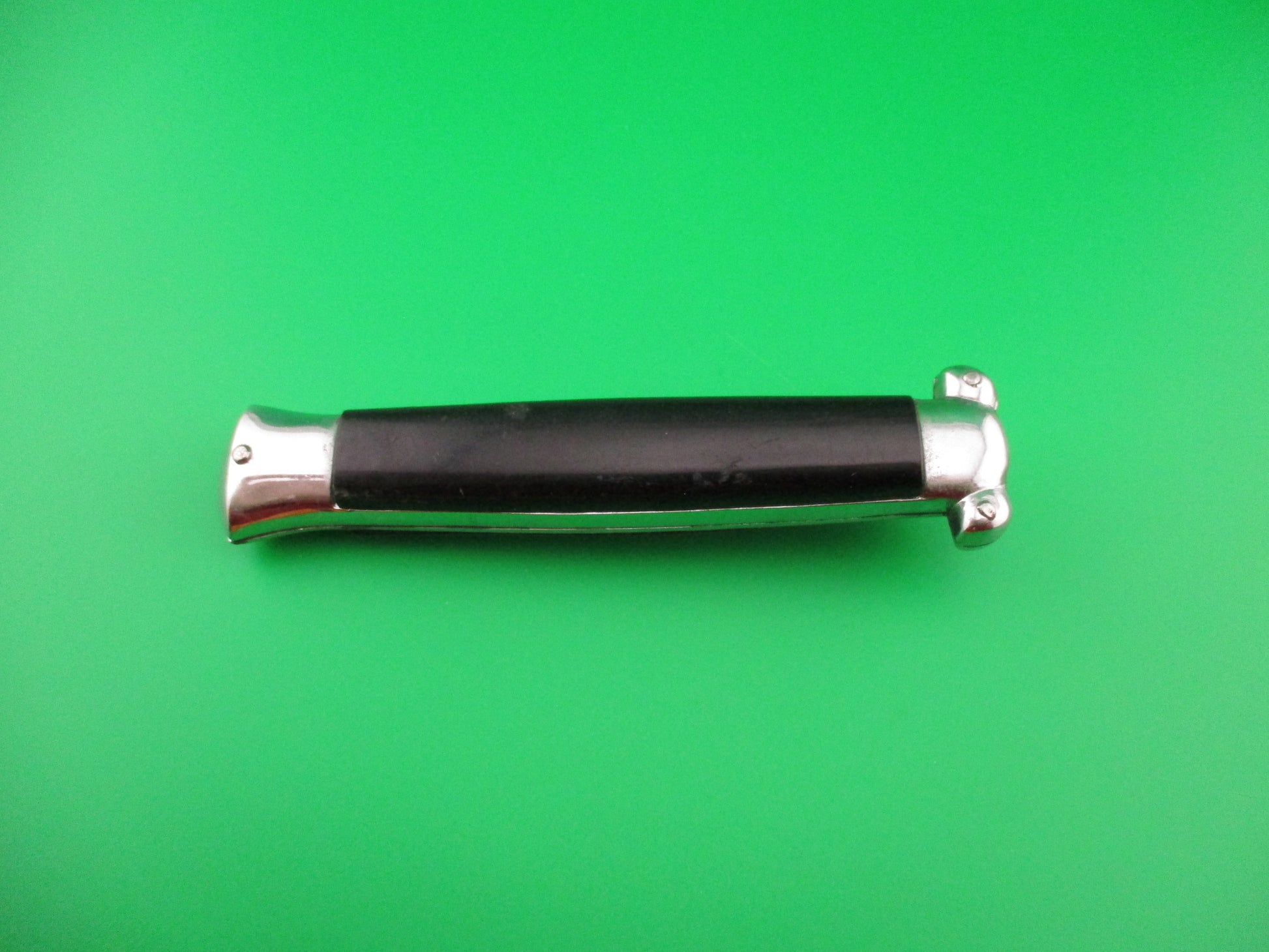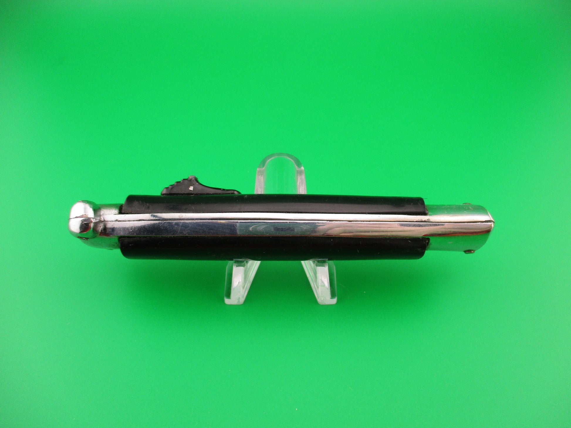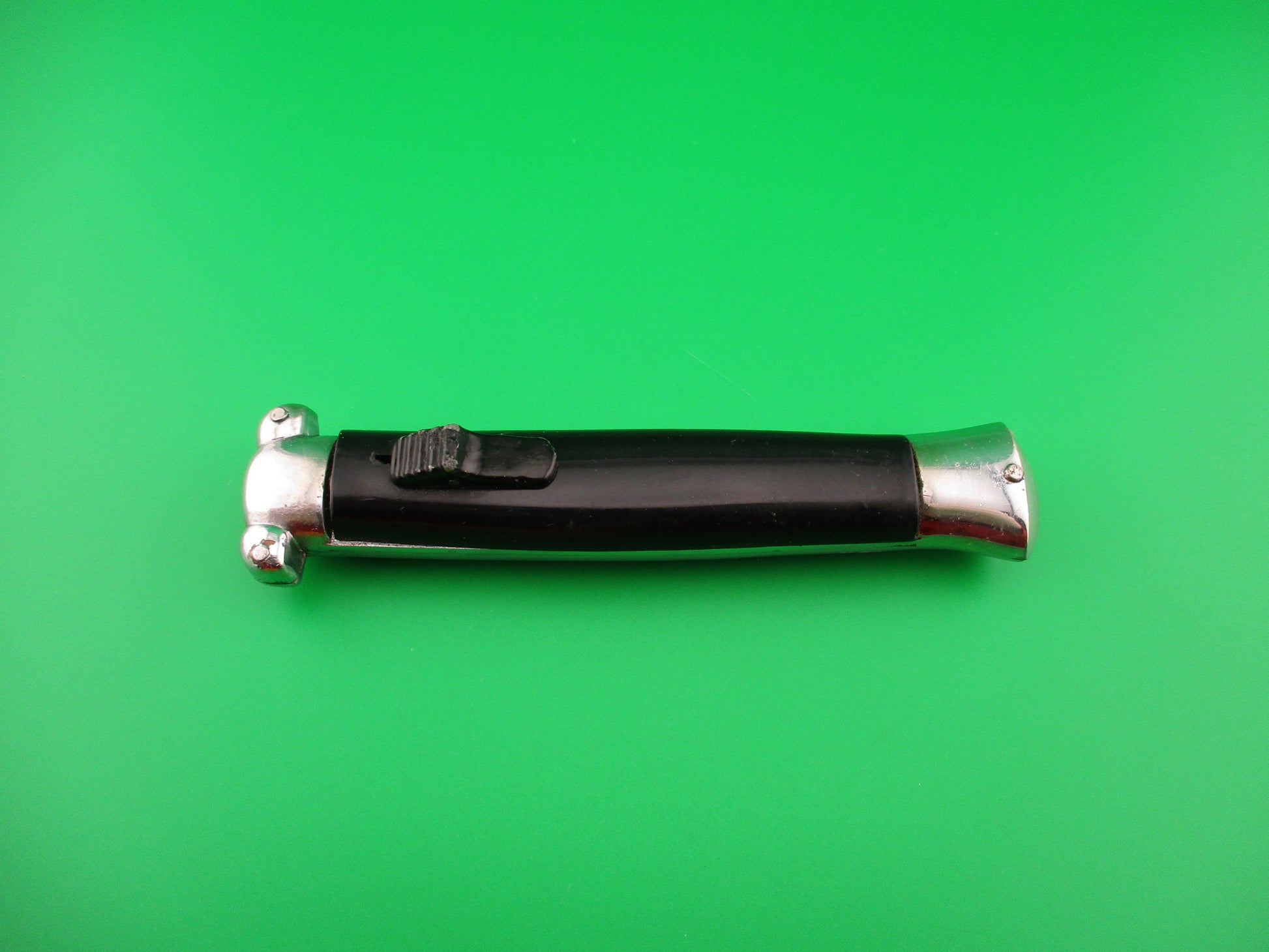 Vintage C JUL HERBERTZ PATENT ROSTFREI 21cm Italian Out The Front Double Action Black metal button automatic most likely made in the 1970s by Rosa Uliana Primo in Italy for German Importer C Jul Herbertz. The knife measures 20.9cm (8 3/16 inches) open and just under 5 inches closed with chrome plated brass frame & bolsters. The flat spear point blade is 100% full with original factory finish and the face of the blade is etched C JUL HERBERTZ LIC 1062146 and the ricasso is stamped PATENT ROSTFREI. The black plastic scales are in very good condition with a few light scuffs from handling. The knife works great with blade deploying fully and locking open when the button is pushed forward and retracts fully into the knife when button is pulled backward. The box is vintage, but not original to this knife, though they likely came in this box, or one very similar. New Old Stock, nearly new condition.